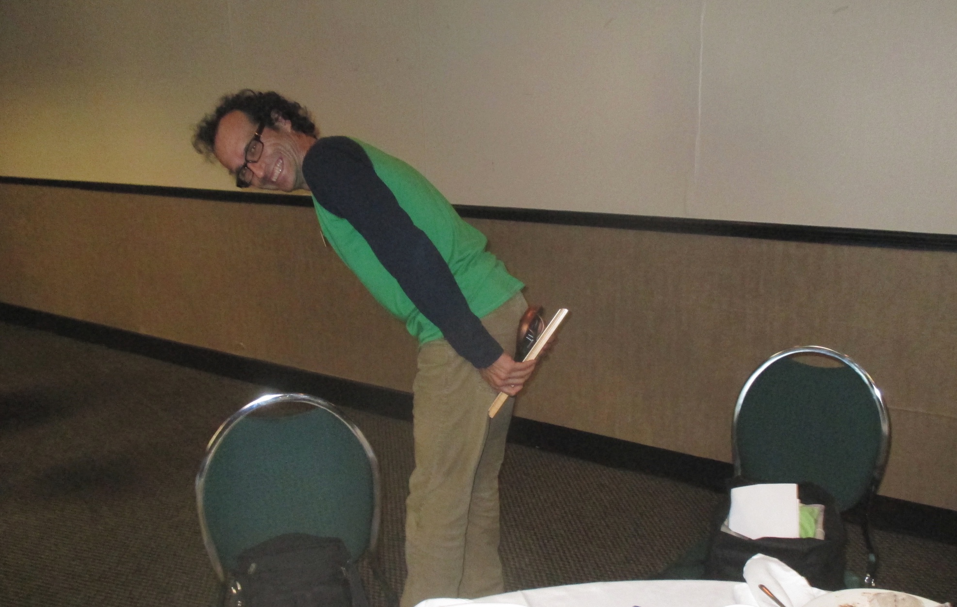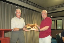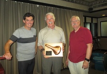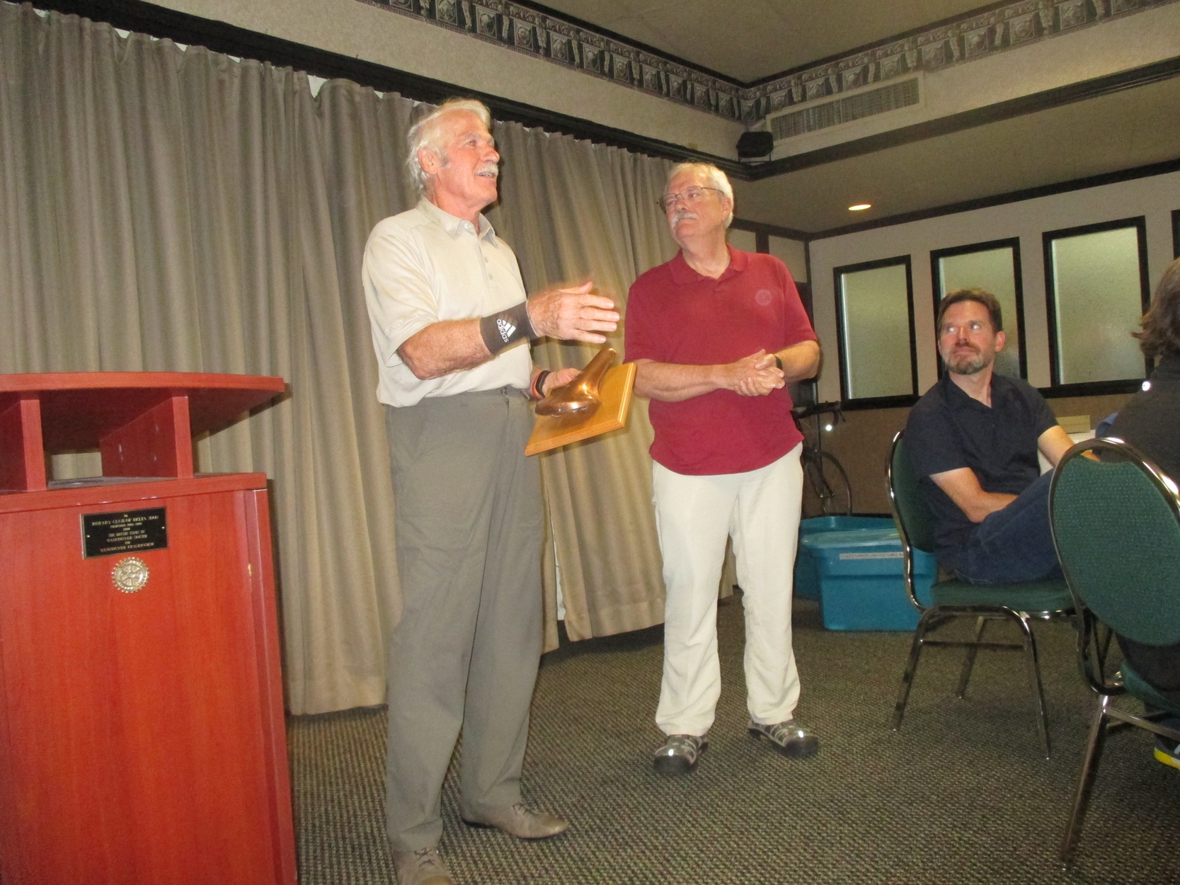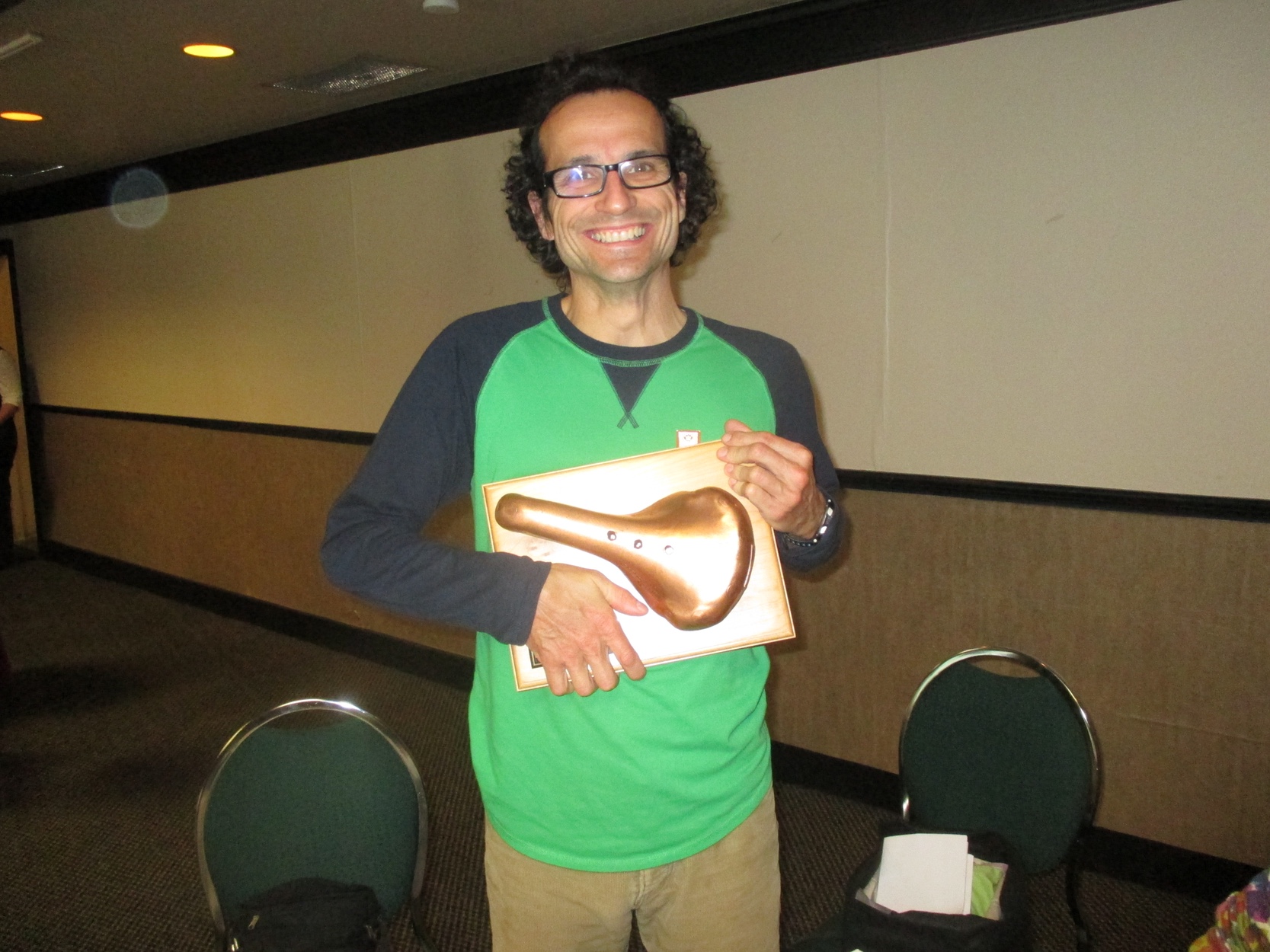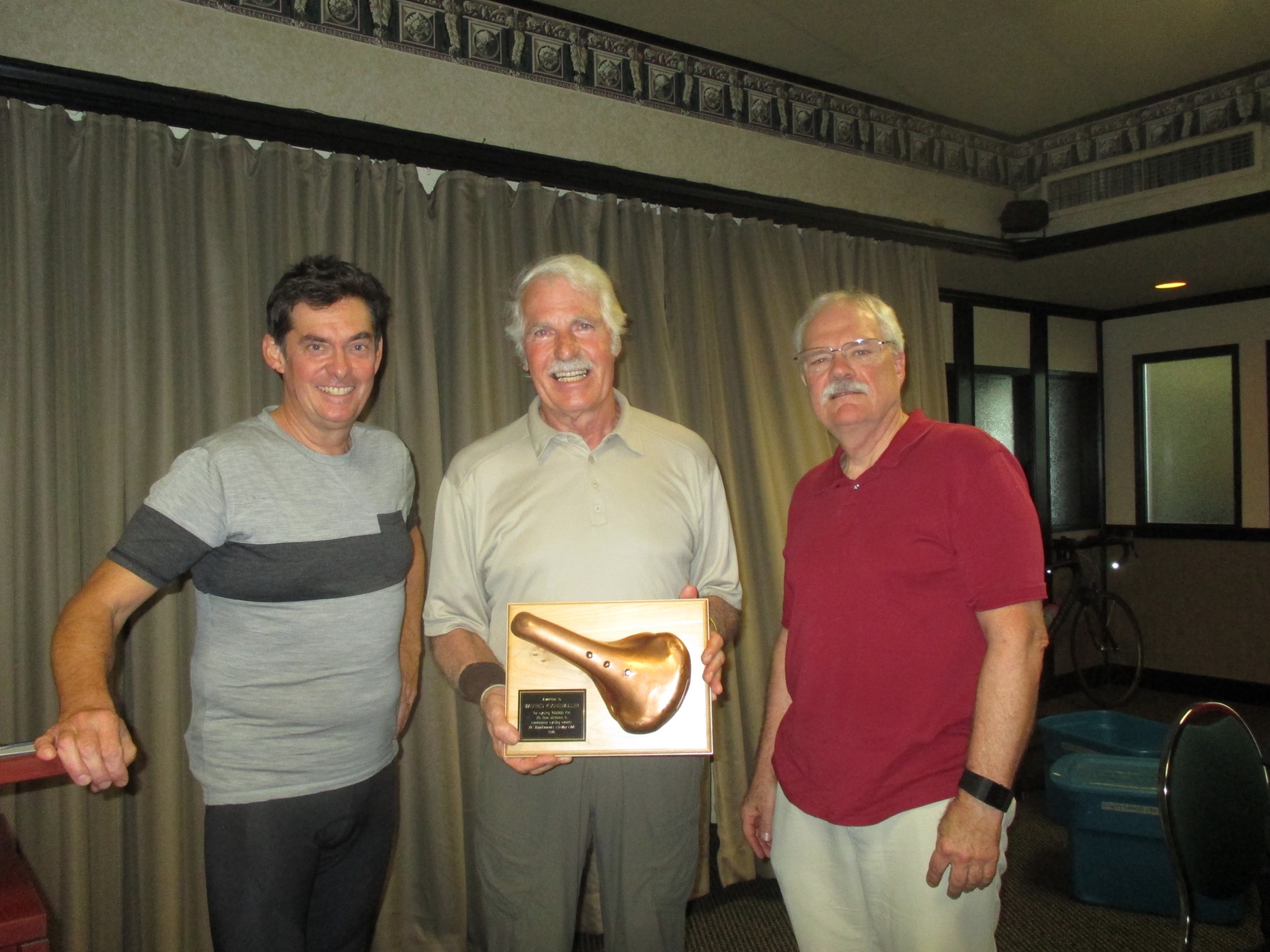 ------ Some bonus historical information: When Ken was about to reach 100,000 kms we were unable to get our hands on a one of Ken's old saddles. Michel offered one of his old, but still beautiful, Brooks saddles, and he spray painted it bronze. He then passed in off to me and I arranged to have the award assembled. It was Ken who had the idea of passing the saddle along (mounted on a new base) each time a new rider reached 100,000.