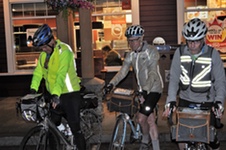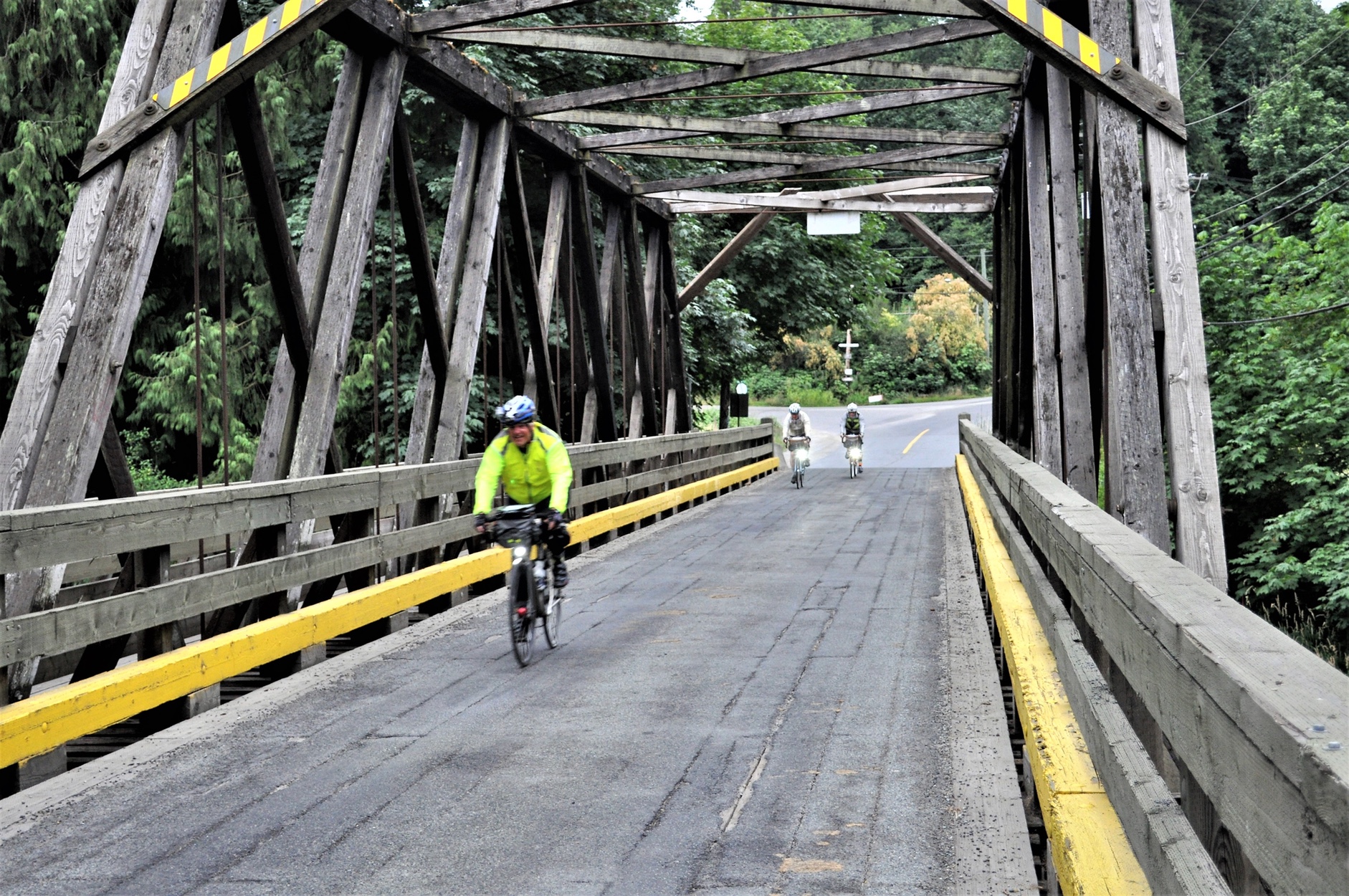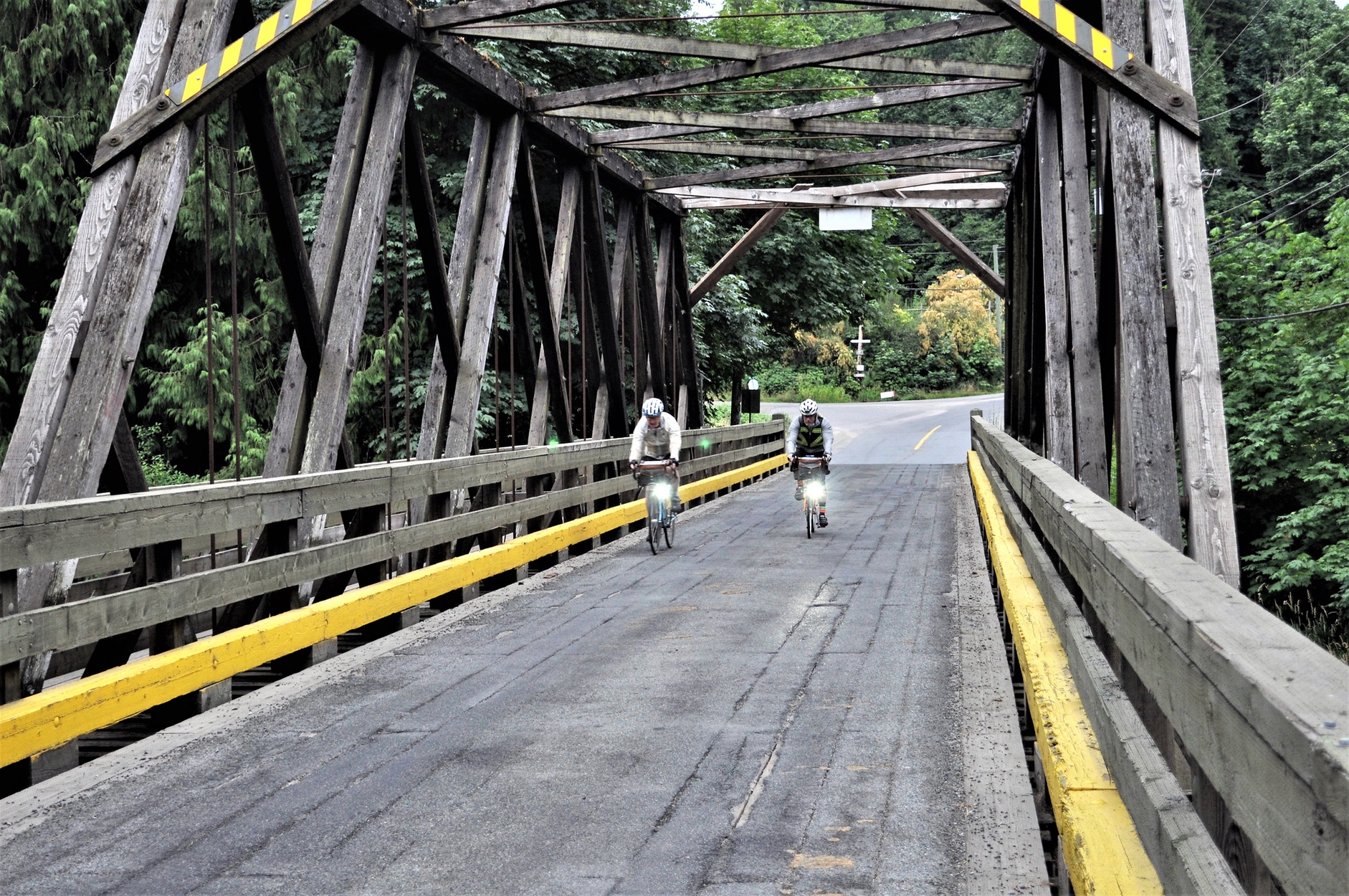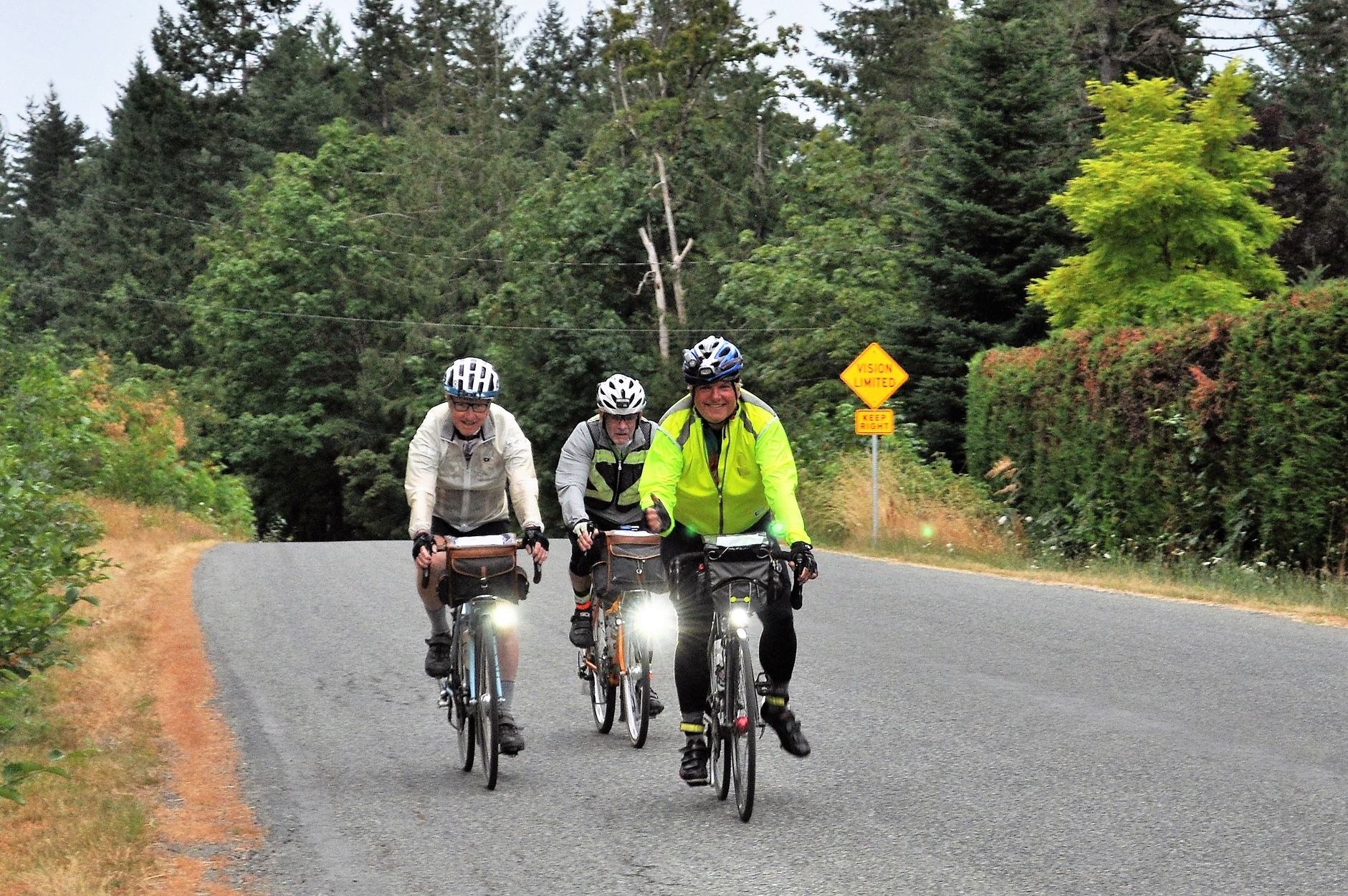 Tour of Bays 400 On ride day, the three ride volunteers and three riders gathered at the Tim Horton's on Deloume Rd in Mill Bay well prior to the event start. Mark Payten, Dave White and Buddy Bhandar took the waivers and went over the pre-event explanations with Barry Chase, David Lach and Gary Baker. Promptly at 0500 the participants were underway. Although the forecast had called for a mix of sun and clouds and highs in the low 20's Celsius, there was a light mist descending from the heavens. Fortunately, the temperature was pleasant and the misting stopped later that morning. Buddy remained at the start in case of any late arrivals. Mark and Dave drove out to the first control for photo opportunities. The four photos above are at the start, by the control on Mountain Rd and crossing the Koksilah River on the road of the identical name. The three riders remained together for the entire ride and completed the event at 0603PDT on July 23rd for a time of 25hrs and 3min. Feedback on the new route indicated that it was a scenic ride on roads less traveled. All three riders also commented there were more than a few hills on this ride.