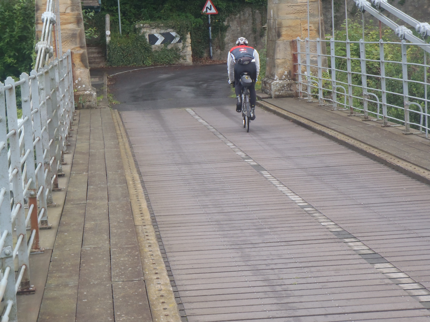 My ride to my 10:15 start was uneventful, and I added no extra distance. I had a second breakfast at the school with the most famous rider there- John Morris, the North Carolina rider in the photo on the LEL brochure with the rainbow. Michael had the same start time, Mark 15 minutes later. Compared to PBP, the start was very calm and relaxed- no lines (sorry, queues), very little fanfare. I started off fairly fast, riding in a group with a couple of riders in Brompton World Championship Jerseys, (not on Bromptons), and a local named Will, who I wound up spending most of the day playing leapfrog with. He would pass me, then stop to fiddle with his floppy bikepacking bag, and the whole process would repeat itself. It made me appreciate my Carradice bag. The first control was at St. Ives, and by the time we got there my average speed was just under 28 kmh. I had a good meal of pasta, and was just leaving as Michael rolled in. He seemed to be having a good ride so far. A few kms later,as we started across the fens, it started to rain, first lightly, then more heavily. Riders were pulling over in large groups to don rain gear, but I took a look at the sky and wind direction and took my chances. Sure enough, six kms later the rain abruptly ended and it was sunny once again. There was one rider stopped putting on a jacket at the base of a small hill, less than a hundred metres from where the rain ended. So much time can be lost this way. I caught a group, and was considering passing them and continuing on, when suddenly the pace picked up, in a big way. Now I was just barely able to hang on to the group, led by a rider who I heard speaking an Eastern European sounding language I couldn't identify. He pulled us for at least 20 kms. I commented to a woman (Helen?) in an Audax Ireland jersey that I was at the edge of my ability and didn't think I'd hold on for long. She said she hadn't ridden that fast since she quit racing, and that we might as well hold on as long as we could and put some time in the bank. She was riding with full panniers, and holding her own as we rocketed on at 35+ kmh. Eventually I dropped off the back, but briefly caught back on when the group had to stop at a railway crossing. After controlling at Louth, it was into the Lincolnshire Wolds- beautiful scenery, quiet, narrow roads, steep hills. On many of the hills, there were sand bins at the side- the more sand bins, the steeper the hill and vise versa. The hills of LEL are either long or steep- never both. Darkness fell and I was starting to get pretty tired, when I suddenly found myself at the Humber Bridge. The excitement of reaching this milestone vanished any traces of fatigue. The engineers responsible for this masterpiece should come to North America and show us how to make a smooth bike lane across a bridge. It was perfect. Shortly before reaching my first sleep stop at Pocklington I felt my rear tyre going flat. Fortunately, I was approaching a large roundabout with a street light on its grassy center. Perfect place to fix it. I couldn't find anything in the tyre, so just put in a tube and continued to the control. My plan was to sleep here if there was a bed, continue to Thirsk if there wasn't. Of 400 available beds, only 200 were in use, so after a meal, a shower and fresh clothes I went to bed- on plan and on schedule. After breakfast I continued north, through the Howardian Hills (massive rollers), through Castle Howard, to Thirsk where I had sent my first drop bag. I swapped out my spare clothes for fresh and enjoyed another great meal. I was surprised to see Ken Bonner here- he had started more than five hours ahead of me. His ride was not going well. He had missed the control by 25 km, and had to backtrack. The added distance had put him at a bit of a time defecit. I figured he would easily make it back though, as the organizers had said they wouldn't disqualify any riders late at intermediate controls, as long as they made it back up by the finish. Not too much further up the road I had my second flat. This time (now with daylight to help me see it) I found a small, sharp, triangular piece of flint. Problem solved. Not. Another flat a few kms later. Down to one spare tube. Somewhere along the line I wound up riding with Eric Larsen. This also surprised me, as he had told me he had a 7:00 AM start, so I hadn't expected to see him. I always enjoy riding with Eric, even though he's a bit stronger than I am. Also in our happy group was a Dutch rider (Jorg? Bjorn?) and another Brit named Dave. Eventually we got separated again- he had a 100 hr limit and needed to go faster than I did. I had a clumsy moment, turning one road too soon, then getting into soft mud at the road edge while making my corrective u-turn and falling on my right knee, hip, and elbow. By the time I got to Barnard Castle, blood from my knee was running into my sock. My elbow was a little less bloody, but my hip had a goose egg and I was concerned it would seize up when I stopped. Susan was off duty when I arrived, and was waiting for me. She patched me up, I ate, bought a couple more spare tubes and continued north. The next landmark of note was Yad Moss- the famous ski hill! I really enjoyed the gentle climb, with beautiful scenery and perfect weather. A long gentle descent led to the famous steep downhill cobblestones of Alston. Halfway down, there was an ice cream truck. How could I not stop? I sat on a bench, watching riders go by on the cobbles as I ate my ice cream, with a local-ish rider who was eating a Belgian cake. He had an extra one that he gave me, so I ate that, too. MMMMM! The organizers had provided two choices from Brampton to Moffat- hilly or flat. I opted for flat, on an easy, quiet road that paralleled a major highway. It was probably the most boring part of the ride, but enabled me to put a bunch more time in the bank. I still got to Moffat later than I had hoped, and by the time I had eaten it was nearly 9:00 pm. The rou