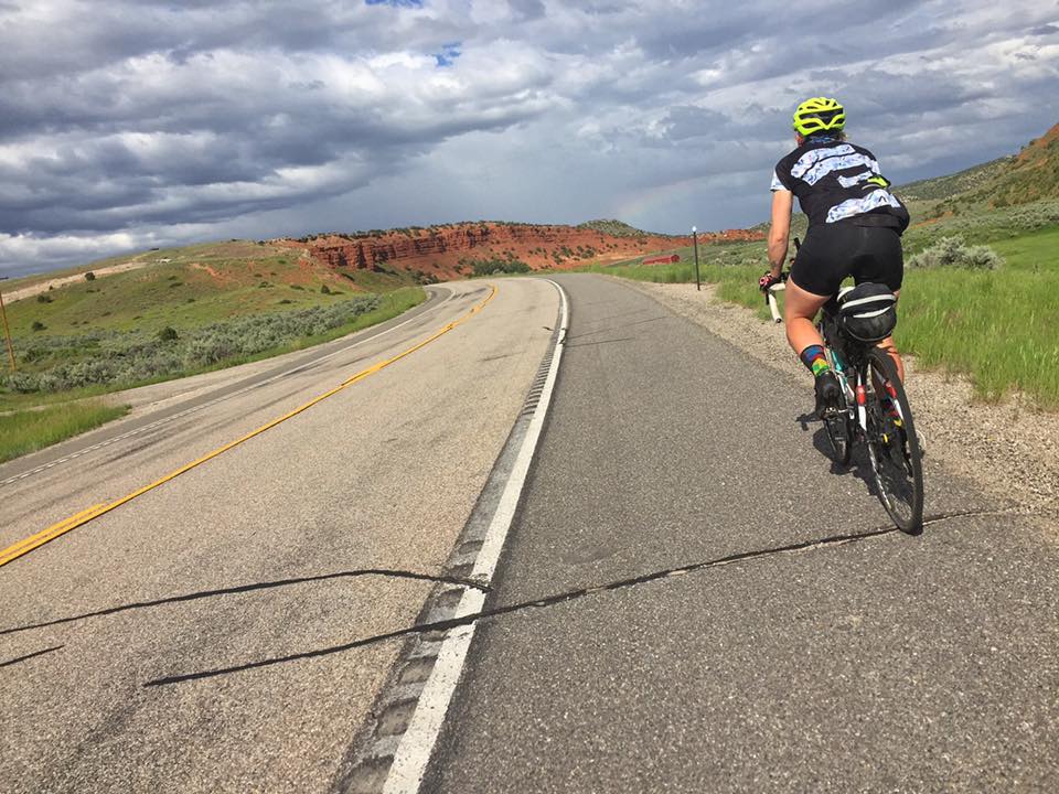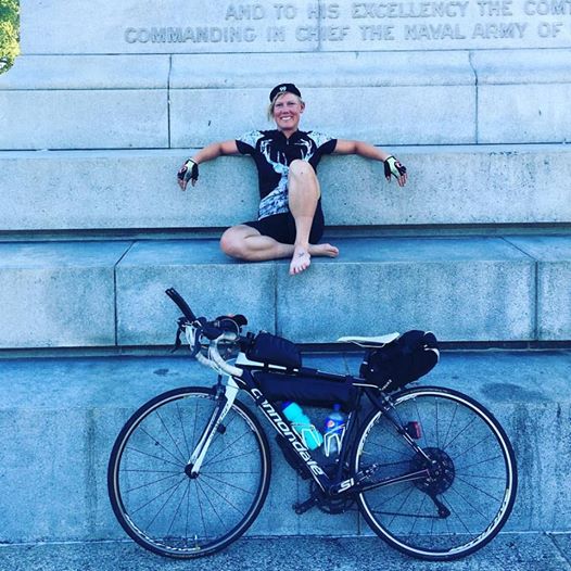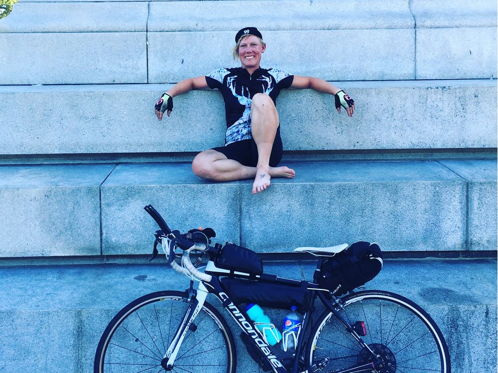 Across America: the Trans Am Bike Race Meaghan Hackinen is a former BC resident currently living in Saskatoon, SK. She rides with the Prairie Randonneurs. How do you put a 6,800-kilometre bike ride into words? It isn't easy. Harder still when the journey itself remains a blur, time spent sleep deprived, half-starved, body committed to cadence and navigating curves at the expense of brainpower. Over a month post-race and I struggle to pin down anything succinctly. It was emotional. Astoria, Oregon: I rolled out alongside 130 other riders in the 4th annual grand depart of the Trans Am Bike Race at 0600 hours on June 3rd, 2017. I'd been dreaming/dreading this day since receiving my registration confirmation in December, the same day I went out and purchased frame bags and a one-way ticket to Portland. Now, the morning had arrived. Decked out in a highlighter-yellow rain jacket and matching helmet (purchased on arrival to replace my own helmet that had been forgotten in pre-flight packing haste) I raised a plastic goblet of champagne poured by race vet and legendary lanterne rouge Thomas Camero to cheers to my fellow competitors. Race organizer Nathan Jones reiterated final reminders and advice - "Remember: rubber-side down" - before we counted down to the start clock. The first five miles until the bridge everyone rides together. After that, you're on your own. The Trans Am Bike Race is a 6,800 kilometre self-supported road race taking riders from coast to coast along the American Cycling Association's oldest bike route: the TransAmerica Trail. Racers cross ten states with wildly diverse terrain, from the West Coast to the Rocky Mountains, Great Plains, Ozarks and Appalachians—with the winners finishing in 17 or 18 days. Similar to the spirit of randonneuring, racers are self-sufficient and responsible for the procurement of nourishment, accommodations, and bike maintenance. Unlike randonneuring, drafting is not permissible (unless you register as a pair) and there are no controls: you start in Astoria, Oregon, finish at Yorktown Monument in Virginia, and rely on the thin red line of a GPS as your guide across the country. Racers can only access unilateral support available to other competitors (hotels, restaurants, campgrounds, etc.) but may accept unsolicited assistance from trail angels and kind-hearted strangers. As well, racers are equipped with trackers and that display their positions online for friends, competitors, and dot watchers to follow. So I rode. I rode my bike every day for 24 days and 22 hours. I rode at all hours, slept around four hours each night, and snagged catnaps in shady corners during sweltering afternoons. I devoured microwave breakfast sandwiches and bags of sugar-coated candy at gas stations, clubhouses at small-town diners, and midnight breakfasts at McDonalds' drive-thrus. I slept on picnic tables and in city parks and motels where staff would leave a key under the doormat for after-hours check-in. I wore the same pair of kit every single day and washed it in the shower. I biked in rain and sleet and snow and wheat-dust clouds in Kansas. I laughed more than I cried and didn't take enough photos. I wish I could tell you the story of an intrepid female cyclist who conquered the road alone, but that wouldn't be true. Climbing out of White Bird in Idaho on the morning of day five I met another racer, a guy named Matthias from Germany with razor-sharp tan lines and a quiet determination. I didn't expect to keep riding with Matthias, it just worked out that way. "I only find you slightly annoying," he said to me, somewhere in Wyoming. Matthias and I teamed up with other racers a few times, once for a stretch with a rider from Switzerland named Rolf when the weather turned on us outside of Yellowstone Park. Faced with formidable headwinds, the three of us called it a day in the early afternoon and grabbed the last room at a motel in Ennis. We crammed down pizza and pints of beer while waiting for our clothes to dry at the neighbouring laundromat, hit the hay by 6:00 pm, then set out again before midnight to reach West Yellowstone in time for breakfast. During the second half of the race my own sluggishness and inability to cover as much distance as anticipated became major sources of frustration. I watched my speed drop day by day until it dwindled below 20 kilometres an hour, at which point I nudged the magnet of my computer out of place so that I wouldn't see my snail's pace in numerical form—it was depressing. Once a gas station attendant in Eastern Colorado asked if we'd been getting passed by a lot of racers; I didn't have it in me to clarify that we were racers. Hours in the saddle took a toll on my body and lack of sleep, combined with a nutrient-poor diet, made recovery near impossible. I was losing finger strength from nerve damage in my left hand and could no longer manage more than a few minutes without adjusting my saddle position. By day five, when I met Matthias, my right Achilles had begun to show signs of inflammation. I immediately lowered my seat and adjusted the cleat placement, but spent the remainder of the race bouncing between happy Achilles (low seat) and happy knees (high seat). By the time I hit the rolling hills of Virginia, I'd carved a morning routine that included a copious application of chamois cream, KT-tape to immobilize my swollen Achilles, and vitamin-A (Advil) washed down with a 5-hour energy drink. >Yet while my body appeared to be disintegrating before my eyes, the sinew that held everything together remained strong. I came to exist in a state of fatigued awe, startled yet amazed by my own existence and the prospect of another consecutive near-300-kilometre day in the saddle. There was no longer any doubt in my mind that I was actually doing this, wheels tracking east as each pedal stroke brought me closer to the Atlantic. Near Leoti, Kansas, a fellow racer named Eric Fishbein was struck and killed by a motor vehicle. Eric 