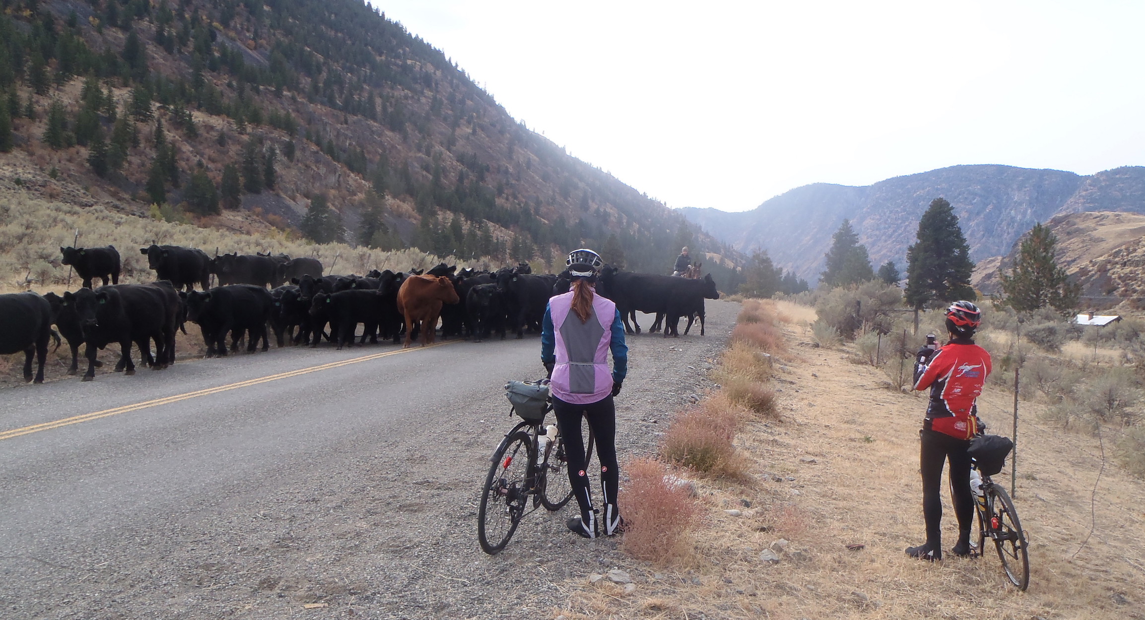 Hardly a Ramble 2 1/2 (permanent) I'm working towards my BC 12 again, this time attempting to do it entirely in the Interior. Problem A- I'm bored with most of the routes close to me. Problem B- I'm finding I really don't enjoy riding by myself as much as I used to. Problem C- I want to come up with something interesting for the 2018 Interior Spring 200. To solve all these problems at once, I decided to make my October permanent an improved version of Doug Fox's Hardly a Ramble 2, and invited Doug, as well as Susan DeBolt, and Jacquetta Benard to join me. Doug declined, but (possibly because they haven't known me as long), Susan and Jacquetta opted in. It was somewhere around 4C, cloudy and windy when we rolled out of the Tims in Penticton at 07:00. There was a nasty cold wind blowing off Skaha, but the whitecaps were impressive. "Tumbleweed!" is not a warning I'd ever shouted on a group ride before, but there's a first time for everything. Most of the climbing on this route is in the first 25 km or so, and we warmed up quickly on the way up to Yellow Lake. We warmed up- the temperature, however, dropped to -2. We got pretty chilled on the descent to the first control in Keremeos. It was obviously snowing on the mountains to the north and west of town, and I'm sure I saw one flake flutter down. There were some sprinkles going, making beautiful? ice sculptures on the plants and fences. What were we thinking? Fortunately, at that point we turned South and the temperature slowly started to climb. The wind had been gone since the summit, and we warmed up again- those rollers will do that. We crossed the border at Nighthawk without incident, despite my previous history there, and continued down through rangeland with brilliant fall colours - sorry, colors, I forgot we had crossed the border. There was a 15 to 20 minute delay as we had to wait for a cattle drive, another first for this ride. We continued on, down a really shitty road. Actually, the road was great, just covered in cowshit. Still no wind as we rode along Palmer Lake, stopping at Loomis for a snack and bathroom break. One thing that was a little unsettling was the large number of camo-clad hunters on the roads with ATVs, and frequent sounds of gunfire. As we continued to the next control in Ellisford, the temperature soared to 12C, and a strong wind developed- from the south! YAHOO! Cruising effortlessly north with the tailwind, we crossed back into Canada. Just before we turned off Highway 97 onto Road 22 and Black Sage, Jacquetta flatted, but we were on our way again pretty quickly. Yes, I know that Black Sage adds a bunch of climbing over staying on the highway, but it is sooo worth it. And yes, there WILL be an information control there for the brevet. The tailwind continued to push us along the east side of Skaha, and we rolled into the Tims in Penticton feeling great. Note- We decided unanimously that , considering scenery, terrain, traffic, and road conditions, this is the BEST 200 route in the Interior. Mark your calendar for April 21. It's a little further to travel, but it's worth it. Disclaimer- the organizer makes no guarantee of tailwinds for any portion of the ride.