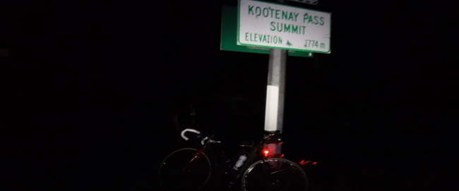 I rode by myself and took pictures at the top of Rainy Pass and Washington Pass, flying down the wide switchback below Washington Pass and remembering having to go the other way on last year's Cascade 1200. I stopped for a hot dog in Winthrop and continued to Twisp, where the long climb up Loup Loup Pass begins. The organizers had water about five km from the top of the pass, and it was starting to get dark, so I put on the rain jacket and zipped it all the way up in anticipation of a cold descent to Okanogan. Although only five kilometers, the remainder of the climb took about a half hour at 10 kmh. It was biting cold at the top, but there was enough light for a photo before the descent. ![]() Winthrop, WA ![]() 5 km from Loup Loup summit Now that we were across the Cascades and into central Washington, it actually got warmer the further down I rode. At Omak I stopped for more solid food, as this seems to work far better for me than "sports nutrition." The energy bars and gels become less and less interesting the more I eat them. I used to like Honey Stinger Waffles, but now I don't care as much for them. I would become ill if I were to even see a container of Ensure. The first day of riding ended in Osoyoos at around 12:40 am for me, which seems long, but fits into my personal rule of thumb for ETA: Figure on a 25 kmh average speed, but add one hour for every 1000 meters of climbing. We rode 380 km and climbed 3000 meters, so that's a little over 15 hours plus another 3 hours for the climbing. We started at 6 am, so should finish at around 12:40, provided we don't take either long stops or many short stops. So far, so good, but after dinner and a shower, I didn't get into bed until after 2 am, and I was up at around 5. Not good, and my rule of thumb breaks down completely when I become too tired. Day 2 was the heavy-lifting portion of the journey. Right out of Osoyoos, we started the long climb of Anarchist Mountain. The climb doesn't end where it flattens at the top of the mountain outside Osoyoos. It's flat for a ways, then it climbs more. And this repeats a few times. I felt really tired on the climb, so I watched Jan and Bob disappear up ahead. Finally, about 30 km from the start, you see the Anarchist Summit sign. This is followed by a fast descent and another climb to Eholt Summit. There is a flat section around Grand Forks, where I| stopped at a Subway for lunch without seeing any of the other riders, and then the road climbs and climbs to Bonanza Pass (signed as Paulson Pass) before descending to Castlegar. From Castlegar, I couldn't believe there was still another climb before you got to Salmo, and all of these climbs were well above 1,000 meters. The climb before Salmo is called Bombi Summit, and it just keeps going up and up. By the time I reached the top, it was dark, and I was getting very tired. I rolled down the fast descent, and the closer I got to Salmo, the more I decided I'd had enough. It would be 10 pm by the time I reached Salmo, and I still had the 1700-meter Kootenay Pass to go over, the highest pass on the journey. I had a motel reservation for the next night in Whitefish, and a train ticket to Seattle for the day after, so I just needed to get some sleep in Salmo, and head directly to Whitefish the next day by a route that involved minimal climbing. This would mean crossing back into Washington, getting to Sandpoint, ID, then going north to join back with the official route north of Bonner's Ferry. I casually rolled into Salmo about five minutes before the Subway closed. After a small dinner, I went looking for a motel. The first two were full, so I rode another 2 km to the last remaining motel, which I remembered as having a Vacancy sign lit. But when I got there, the sign on the darkened office door said that the office was closed and the manager would be back at 6:30! I pulled out my phone and I called John to advise him of my plan. He told me to stay put, as he had another volunteer making sure we were all safe on the roads. Very shortly, Pat Leahy pulled up in the motel parking lot in his well-stocked Subaru. "I think I've had enough. I'm pulling out. I won't make Creston until past 3 am, it'll be a heck of a cold descent, and I'm not having any fun out here." "Well, that would be silly," he replied. "You're currently the third rider on the road. I just went past four riders who are behind you. They should be passing here shortly, so you'll have people to ride with. Besides, I've got some warm clothes in the car you can use. Would you like some hot soup and coffee?" With that, Pat fired up the gas stove and boiled up enough water for a cup-a-noodles and a cup of coffee. This was enough to get me going. I wrapped a large towel around my neck like a scarf, and I set off after Jan, Bob, and Thai, who had stopped but had decided they wanted to keep moving. I caught them as they were stopped at a rest area, and we started the climb of Kootenay Pass together. About 10 km from the summit, Pat was there with hot tea and noodles. By now, I was getting really tired, so I let the other three continue while I crawled up the climb. Kuan caught us, and he passed me as I walked up one section of the climb. The summit took forever to reach, and by then everyone had disappeared.