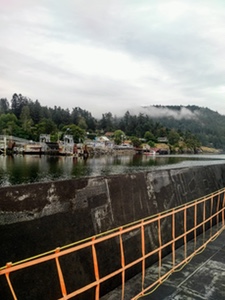 The first stop is the entry to the campground at Ruckle Park. This is the first out and back portion on the island. The pavement is great until one arrives at the entry to the park. At this point pot holes appear in places on the pavement least expected. The last 50 metres or to the turnaround/information control are extremely rough. Caution is advised! Returning from Ruckle Park one stays on less travelled roads in good condition until entering the Fulford-Ganges Rd close to Ganges. Thankfully it is a good descent into town and cyclists can usually move over from the rough edges of the road. It is market day in Ganges. The centre is filled with motorists looking for parking spaces and pedestrians headed to the market. Walker's Hook Rd is off the route this year as the slumping has finally taken away whole portions of the road. It is barricaded in some spots and local access in other. This means the steep descent and ascent on Robinson Road is unavailable to us this year. Instead we get to see a little of the centre of the island. After navigating the north island and doing another out and back to Long Harbour and beyond you pass through Ganges again and climb the hill that was much enjoyed when descending. Again caution is advised. The shoulders where they exist have not been cleared. In some spots the shoulder is non-existent.