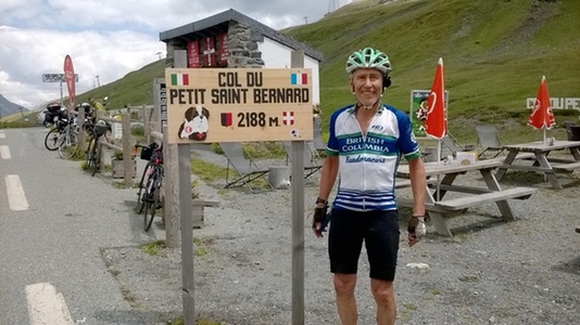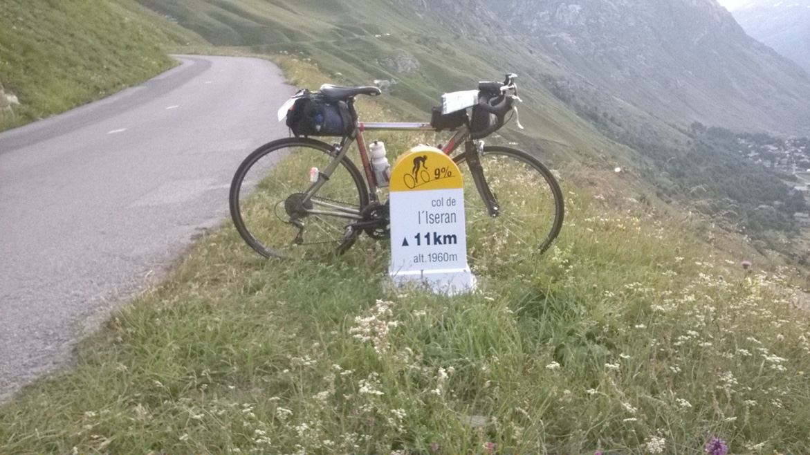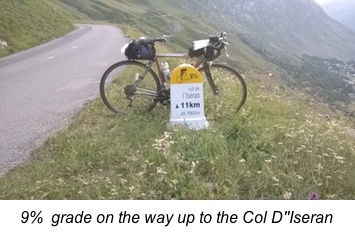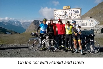 I got going about 04.00 for the ascent of the Col d'Iseran. After 20 kms of gentle uphill, the serious climbing began: 13 kms with some 10% sections. Dave and Hamid came by, and I topped out with Hamid marveling at the spectacular views.Then a speedy descent for breakfast at Val d'Isere. Stage 8 was a challenge as well. The Garmin course for this 150 km leg had errors and wouldn't load properly, there was tricky navigation along endless cycle paths, and then a thunderstorm with heavy rain.