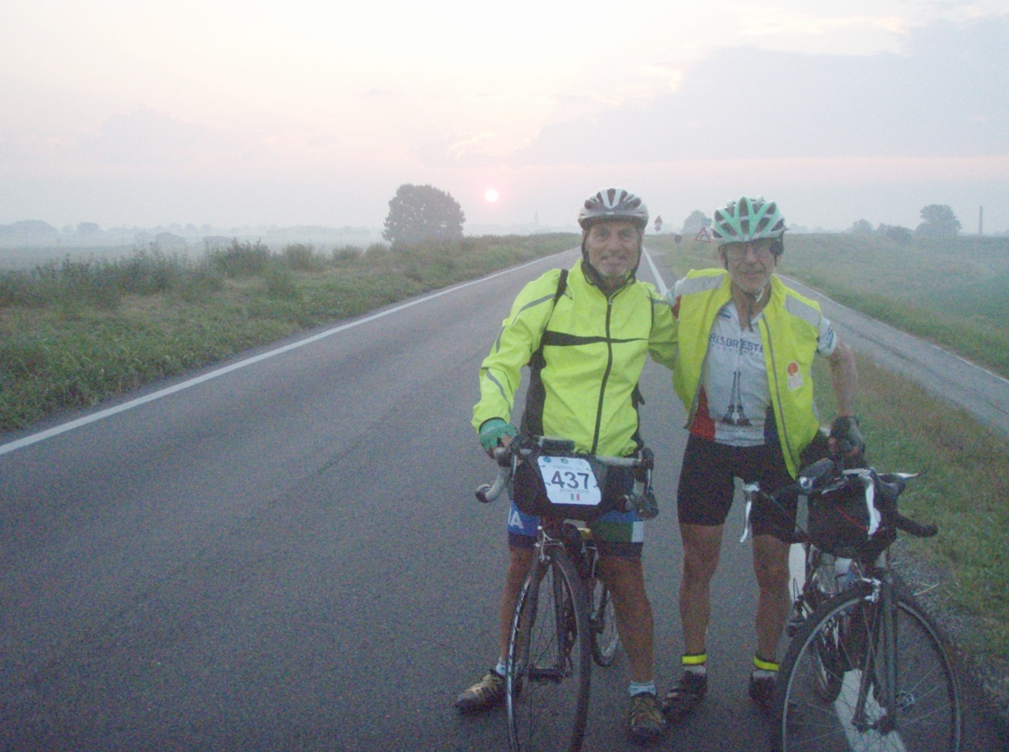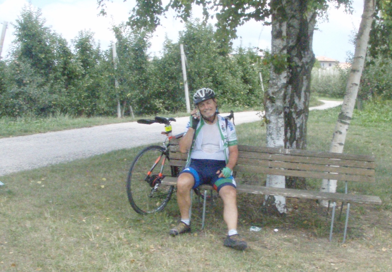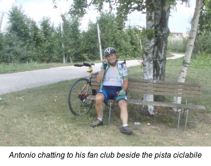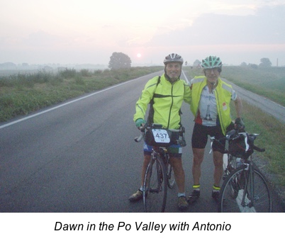 Day 4 Wednesday 7/25 Relief, the Garmin was working again, and the leg was flattish as we were down in the Po Valley, but before long it began to get hotter and hotter . We went through Candelo, one of the best preserved medieval villages in Italy. By 10.00 the temperature was up to forty degrees. Luckily I found a little towel and a sock on the roadside, and whenever I went through a village with a fountain, I cooled my head in the fountain and draped the wet towel around my neck. I would go to a bar and buy 2 cold drink cans to put in my back pockets, and then drink them when the cans lost their refrigeration effect. Luckily I had no problem in persuading bar staff to give me as much ice as I wanted for the ice sock down my back. After a brief stop I took off on another flat leg on my own and moved steadily until it got dark. The organizers of the ride were trying to show us all the sights, so they had us going through the centre of Cremona, a biggish town, on the cycle paths. At this time I was with a German guy who I would bump into periodically. He didn't have a GPS and when he couldn't figure out the paper route sheet, he would wait for someone to come by to ensure he was on the right route. We had crossed a big cobbled city square, and I was consulting the Garmin to see where the cycle path might continue, when we heard a cheery Italian voice telling us that we should follow him. And so I met Antonio, a veteran randonneur from Milan. He won the award for completing the highest cumulative distance in Italian Audax events during 2014. Antonio's English was better than my Italian, and we could chat away to our heart's content. After 4 days on the road alone, it was good to have some company. In addition, Antonio had GPX maps of the route on his Samsung phone with the ride track marked, so with the addition of my Garmin, we had a bit more navigational certainty. We stopped at the next control for something to eat and continued on small roads through the countryside. A highlight was going through an ancient village, brightly illuminated, with not a soul around. We were getting tired, and eventually decided to sleep for a few hours in the entranceway to an apartment block in a little town. At 05.00 as we were folding up our space blankets, a resident emerged, and began berating us for having slept there. In typical Italian style soon a heated discussion ensued. Antonio tried to explain that we were part of an international cycling event, pointing to the Canadian flag on the number affixed my bike, but he was getting nowhere. As the atmosphere got hotter and hotter, I stepped between them and suggested to Antonio that we get going pronto! Once underway, we both laughed about the angry resident and agreed that this was a first in our randonneur careers. Antonio told everyone we met later that day about our early morning encounter. We arrived at the control at 07.10 for a welcome breakfast.