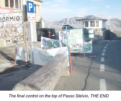 We started off on some high traffic roads then ended up on paved cycle paths linking various villages. But fatigue was setting in, our drink breaks and rest stops were becoming longer. When we hit the final 13 km climb on a main road up to the Passo Palade we were only going at 8 - 9 kph. After a steep 20 km descent we ended up on a paved cycle path for 38 kms to the control. The path sloped uphill at a relatively gentle gradient, making it difficult to move fast, and we became acutely aware that our goal of a 140 hour finish might be slipping away from us. About 10 kms from the control a big thunderstorm opened up, and it poured heavily. We spent about 15 minutes under a shelter until it eased a little. Feeling somewhat damp we reached the Silandro (Lake Bruggs) control at a lodge in the middle of nowhere at 21.00. We wolfed down some pasta, and debated our course of action. We had only 36 kms to go to the top of the Stelvio pass (from 561 m where we were, to 2,757 m) and figured that we still had a chance of making it by the BRM control close time of Saturday 03.00 (140 hours) The Italian BRI control close time was Saturday at 21.00 (158 hours) We discussed the idea of having a nice snooze at the control and riding the pass early the next morning so we could enjoy the views, but we agreed that we were so close that we should try. If we didn't make the BRM deadline, at least Audax Italia would recognize us as official finishers. Luckily the rain had stopped, and about 22.30 a group of four of us set off into the dark on the slushy cyclepath. Chen Chen (Taiwan), Joseph Llona (Seattle), Antonio and myself. When we got to Prato allo Stelvio, Chen and Joseph slowly disappeared up the road. I soldiered on slowly, riding and then taking a few walking breaks as fatigue wore me down and the altitude got to me. But it wasn't raining, a full moon was shining through the clouds, and I was warm enough. Apart from one crazy driver gunning up the hairpins in a sports car, there was no traffic, and it was in fact a magical night. Just the Stelvio and me. At hairpin #18 I came upon Chen passed out at the side of the road. He was lying dangerously close to the road, and I worried what might happen if another crazy driver came by. Decision time for me. Ride on by, or try to help? I decided to try and help Chen get to the top. Even though Chen couldn't speak a word of English, we had bumped into him quite a bit in the last few days and exchanged a nod and a smile. Antonio and I had spent some time helping him to unjam a stubborn zipper on his raincoat before we had set off earlier in the evening. I managed to get Chen to his feet, and we walked slowly upwards. At hairpin #11 he conked out and refused to move any more. So I made sure he was safely off the road and carried on to the top to tell the staff at the control that they should send someone down to him to make sure he was ok. Surreal things were happening that night. At hairpin #8 I was really surprised to see a cyclist slowly descending. He was Italian, and told me that there was no one at the top. He could not find the control. He was heading down to find a place to sleep at a hotel 7 kms down the road. This seemed really strange to me, but I continued on. By this time I was walking, as I didn't want to take a chance on losing my balance and not being able to unclip before falling over. The dream of a 140 hour finish was gone. Eventually I topped out and spent a few minutes searching for the control. It was there, hidden in the basement of a hotel. At 04.58 two weary control staff welcomed me with "congratulations" and I told them about Chen. One of them went to investigate, and found him staggering up the road. I didn't see him again, but Chen got in at 05.18 under his own steam. After I had left him, somehow he had got himself to his feet and willed himself to keep moving.