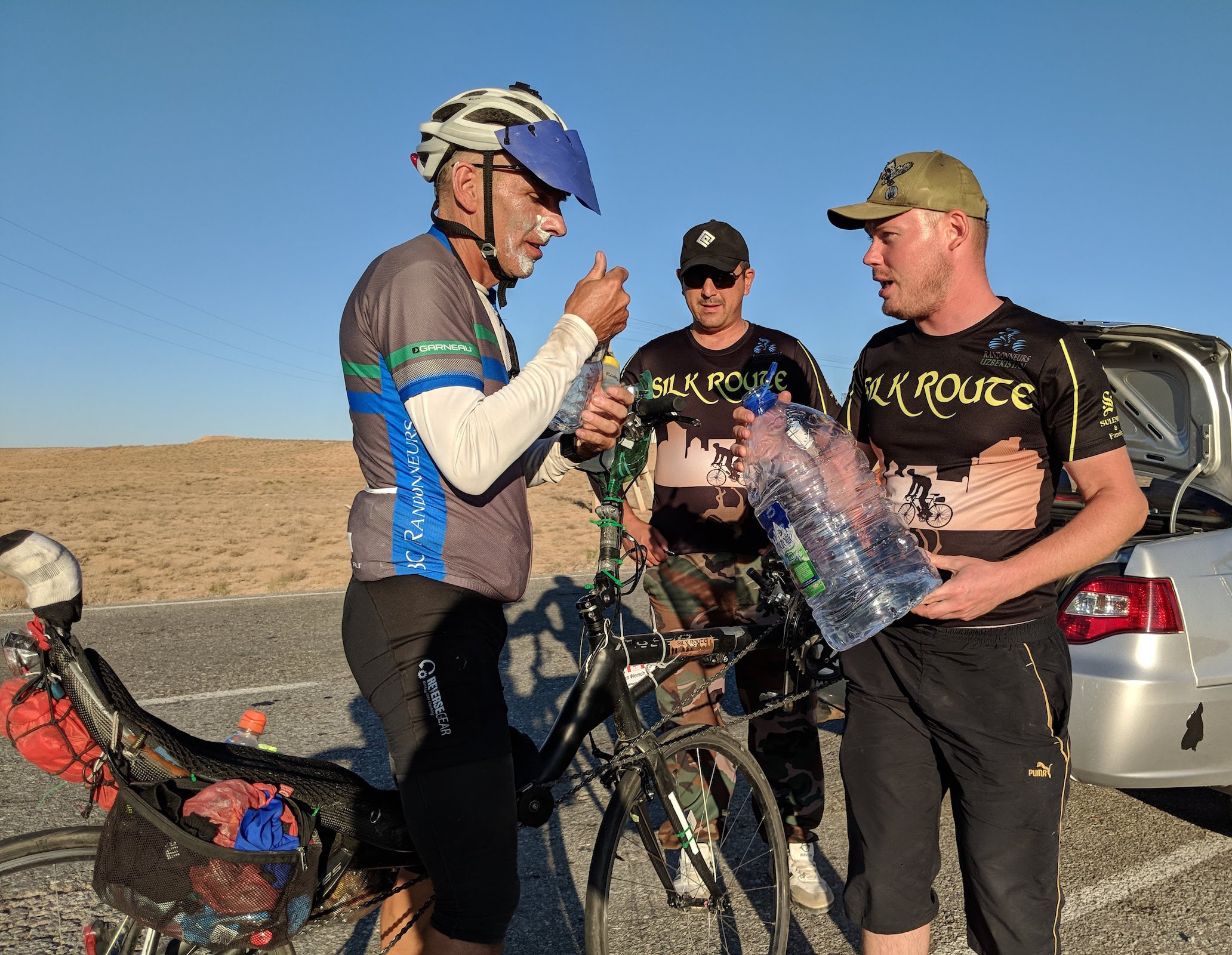Silk Road 1200 I first heard about the Silk Route 1200 in 2015. It was my first year of Randonneuring and I had just gotten back from PBP. While watching far too many YouTube videos of other people's PBP experiences I noticed a suggested video entitled Silk Route 1200. If I hadn't already decided to do it after reading the title, I certainly had by the time I finished watching the video. Fast forward 3 years and one event cancellation later and my wife and I were thrilled to find out that the arcane and expensive Visa process for entering Uzbekistan had been replaced by a three day online one at a cost of $20 US! So with flights booked we were off to spend September in Central Asia. The route began in Tashkent, the Capitol, then headed west to Samarkand for the first overnight. The plan from there was to head north to a fortress built by Alexander the Great and then finish the day in Bukhara. Days three and four were just tracing our route backwards. Before I left home there were 26 or so riders registered for the ride. By the time we were lined up at the start on the 21'st, there were only 13. By the time we left the start, we were down to 12! Heinz, one of the Austrian riders had been up all night with intestinal issues but managed to get himself together for the photo, Afterwards, he decided he was in no condition to ride so headed back to bed. We slowly made our way out of Tashkent for what was going to be a fairly flat 308 km leg. As we got further from the Capitol the road conditions started to deteriorate and I learned that I had to push my water bottles back into their cage every 5 minutes or so if I didn't want them flying out on a particularly bad section. The drivers on the whole were pretty courteous, though I believe Uzbek cars must self destruct if their horns are not pressed at least once per minute! The temperature didn't go above 30 the first day which was a bonus but the sun was still pretty intense reflecting off the sand. And while we managed to avoid any serious blowing sand there was always a fine coat of the stuff covering everything. I rode most of the first day yo-yoing with Ferdinand, an Austrian rider, and Alexander, a Russian rider (there were 7 Russian riders, 4 of them named either Alexie or Alexander!). After a couple of intermediate controls at roadside cafes, we eventually made our way to Samarkand. Samarkand was Tamerlane's Capitol and as a result there are some spectacular buildings there dating from around the 15th century, many of which have been restored. The route into town was chosen so as to ride by most of the main sites and they are all well lit at night so almost more impressive if you happened to be a late arrival. The overnight was in a dorm room 100 meters from Samarkand's main tourist attraction, the Registan. After eating dinner (food was amazing) I was in bed not long after 8. Day 2 was to be 350km and also have a bit of an elevation profile. After breakfast I was on the road by about 4:15. Several riders had already left including one who had ridden right through. This part of the route was different than in previous years. This year's version was actually the Silk Route 1317 due to this detour out to Nurata, location of one of the many fortresses Alexander built on his conquests. The road surfaces did not improve but the desert was spectacular and we were slowly making our way to the high point of the ride at about 1000 meters. Nurata was the second control of the day and 180 km into the stage. It was located at a Guest House and the food spread was awe inspiring. My 2 riding partners from the day before were already there including Alexander who had ridden straight through. After reluctantly leaving the banquet, I headed out first and rode past the fortress and then through a graveyard on the way out of town. About an hour after leaving the control I came to a fork in the road with a police car blocking my route. The officer was chatting with a friend and they both became very interested in my bike, but under no circumstances would they let me through telling instead to detour right. After about ten minutes Ferdinand joined me at the conference and we decided just to head out on the detour and take the first opportunity to rejoin the original route. This was easier said than done as police were blocking the next couple of possibilities to get back on track. To cut to the chase, we ended up doing an extra 60 kms on some of the most desolate roads of the entire event! I got up at 6 the next morning, ate left over plov(a rice and mutton dish), got the new route for the day and was off by 6:30. I saw just how bad the road was when I retraced my route from the night before! The route took we through the center of a thronging Sunday market which I had to dismount for and then it was into the new route and a straight shot back to Samarkand. Around 9am, I started feeling ill and I suspected it was the left over mutton. I didn't eat again for the rest of the day. Most of the rest of that day was spent in survival mode trying not to over exert and get a little bit of liquid down. Around mid afternoon, I was waved down by Arthur (the cyclist whose YouTube video first interested me in this ride) who was not riding in this year's event, but was patrolling the route on a dirt bike. He made me drink some juice and kept suggesting I take a nap (after commenting on how terrible I looked!). I did both, and it may have saved my ride. That was the last time I saw Arthur on the ride, but I truly appreciate what he did for me. I caught up with Ferdinand who had passed me while I was sleeping and we limped into the overnight together as he was also suffering from stomach issues. We arrived at 8:30 pm and I went right to sleep without eating and didn't get up until 4:30 the next morning. I managed to eat a bowl and a half of porridge before heading out a little after 5. I don't remember a lot from day 4 as I was still having stomach issues, but at least I cou