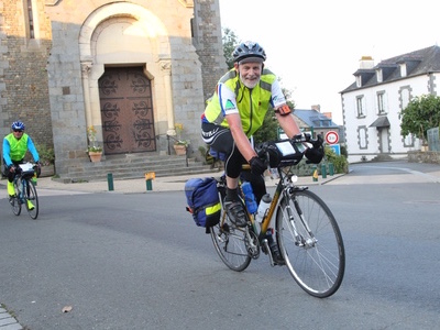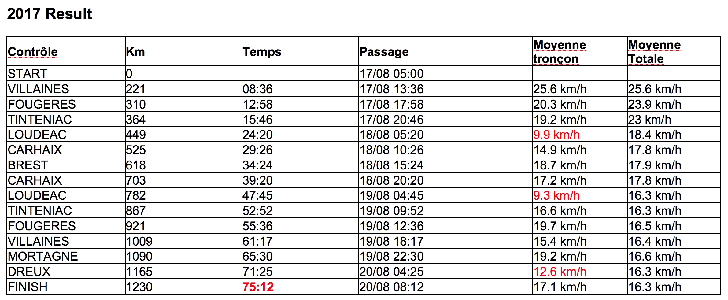 Arriving at the bridge always stirred up emotions, as it marked the midway point of PBP, more or less. Time for pictures and smiles on the Pont d'Albert Louppe, the windy link across the Bay to the turnaround control. Impressive as ever. We passed the 2003 and 2007 control with fond memories of free beer and charges for the towels. Arrived in Brest (Km 618 @ 15:24), some 34:24 after the start. Tired yes, yet very satisfied with the achievement thus far. Checked-in; showered, ate and drank. Felt very recovered and ready to tackle the way back. First to Landerneau, then Sizun where I did a quick bottle refill before the ascent up the Roc'h. For one reason or another - I don't know which one - the ascent appeared very comfortable. Could not figure out what was wrong (with me). It felt easy, that's what was right (with me). Rode up the hill at a pace which at time approached 15 - 17 kph. There was a bit of tailwind. While the ascent - like the descent - was rather long, the summit was reached before long. Great view of the distant landscape with church steeples, identifying the locations of numerous Breton villages. At the summit Ron Stewart and I exchanged our experiences thus far. Also put on warm gear as the setting sun meant cooler temperatures. The rest of the stage to Carhaix had many downhill sections in it, which helped the maintain the overall average pace. At the control in Carhaix- Plouguer (Km 703 km @ 20:20), we kept the stop brief so that we could take advantage of the last bit of the daylight. We decided to make it to St. Nicholas de Pelem (Km 733@ about 22:30). As I was enjoying a wonderful supper there, I noted Karl Weimann from Osterdorf in Nord-Bayern. He had had mishap, resulting in an injury, then delay and abandon. It would have been his 6th PBP. Understandably, Karl was distraught about his fate. Karl rode the RM 2003. He and his wife Heidi have been organizing fabulous brevets in Northern Bavaria for decades (see: http://www.randonneure.de/). Wonderful people with a deep passion for randonneuring. DAY 3: St Nicholas de Pelem - Mortagne (357 km) Rested very well. Good food in the cafeteria section rather than the quick stop on the way out. It was pitch dark when Willi and I left the control. We had to keep our wits about the route, as some of the fleches were close to the ground in the grassy berms. Not long after our departure we were diverted from the route for a secret control. If I recall correctly this must have been around Corlay. We made it to Loudeac (Km 780 @ 04:45 am), where we had a relaxed breakfast. We were here almost 24 hrs ago. Before we resumed, we put some of our excess luggage in Willi's drop bag. Physically and psychologically that felt a lot better. After a few hours on our way to Tinteniac I felt sleepy and wondered about the safety of continuing to cycle. It is that same feeling one gets when driving. Fighting it is one method, often not very successful and certainly not safe. Willi, who apparently suffered the same dilemma, suddenly called for a nap-en-route. Everyone knows what that means. Just find a place, stop, drop and sleep. We stopped and found ourselves in a stubble field, which of course is not the most attractive surface for a horizontal position. So, we tried the Harold Bridge – Ken Bonner method of standing astride across the bike and let oneself fall asleep. Did it work. It did not. Not only did we not fall, we did not sleep either. In summary, we could not fall asleep. The vertical position did not work, so we laid down on/in the stubble and closed our eyes for about 30 minutes on the nailbed. Woke up chilled - discovering that there was still no R-value in my cycling gear, but I knew that already from my 2005 LEL experience. After a 30 minutes break we began moving again. Initially it was sluggish, but then I found the groove again. While tempted to blast past the Quedillac (Km 839) food stop, we decided to enjoy a few refreshments there and ended up chatting with Darren Inouye, who was riding his 4th PBP. After that break, I certainly felt a lot better. As we continued, we noted that the road was getting a lot busier with fellow randonneurs. We arrived at Tinteniac (Km 867 @09:52 am), then after one of the shortest of intermezzos made it to Fougeres (Km 921@12:36) by lunch time. The stretch from Fougeres to Villaines is one of the longer stages on PBP. Things went along quite nicely, although I had to ride my own pace. Willi was slightly ahead, I did not want to push the pace to catch up. Conservation of energy and momentum was the key. At a roadside stop in Charchigne (Km 895) I stopped for some refreshments, including a black coffee. That felt good. The remainder to Villaines was a bit of a blur in that my senses did not record much. We arrived in Villaines (Km1009 @ 18:17), a place with unforgettable and emotional moments. First, on all accounts one is tired; second, another control is reached. Another chunk of the elephant has been eaten. Finally, the incredible welcome. Standing on the large retaining wall, crowds watch, applaud and cheer as riders - we - arrive. When we leave, they shower us with allezs and bon courages. Of course, we are both re-energized and touched by this outpouring of support. An energetic MC keeps the crowds pumped as he enthusiastically welcomes and congratulates every rider on the achievement thus far. Yet, PBP was not finished yet. Given the atmosphere, it certainly felt like it. Music played. It was a very festive scene. One that touched an emotional nerve. As I rode in and absorbed the scene, the sounds and sights, I waived to crowd as an expression of my gratitude. This wave motion got me all choked up. What a lucky man to experience this: a cyclist and to receive a welcome like this is heart rendering. As I entered the checkpoint, my traditional greeting "bonjour" and the traditional reply "bonjour aussi". I then asked the volunteer - who by now must have been at his post for hours - "et vous