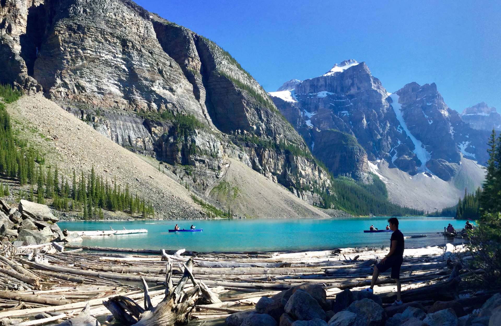 All right. Lake Louise. Lake Louise Drive was a gong show. On a sunny, Sunday afternoon in July, would you expect anything else? I don't know who was hotter and sweatier: the poor people in their cars inching along bumper-to-bumper, or me, laboriously passing on a too-narrow shoulder up a 10% grade. Finally got to Lake Louise and, oh, the people! It was mobbed. But, there was a flip side: The Moraine Lake road was closed! A few cars would be let in as people left, but the road was mostly quiet. And a very nice road for riding it was too. It was a bit of a shock to suddenly come upon a full parking lot and another mob scene. The lake was beautiful though.