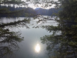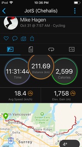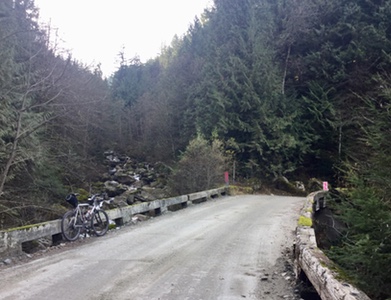 Another routine gravel permanent is done. This was pretty simple: straightshot up the Lougheed to Harrison Mills, then up the Chehalis Forest Service Road far enough to get me to at least 200 km at the finish. It was chilly to start, but the sun was out and it warmed up nicely (until it got dark, then I had to pull the layers on again). The Chehalis FSR didn't start with much promise: it was loose stones, dusty, rough, and uphill. But once alongside Elbow Lake, the road leveled and smoothed out. There were a few potholes, but no washboard to speak of. And there was no traffic! A quad passed me on the way up, a SUV passed me on the bridge at my turnaround, and a pickup passed me on the way out. That was it. I went up further than I planned, so the route is now 209 km. I turned around at a bridge just past the "10 km Up" sign, because that made for a good Control, and because it'd taken me over five hours to get that far and probably over five hours back . . . I needed to turn around. I didn't want to, road was still good!