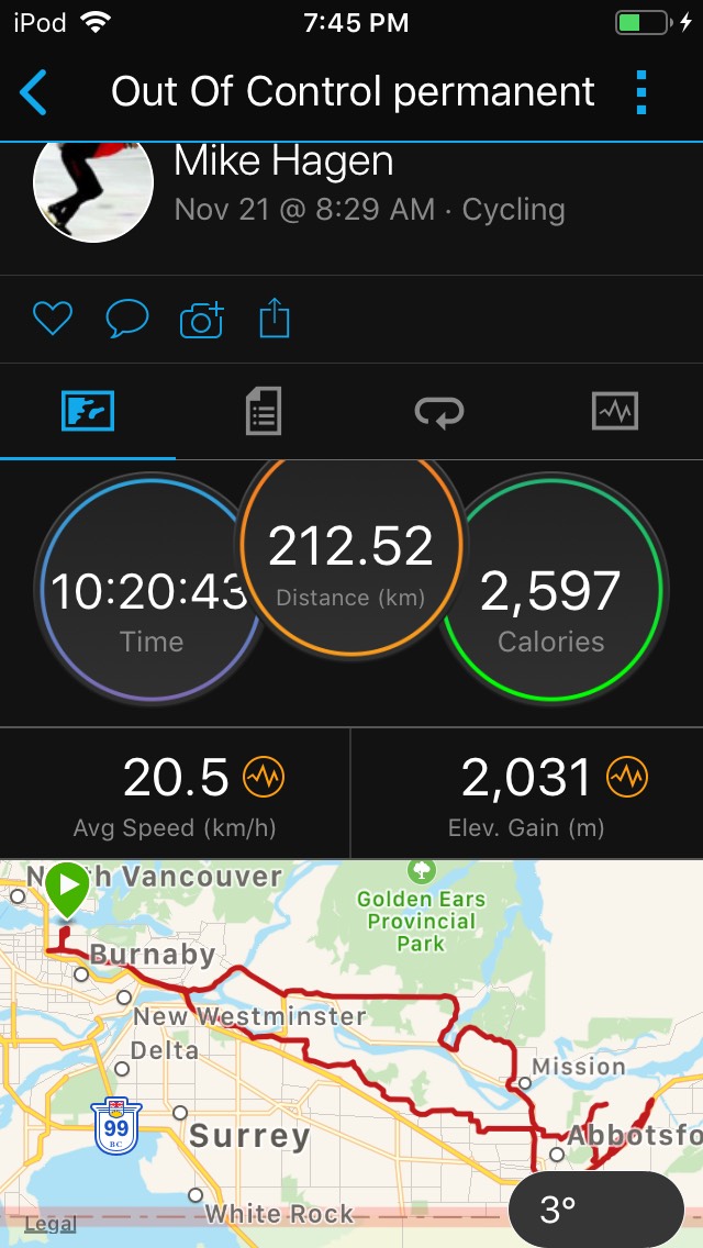 Out of Control Gosh, that's a tough course. How could I have forgotten? Sumas Mtn is a b*tch. Grade hits 14%. Not easy when my cassette tops out at 27. Don't know why I'm such a masochist. But it was fun. There's a couple more tweaks to do, so I'll resend route sheet and control card. Card attached. I started my Garmin at the house. To be consistent with past practice, I should have started it when I entered the route, which was at Lougheed and Willingdon. But I noted the time, and that's what I put on the card. There is new pavement at the top of Batt Rd. So I continued on up Bakstad Rd and then Brown Rd, right to the top. Taggart is also paved but I didn't see how far. Hayward Dam was closed so I detoured to the Lougheed and climbed Wilson from there. More climbing . . . I don't think the route will normally top 2000 m. It got dark on me at Pitt Meadows. But the MHB (actually PoCo Trail and Argue) and the Lougheed worked very well. Lots of light. Mostly. M