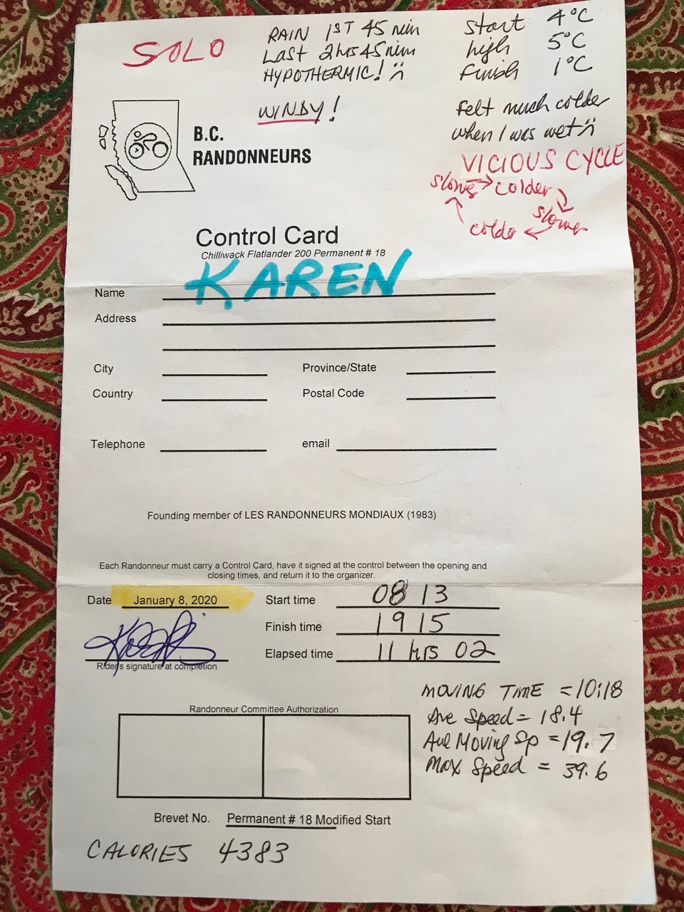 January 2020 Permanent *** DONE : ) My heart really wasn't in this ride. It was going to be windy, from the SSW which meant I would get a lot of crosswinds. Also Gary couldn't come today, so I would be solo. But I really wanted to get my January ride in before the cold and snow hit us, and today was forecasted to be the driest. So off I went. (Turns out the next day wasn't windy or rainy and would have been a much better day to go... ah, hindsight...) I meant to leave at 7:30 but it was unexpectedly raining. At a temperature of around 4 (higher than expected), I decided to try to wait for the rain to stop, which it was forecasted to do. I finally went at 8:13 (now I would have more riding in the dark!). I only got about 500m before it started to rain. It rained on me for the next 45 minutes! Uggh! I chose not to bring my gortex pants, and my thighs got really soaked! My quads were cold and weren't working for me very well. The whole way through the Sumas Prairie, I felt like I was battling the wind. I was also dreading go up 272 where Gary and I encountered the dog on our December ride. I was so freaked by this that when I got there, I walked my bike, using my bike as a barrier between me and anything that might come out of that property. Of course nothing did... I refueled at Fort Langley and left thinking that I would get better winds on the way back. But they were still not my friend. I was riding steadily but was behind schedule. After a short stop at Yellow Barn I ventured out for my last 62 km with another 1/2 hr of daylight. As soon as the sun started setting, it started to rain, and then hail. Hey, this wasn't in the forecast!!! The precipitation stopped for about 15 minutes but then I had steady rain, in the dark, until the end of the ride (till 7:15 pm). I got so cold in the rain, I could barely pedal. I really slowed down, which made me even colder because I wasn't generating any heat. It was a vicious cycle.... colder... slower... colder... slower... colder... slower... When I finally got home I was so cold that I could barely get off my bike. Michel said I was moving like an old person. I think I was bordering on hypothermia. That's unusual for me but it was just a few degrees above zero in the rain. By the finish it was 1 degree. It's hard to stay warm when you get wet in those temps. It took me a long time to warm up. Sitting by the fire wasn't working. A bath finally worked. Lessons learned: