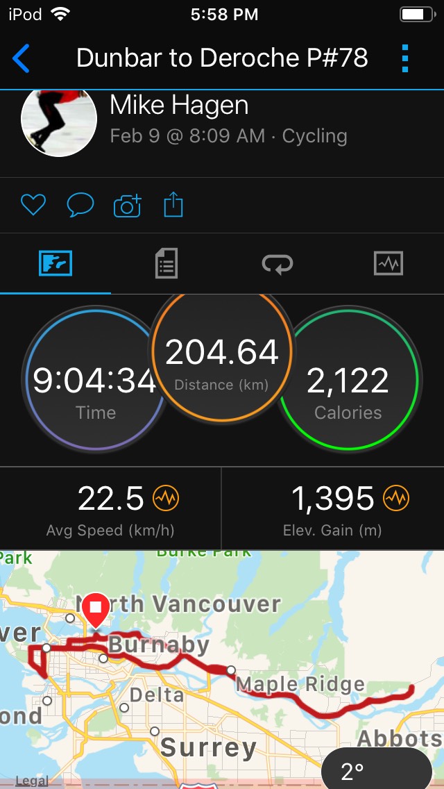 Dunbar to Derouche That was a very nice ride. Dave and I started from my place and were on the course at 8:12. It was freezing, but roads were mostly dry; just a couple damp spots where my tires slipped a bit. By the time we left Vancouver, heading up the Lougheed to Deroche, it had warmed to 3 - 4 degrees, and was dry. No concerns about traction! It stayed mostly cloudy, a bit of spitting rain on the way back, but after Mission the sun came out and it was quite pleasant. Not much wind. The long stretch of highway was almost peaceful. We could find a groove and let the dopamines elevate. Balm for the soul. Only one flat, at the east side of the Pitt River Bridge, not far from the one we had on our last ride. I hope Dave doesn't make a habit of that.