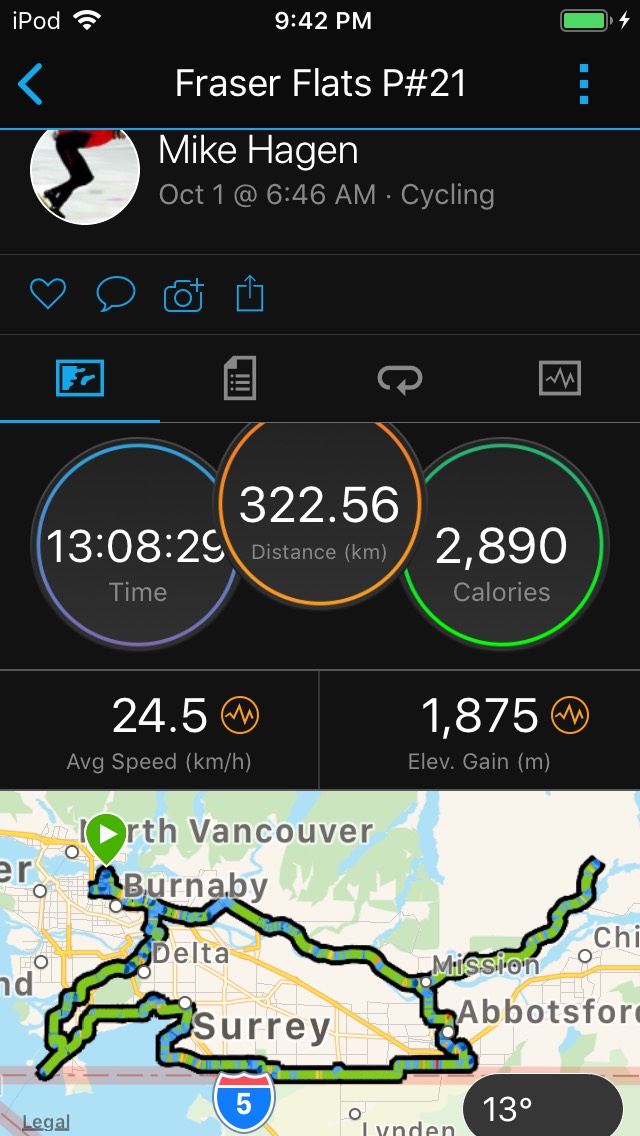Fraser Flats It was an eventful start. Those who know me know I don't like eventful on long rides. Sigh. I forgot my Camelbak with most of my food and water. Went home to get it. Construction detour on Winston Slip (though I knew about that). Puncture coming off the Patullo Bridge. My fender and frame was slick with sealant; there was none left in the tire. I put a tube in. Tsawwassen Drive through the reserve closed to the public due to Covid. Backtracked and detoured. By the time I got to the first control at the Tsawwassen ferry terminal, I had 66 km on my Garmin versus 52 km on the route sheet. I even checked the closing time to see if I was okay: 38 minutes to spare. Whew. But after that it was a good day. Cool, but not cold; very pleasant to ride in. High cloud, hazy sunshine, and, wildfire smoke? I finally decided that, yes, it was smoky, but I didn't smell anything at ground level. I'd read Karen's September permanent story. I can confirm: the cable "fence" along 0 Ave does look strange. Two parties visiting across the border. Three US border patrol vehicles, no Canada ones. What else: Sieg Palme flyby in Abbotsford! He was walking his bike up Whatcom Rd. Stopped to chat for a minute. With the flat course and no wind to speak of, I was clawing back 5 minutes or so every hour toward that elusive 25 km/hr average speed. Finally got it at 250 km with 9:58 elapsed, and promptly rewarded myself with an ice cream sandwich from the Hatzic Co-op. Nice red sunset. Finished after dark. My light died, but I had a spare. Randonneur preparedness strikes again. Given the eventful start, I'm pleased with 12:46, especially with 322 km showing at the end.