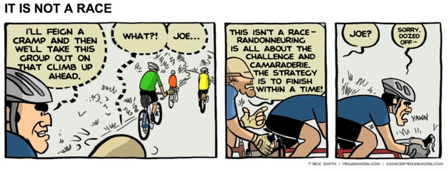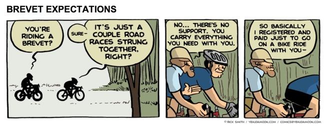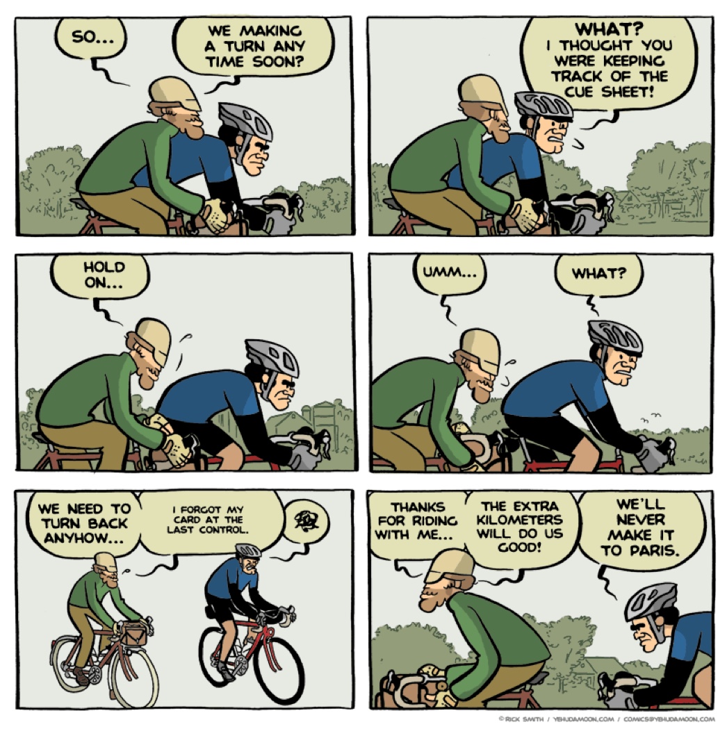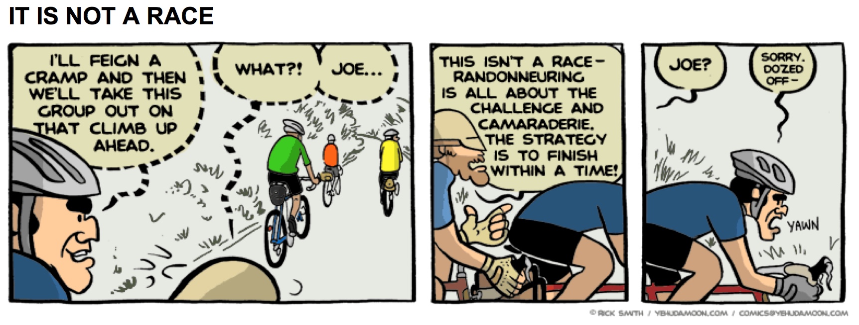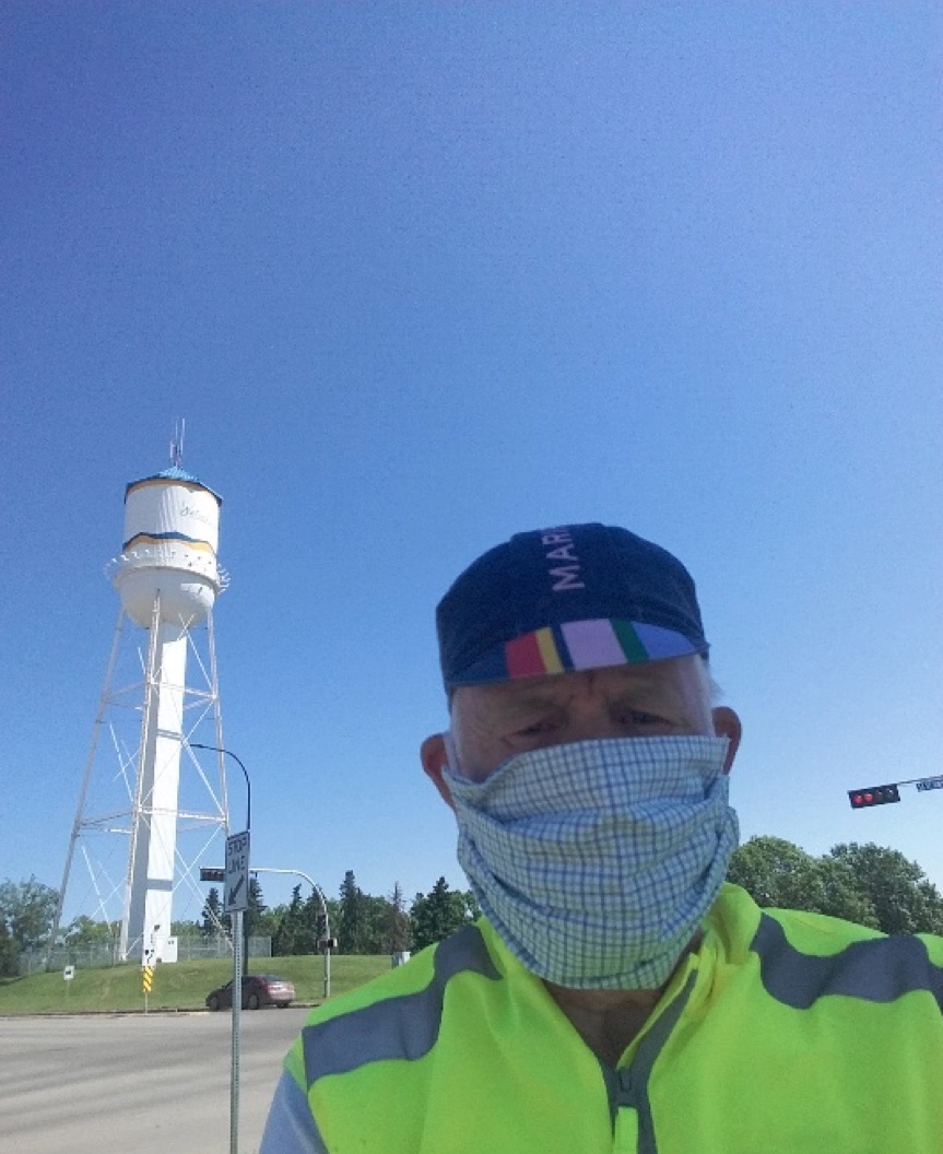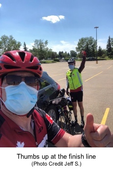 Two Masked Men Seen Cycling in Alberta Introduction Covid-19 changed everything. That is, everything came to a grinding halt. For most, things never went much beyond spring training (with or without the minors). In my case skating laps on the 400m indoor oval - where weather is never an excuse - and riding the rollers in the basement - where weather is not an excuse either. In terms of riding the rollers this is a very lonely task, where the basement wall depicts this wintery white image, except that the temperature is very bearable. To offset the boredom, I tapped in YouTube's Garmin cycling videos for indoor training again. Neat stuff and great scenery. It was not until May 1 that I hit the road. With some of the road paving activities that had gone on in the back country last season, I was able to design a new training route. The 31km loop served the spring training well. It had everything: flat, rolling, short steep sections, low traffic, head wind, tailwind, sidewind and - if luck will have it - no wind. That formed the basis for gradual longer distances, so by the time the Alberta Randonneurs started their delayed season late May/early June I had sufficient mileage in my legs. Incidentally, I used Eric Ferguson's sample training schedule for my initial spring training on the road. This one worked very well. For details, see: With a large window for each brevet, Jeff Shmoorkoff and I settled on the Camrose 200 as the first one for the season. It is a classic, which I must have completed at least four times. So, it was back on memory lane. We decided on a 6:00 am start from the vacant Edmonton Millwoods Shopping Centre. I was first greeted by a jack rabbit curiously (s)hopping around for early breakfast supplies. I then greeted Jeff and without much ado we got on the road, first through a few messy construction zones and then into the countryside. Traffic was very light, so were the winds. The temperatures were perfect. The course was near flat. In brief: a randonneur's delight. The countryside had nicely greened up as opposed to the usual mid April scene, when the landscape tries to shake its winter features: leafless trees, frozen ponds, the odd snowdrift slowly withering away and of course the chilly winds. None of that this time. Our first control was New Sarepata (2016 population 522) a town which judging by the new housing developments, is definitely on the upswing. The settlement gained some fame way back when Edmonton Journal political cartoonist John Yardley-Jones described himself as its 'ornery mayor'. The community named a park in his honour and had a display of murals depicting his art. In 1991 Nick Lees wrote an article in the Edmonton Journal, featuring randoneuring, P-B-P, Jeff Shmoorkoff and Dave Oliphant. When I recently referred this article to Jeff, he wrote that Nick also did an article in 1987, while Yardley-Jones drew Jeff's caricature! I saved the 1991 the article, not knowing at that time that it would inspire me to get into randonneuring in 2000. Talk about a fluke of history. That's indeed what the rest of it is. The next control was Miquelon Lake, which brought back memories, not the place itself, but for what did (not) happen between New Sarepta and Miquelon Lake back in 2011. We started with a group of riders, which soon got separated. Willi Fast and I cruised south, conversing about PBP and other matters. I will let Willi tell the story here: "";Wim and I struck up a great conversation, and talked about all things randonneuring, with a heavy emphasis on Paris-Brest, since that is a goal for each of us this year. Wim has completed Paris-Brest twice, and so I was using the opportunity to glean as much info as possible from this well-travelled ancient. As we sped southward, with the aid of an increasingly strong tail wind, we spoke at length about route-finding on Paris-Brest. Wim indicated that route finding was generally not a concern there, since there was almost always someone that knew the route, and if someone made a wrong turn, others would quickly set them straight again with a verbal cue how to get back on course. We were continuing the easy wind-assisted pedaling, ` when Wim began to question why we had not yet reached the Miquelon Lake turn-off. We stopped, consulted the map, and with a growing sense of despair, acknowledged the realization that we had, indeed, missed the turn-off. And not by just a little. How ironic that as we spoke of route finding issues in France, we would commit such a rookie error here on our home turf, where I had driven the way to Miquelon Lake too many times to remember (literally !!). Our sense of denial weakened, as we admitted that we had over-shot the turn-off, and had ridden past not only Hay Lakes, but also Armena. We were 25 km off course, and now faced the prospect of a 25 km retreat to get back on route. Not only that, the retreat was directly back into the wind which had so easily pushed us too far to the south!" Well, we did finish the 250 km brevet in 11:44. A few weeks later Willi passed on this web-link with a not so subtle message attached to it: "Click on this link - this is too funny - if only it weren't true" ![]() Source: http://yehudamoon.com/comic/2011-05-12/ I then explored the site and noted more cartoons about cycling, including some based on what must be insider information about randonneuring! Funny. So here are a few of them for further enjoyment. ![]() Source: http://yehudamoon.com/comic/2011-05-11/ ![]() Source: http://yehudamoon.com/comic/2011-05-16/ The section from Miquelon Lake to Camrose was uneventful and fast, as was the control stop and the leg to Wetaskewin. The only minor challenge was the coulee crossing between the two places, which is always good for practicing one's climbing skills. ![]() Jeff coming out of the coulee and rising above it. The Tim Horton's near Wetaskewin's water tower was the next control. Many Randonneurs have visited this place during central Alberta brevets