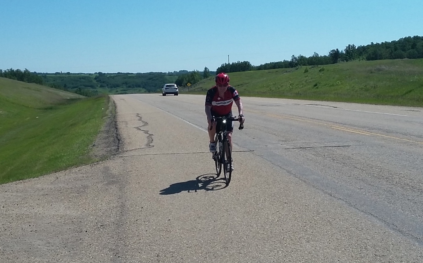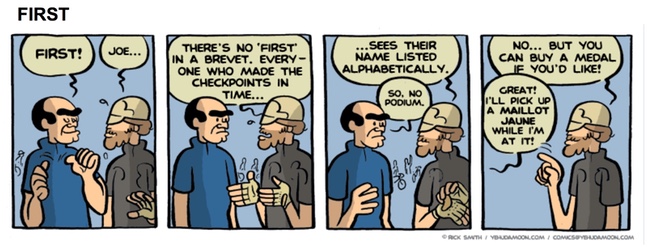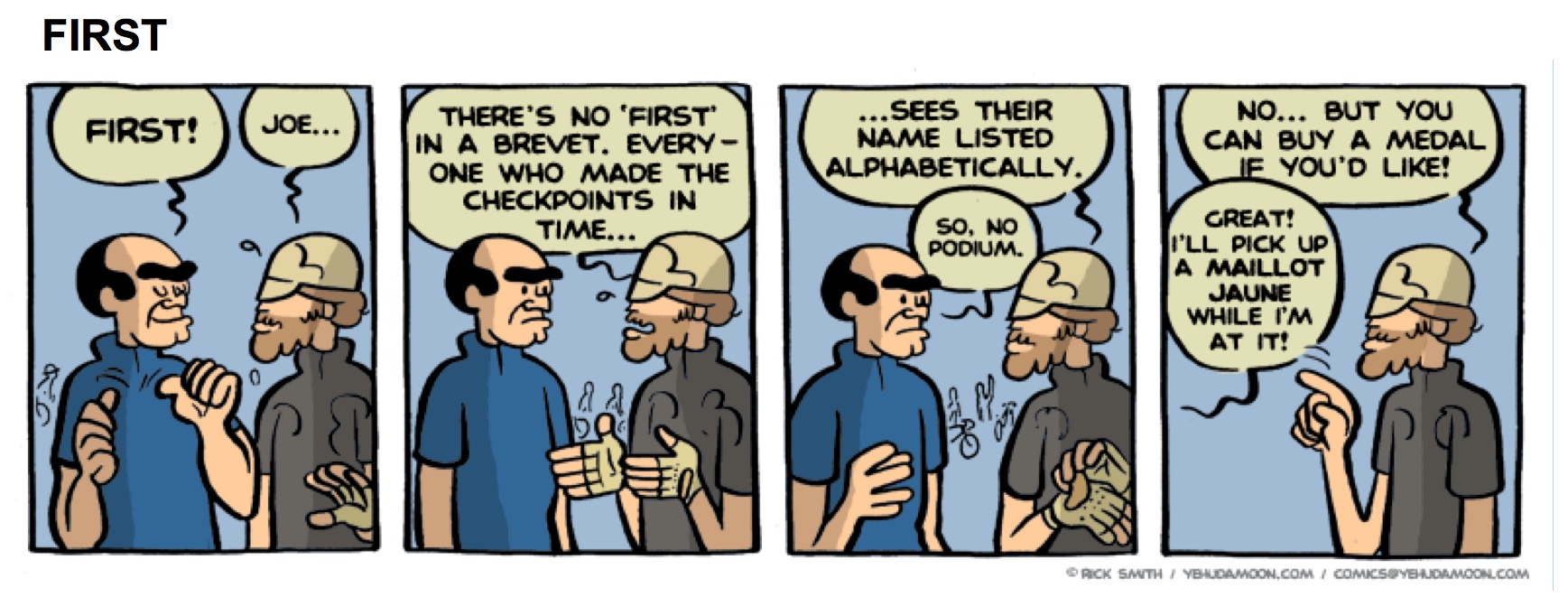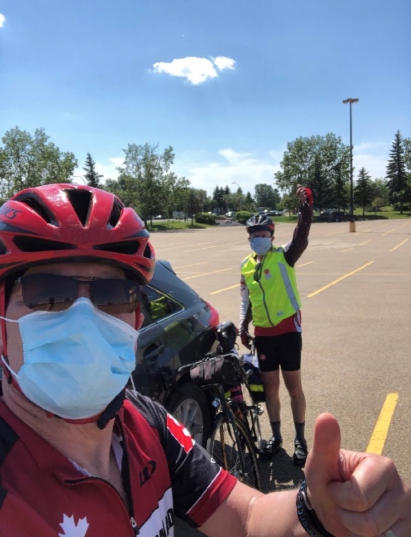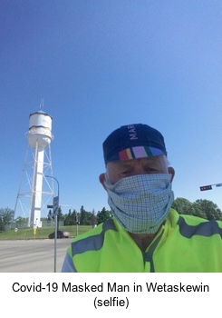 Two Masked Men Seen Cycling in Alberta Introduction Covid-19 changed everything. That is, everything came to a grinding halt. For most, things never went much beyond spring training (with or without the minors). In my case skating laps on the 400m indoor oval - where weather is never an excuse - and riding the rollers in the basement - where weather is not an excuse either. In terms of riding the rollers this is a very lonely task, where the basement wall depicts this wintery white image, except that the temperature is very bearable. To offset the boredom, I tapped in YouTube's Garmin cycling videos for indoor training again. Neat stuff and great scenery. It was not until May 1 that I hit the road. With some of the road paving activities that had gone on in the back country last season, I was able to design a new training route. The 31km loop served the spring training well. It had everything: flat, rolling, short steep sections, low traffic, head wind, tailwind, sidewind and - if luck will have it - no wind. That formed the basis for gradual longer distances, so by the time the Alberta Randonneurs started their delayed season late May/early June I had sufficient mileage in my legs. Incidentally, I used Eric Ferguson's sample training schedule for my initial spring training on the road. This one worked very well. For details, see: With a large window for each brevet, Jeff Shmoorkoff and I settled on the Camrose 200 as the first one for the season. It is a classic, which I must have completed at least four times. So, it was back on memory lane. We decided on a 6:00 am start from the vacant Edmonton Millwoods Shopping Centre. I was first greeted by a jack rabbit curiously (s)hopping around for early breakfast supplies. I then greeted Jeff and without much ado we got on the road, first through a few messy construction zones and then into the countryside. Traffic was very light, so were the winds. The temperatures were perfect. The course was near flat. In brief: a randonneur's delight. The countryside had nicely greened up as opposed to the usual mid April scene, when the landscape tries to shake its winter features: leafless trees, frozen ponds, the odd snowdrift slowly withering away and of course the chilly winds. None of that this time. Our first control was New Sarepata (2016 population 522) a town which judging by the new housing developments, is definitely on the upswing. The settlement gained some fame way back when Edmonton Journal political cartoonist John Yardley-Jones described himself as its 'ornery mayor'. The community named a park in his honour and had a display of murals depicting his art. In 1991 Nick Lees wrote an article in the Edmonton Journal, featuring randoneuring, P-B-P, Jeff Shmoorkoff and Dave Oliphant. When I recently referred this article to Jeff, he wrote that Nick also did an article in 1987, while Yardley-Jones drew Jeff's caricature! I saved the 1991 the article, not knowing at that time that it would inspire me to get into randonneuring in 2000. Talk about a fluke of history. That's indeed what the rest of it is. The next control was Miquelon Lake, which brought back memories, not the place itself, but for what did (not) happen between New Sarepta and Miquelon Lake back in 2011. We started with a group of riders, which soon got separated. Willi Fast and I cruised south, conversing about PBP and other matters. I will let Willi tell the story here: "";Wim and I struck up a great conversation, and talked about all things randonneuring, with a heavy emphasis on Paris-Brest, since that is a goal for each of us this year. Wim has completed Paris-Brest twice, and so I was using the opportunity to glean as much info as possible from this well-travelled ancient. As we sped southward, with the aid of an increasingly strong tail wind, we spoke at length about route-finding on Paris-Brest. Wim indicated that route finding was generally not a concern there, since there was almost always someone that knew the route, and if someone made a wrong turn, others would quickly set them straight again with a verbal cue how to get back on course. We were continuing the easy wind-assisted pedaling, ` when Wim began to question why we had not yet reached the Miquelon Lake turn-off. We stopped, consulted the map, and with a growing sense of despair, acknowledged the realization that we had, indeed, missed the turn-off. And not by just a little. How ironic that as we spoke of route finding issues in France, we would commit such a rookie error here on our home turf, where I had driven the way to Miquelon Lake too many times to remember (literally !!). Our sense of denial weakened, as we admitted that we had over-shot the turn-off, and had ridden past not only Hay Lakes, but also Armena. We were 25 km off course, and now faced the prospect of a 25 km retreat to get back on route. Not only that, the retreat was directly back into the wind which had so easily pushed us too far to the south!" Well, we did finish the 250 km brevet in 11:44. A few weeks later Willi passed on this web-link with a not so subtle message attached to it: "Click on this link - this is too funny - if only it weren't true" ![]() Source: http://yehudamoon.com/comic/2011-05-12/ I then explored the site and noted more cartoons about cycling, including some based on what must be insider information about randonneuring! Funny. So here are a few of them for further enjoyment. ![]() Source: http://yehudamoon.com/comic/2011-05-11/ ![]() Source: http://yehudamoon.com/comic/2011-05-16/ The section from Miquelon Lake to Camrose was uneventful and fast, as was the control stop and the leg to Wetaskewin. The only minor challenge was the coulee crossing between the two places, which is always good for practicing one's climbing skills. ![]() Jeff coming out of the coulee and rising above it. The Tim Horton's near Wetaskewin's water tower was the next control. Many Randonneurs have visited this place during central Alberta brevets