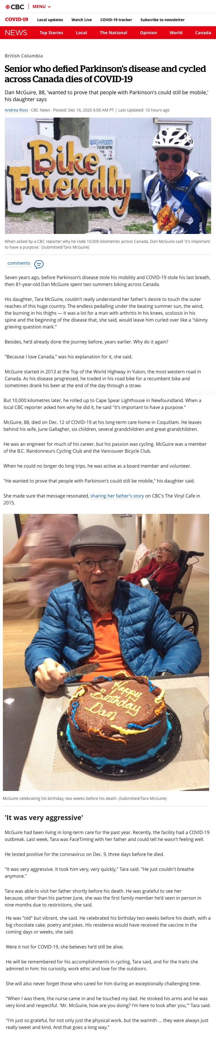 CBC Report on Dan McGuire - Archived This is a screen capture of the CBC Report on Dan's passing. The embeded link to Tara McGuire's story of Dan's Cross Canada ride is here: "sharing her father's story".