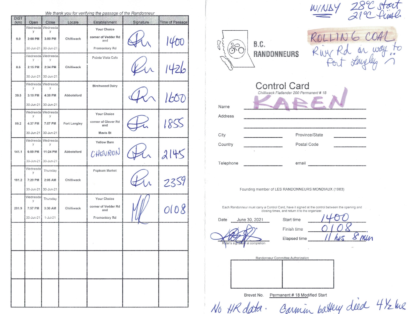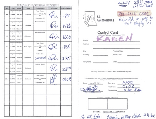 As I get older, I am more nervous about riding in the dark by myself. Michel met me at 2145 hrs at Yellow Barn (well the new Chevon across the street) and rode to the finish with me. He knew I would have 3 hrs of darkness left. Merci Michel!