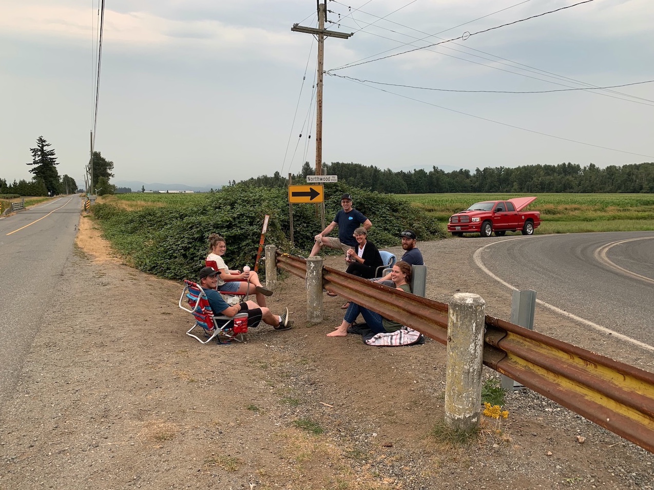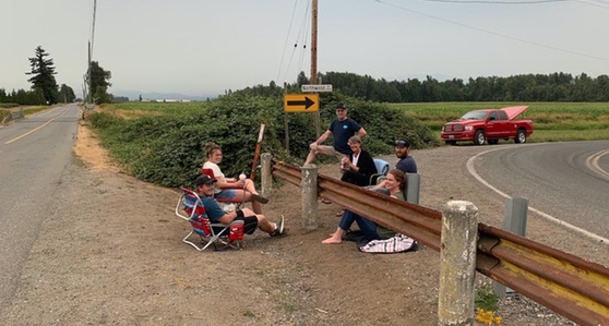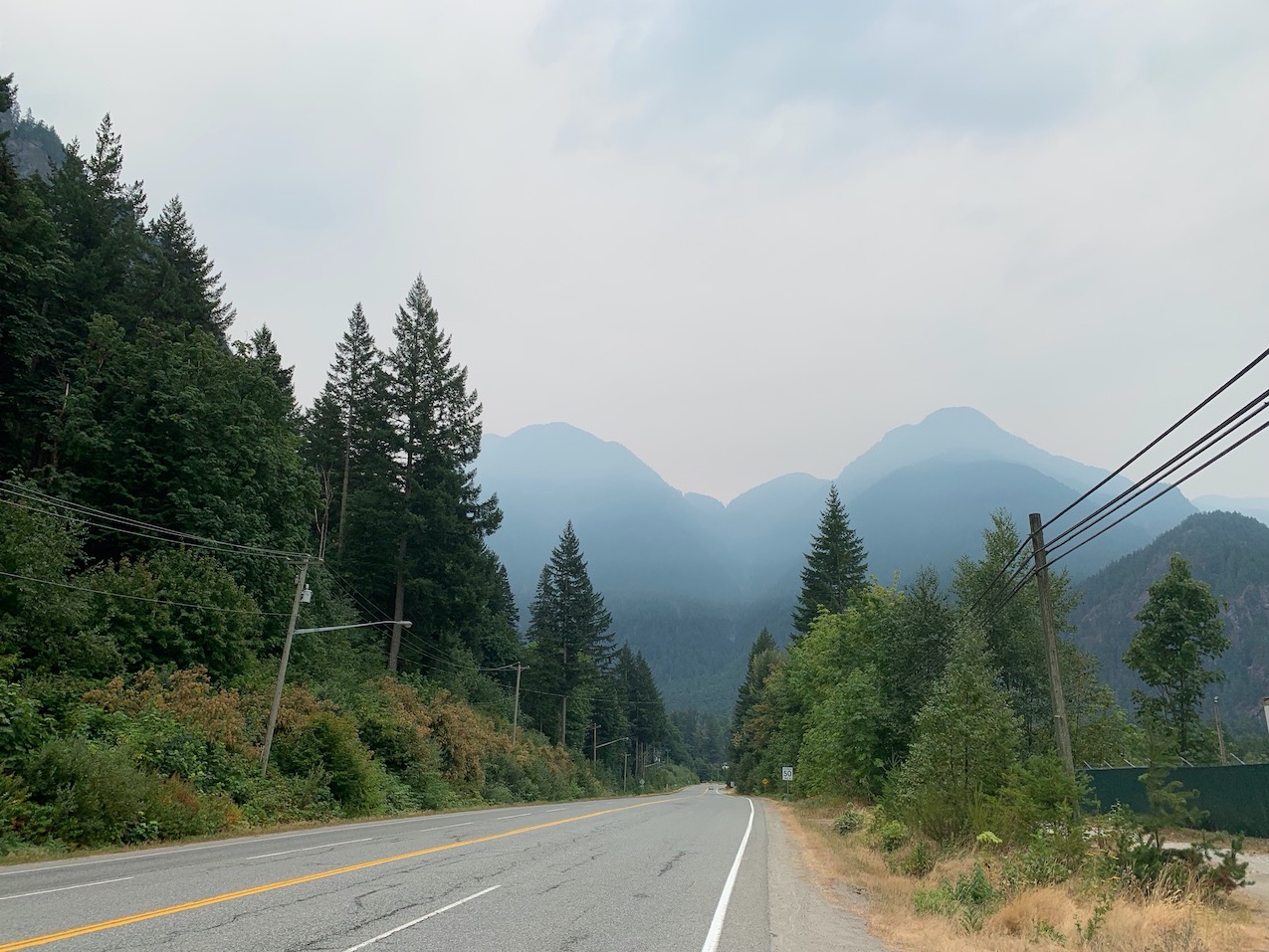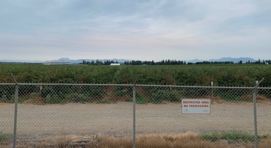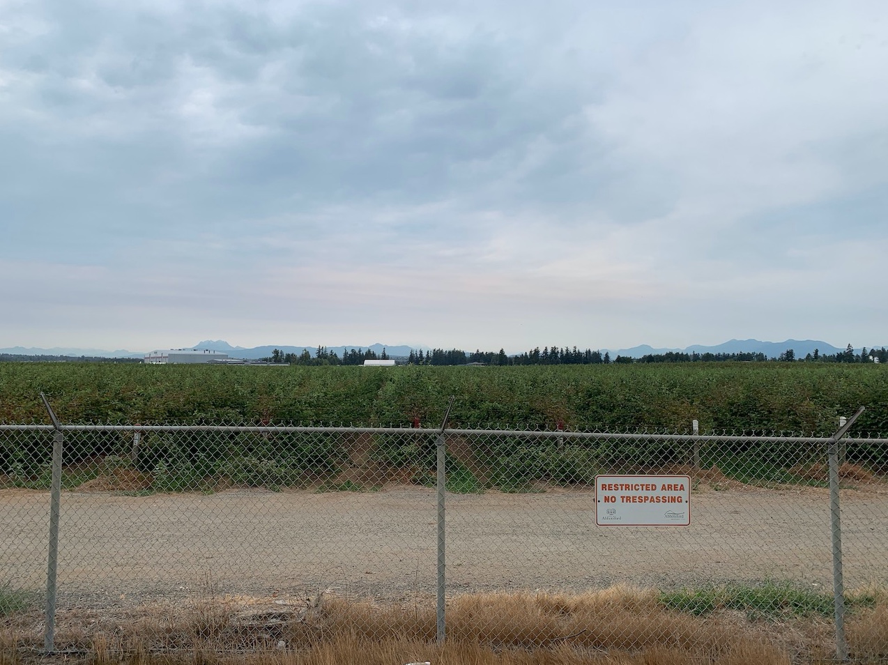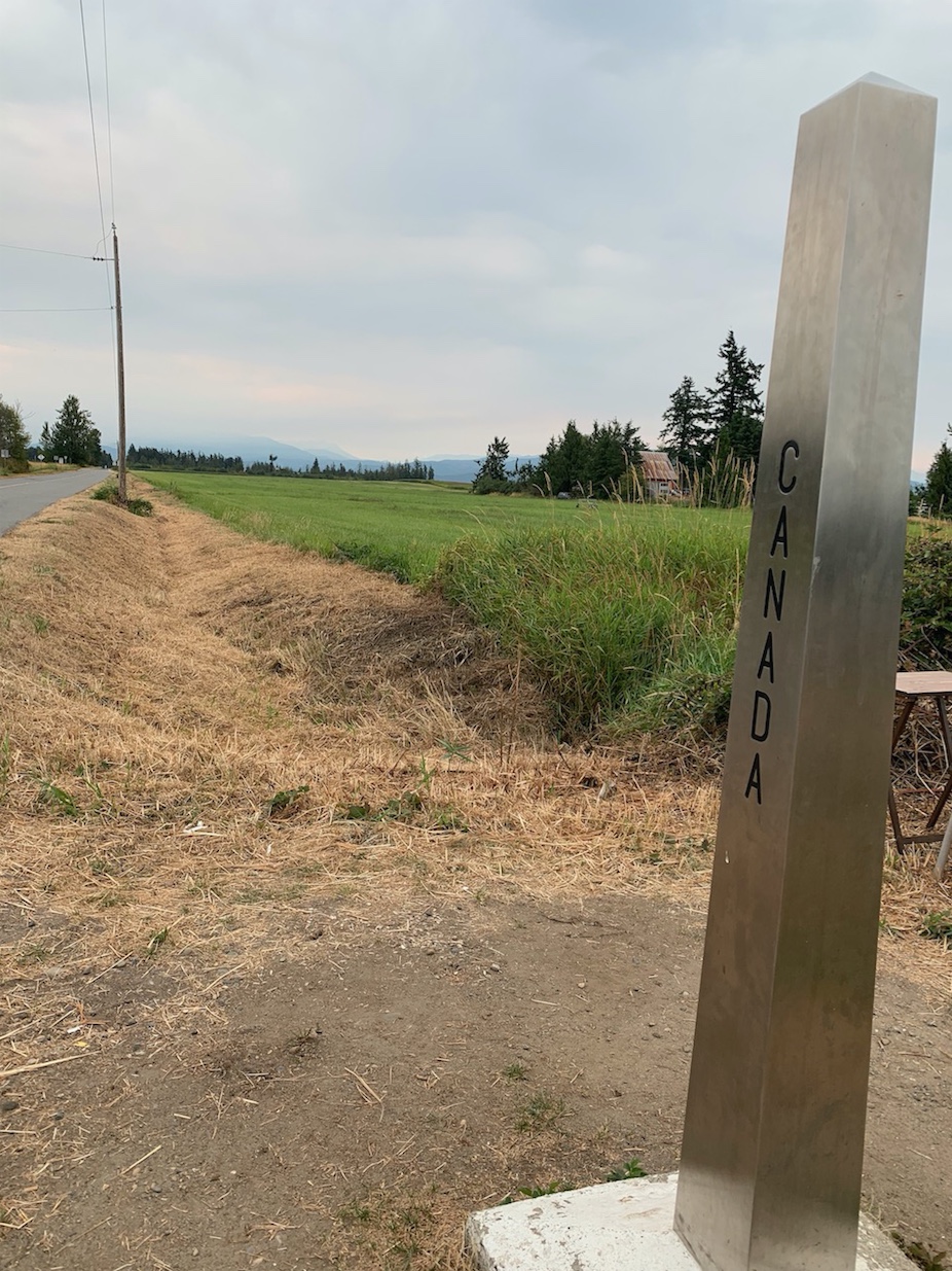As I ride through Rosedale, the distant mountains are closing in. So is the haze, trapped by an inversion that is easy to see against the mountain sides. The bridge across the Fraser River to Agassiz was billed as really bad. It is only two lanes with no shoulder and no sidewalk for over 2 km - there is nowhere to go if a driver gets too close. There is a walkway of sorts but it is dotted with lampposts. One would have to turn sideways to get past each lamppost without stepping into the traffic lane. Fortunately, traffic was light. The reward for making it across safely was a ride to Hope on the quiet and pretty Highway 7. I stopped in Agassiz for a sandwich. As I eat a group of three riders go by. That must be Shiro, Bob and Anna. I pack up the remains of my sandwich and head out in the hopes of catching them At Hope, I run into the forest fire smoke just as I start the longest, highest climb of the ride. The climb itself is pretty easy with gentle grades on both sides. At the top, I finally meet up with Bob and Anna. In case the hill wasn't enough fun the first time, we descend the other side then turnaround and climb it again in the other direction. There is a 25 km section on Highway 1 west of Hope. It's busy and noisy but, wow, is it fast. The constant traffic creates an artificial tailwind that propels Cruising through farmland is always interesting, I see berry farms with strange looking machinery. I see llamas, sheep, goats and horses. There are many malodorous dairy farms and chicken barns. Biosecurity signs are everywhere. I see rows of greenhouses and sprawling mansions. As evening approaches the course returns to 0 Ave, which just got even more bizarre. Families that are not allowed to cross the border, which is still closed to non-essential travel, are lined up on opposite sides so that they can visit each other while staying in their respective countries. The US border patrol is out in force but seem to tolerate these visits even if they are sometimes a metre of two on the wrong side of the line.
