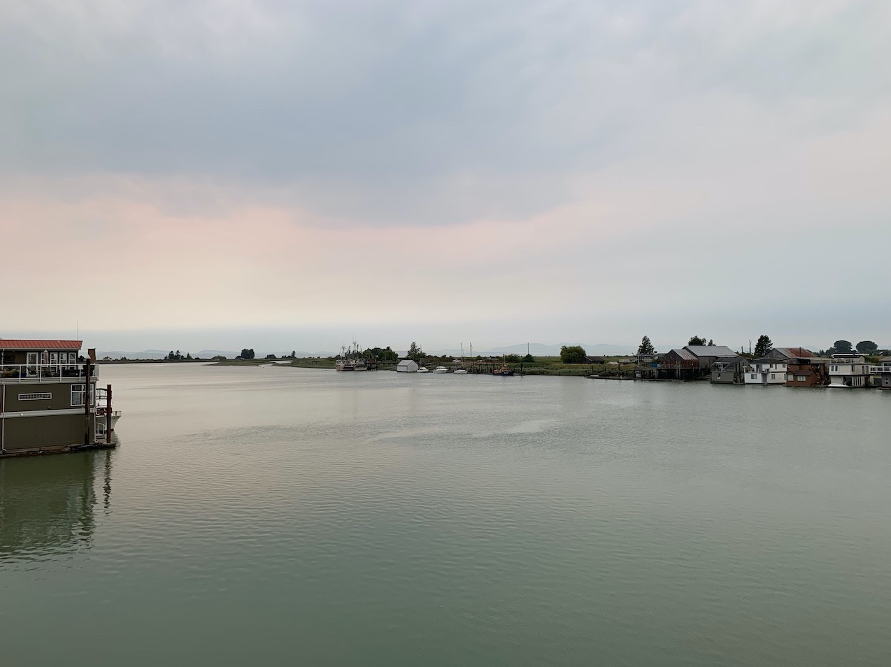 It's dark by the time I leave South Surrey for a flat, easy ride towards Tsawwassen. Past the Boundary Bay airport with its colourful lights, along the shores of Boundary Bay with the lights of US towns twinkling in the distance. A short, steep climb gets me to the Tsawwassen control and back to where "Hillary" is parked. I arrive before midnight for a shower and a few hours of blissful sleep. After a (too short) sleep, I am back on the bike riding past the sprawling Tsawwassen Mills shopping centre, past Deltaport with its trains that go on forever and the massive warehouses that surround it. I ride through more farmland and onto Westham Island. I wasn't expecting it to be a habited island with more farms.