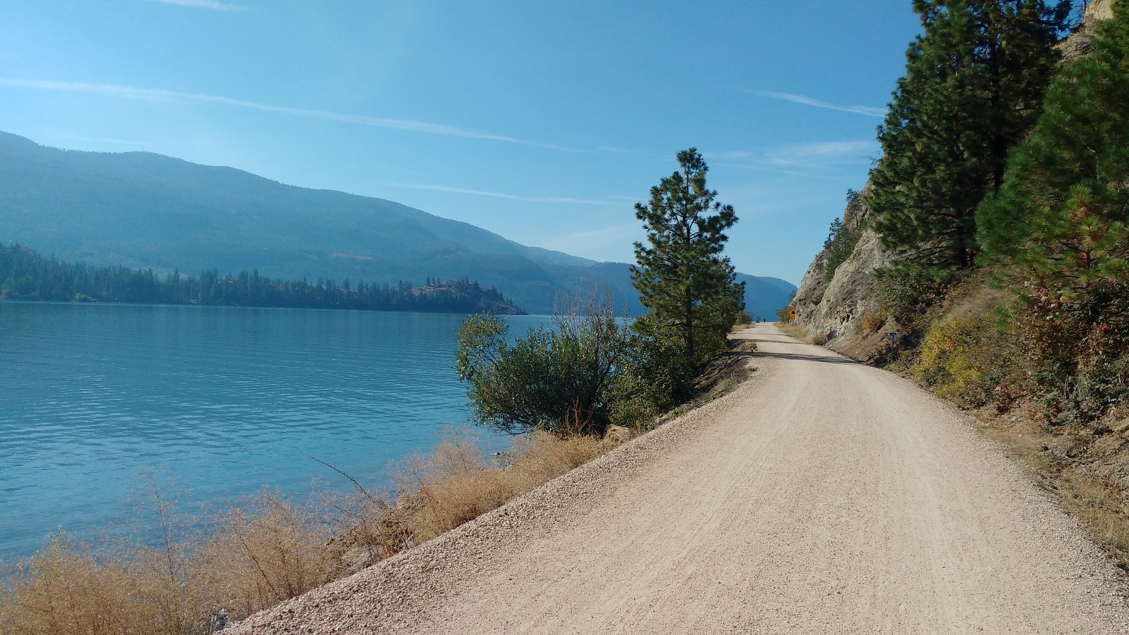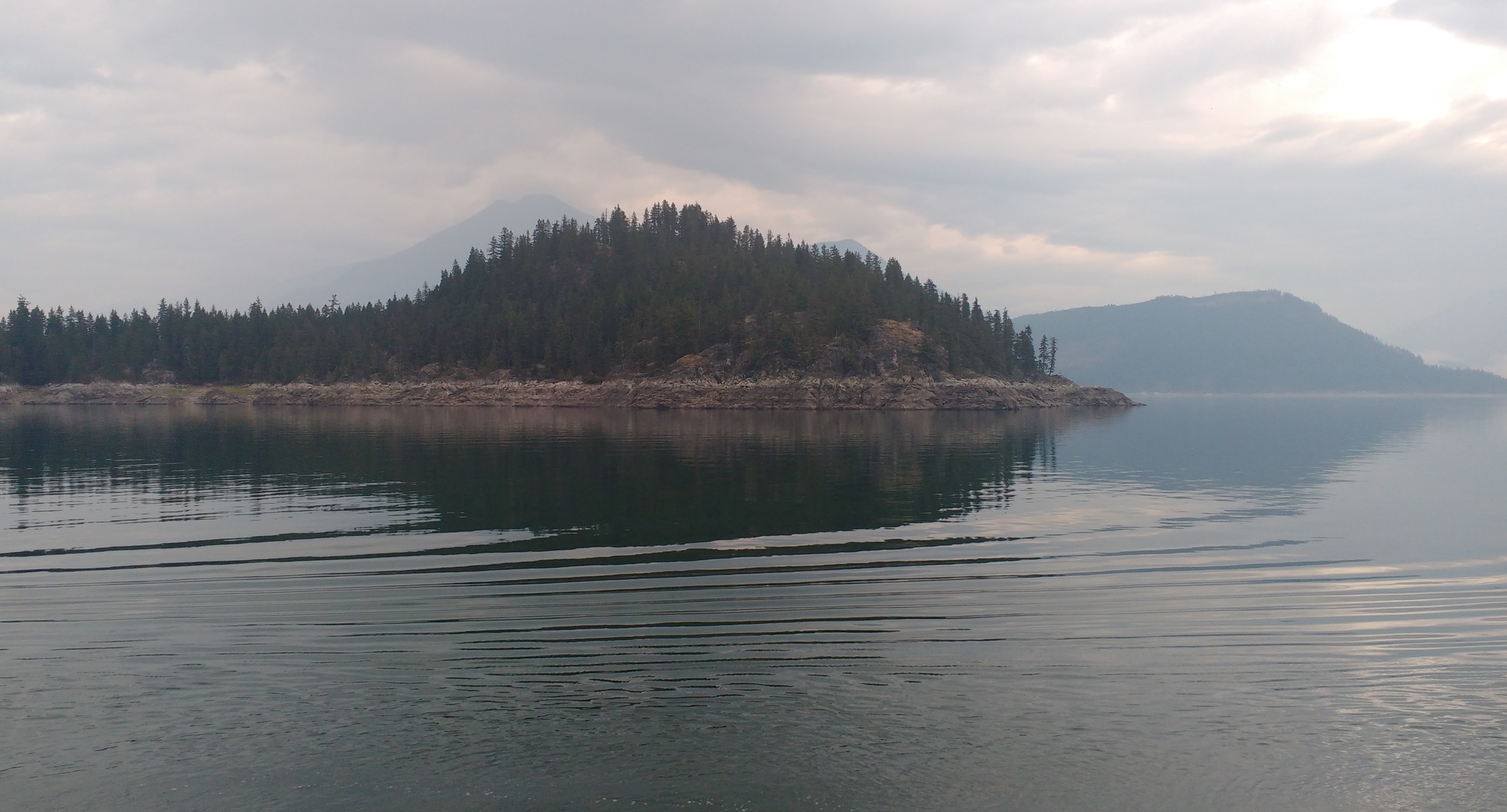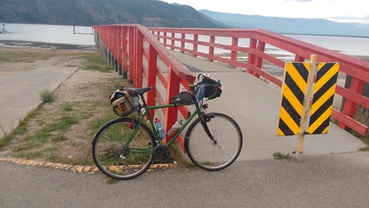 On the road before 6, I caught the 8:30 ferry, and the only real rain of the ride, for all of 5 minutes. At the Revelstoke A&W, I got a breakfast sandwich to eat there, and two more to take with me. Somehow though, one of the to-go sandwiches did not make it out of the parking lot. I had been dreading the next setion- 16- km of long weekend Highway 1 traffic. But when I phoned Susan, she told me there was an accident, and the Rogers Pass was closed. One persons disaster is another persons blessing, and there was virtually NO traffic until almost Salmon Arm. Oh, and downhill, too. I also didn't complain about the major tailwind I got from Salmon Arm to the top of Jade Mountain, from where I could see the wharf where I needed to finish far below me. Lacking the skills and rock climbing gear to rappel down the short cut, I followed the road down through Chase to finish, and sat on a bench in the nice warm sunshine while I waited for Susan to pick me up. A great way to finish a great weekend!