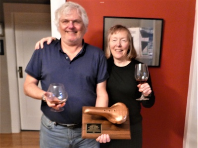 Golden Saddle With Covid and the cancellation of the AGM and other social events Barry Chase wasn't presented with his 100,000k award. Colin Fingler had the plaque made. All that was needed was for the "Golden Saddle" to be attached to the plaque. The "Golden Saddle" is passed forward from one 100,000 km recipient to the next. As I was the last recipient of the award, Bob and I had Barry over for a little celebration to present the award and pass on the saddle. This was the clearest photo. It's still fuzzy - maybe we celebrated a little too much!