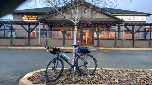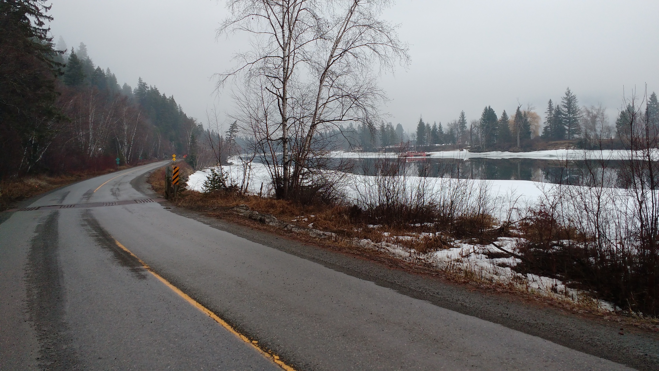A River Runs Through It So nice to ride without studded tires and frozen bottles! Pretty uneventful, unless you count forgetting my sandwich at home or having to backtrack a couple of kms to retrieve a dropped glove. Started from Kokanee Way this time. Foggy and chilly out to the ferry (still not running), then the usual headwind from Kamloops to Chase. Strong tailwind to the finish.