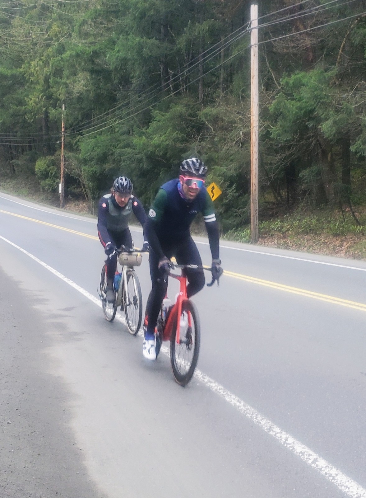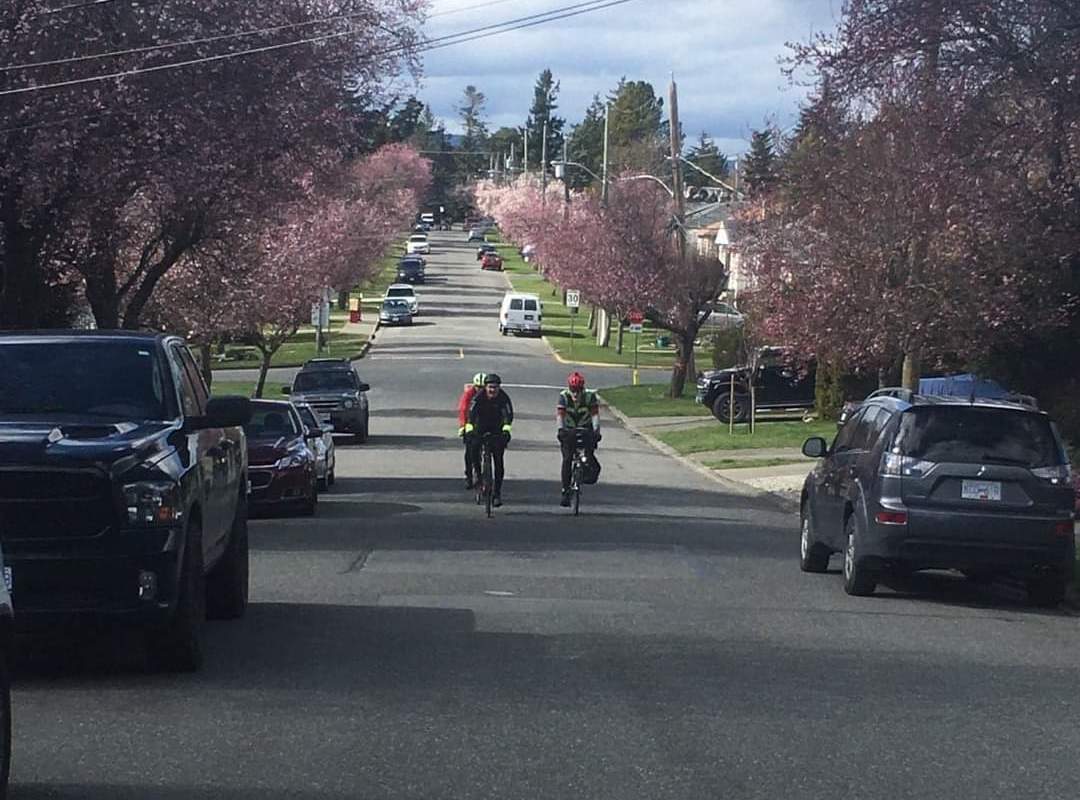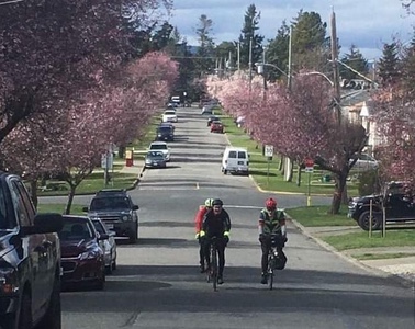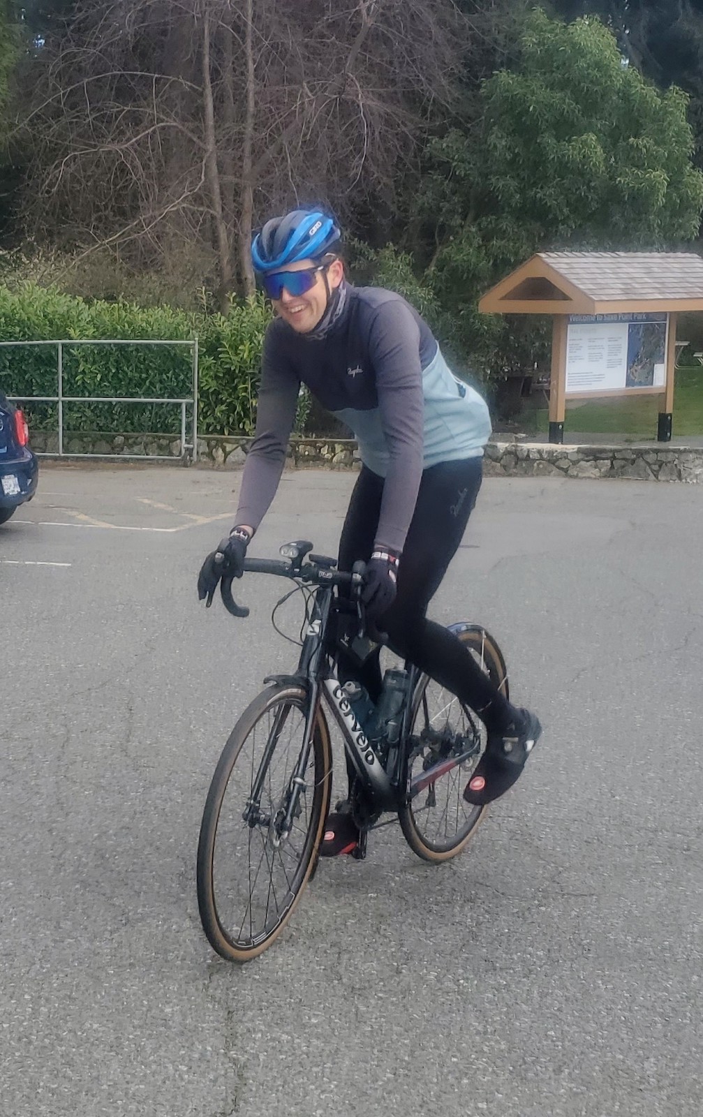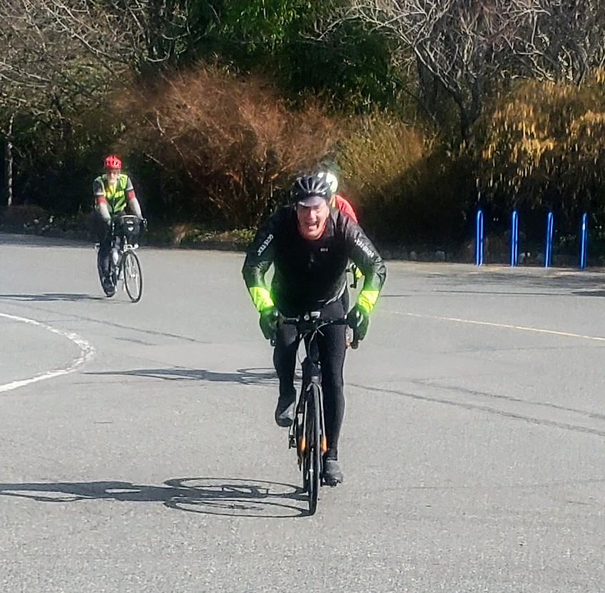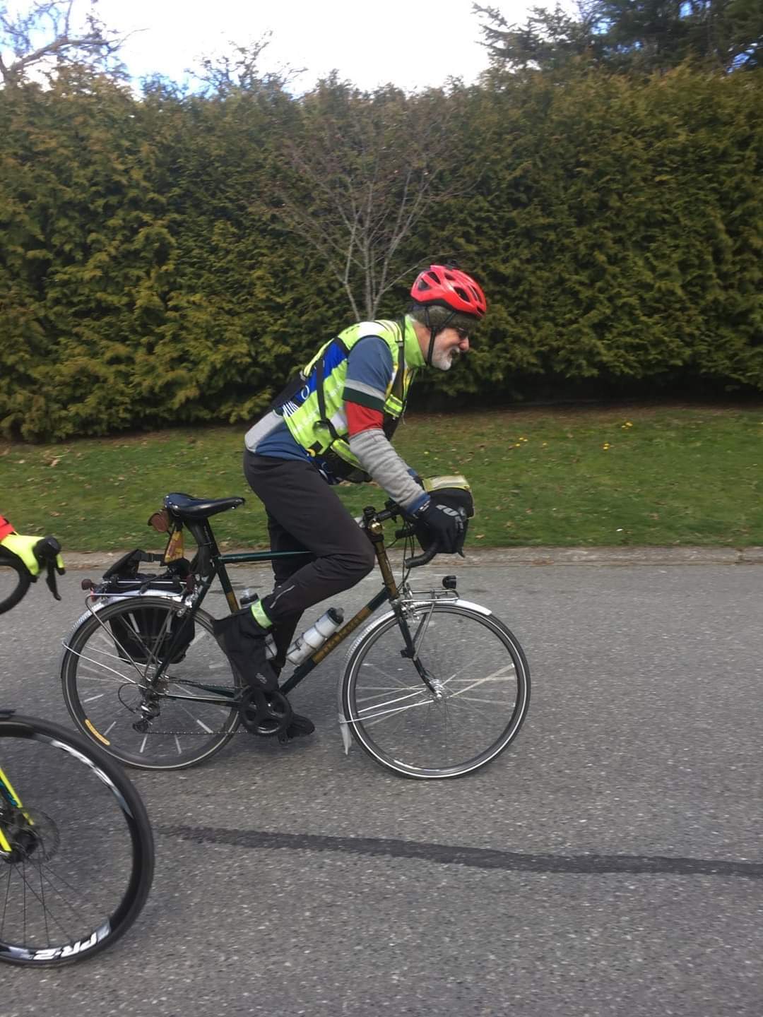 Vancouver Island Early Bird 200 The ride started at 7:01am on the first day of Pacific Daylight Time. Miracle of miracles, all fourteen riders who were doing the actual event were present, even Mikael was there at 6:58 for the "safety speech". The forecast two days before had been for a 97% chance of rain. We had a chat with the forecasters. It was a pleasant 7 degrees Celsius at the start under cloud cover. The cloud cover remained all day and the wind stayed light! There were only a few drops after Ken Bonner arrived at Dave’s house at about 7:50pm. Ken had a leisurely 220. But it wasn’t because of his cycling speed. We hear that he stopped in at home at about the 30 km mark. He engaged in conversation for at least 25 minutes at the secret control at Pat Bay at 91 km. I know he spent some time chatting with us at the Saxe Point control at 151 km. Although he claims to not enjoy the first 200s of the season, the smile on his face at the end told a different story! The route went by Lorraine N’s house. She greeted took photos of as many riders as she could. I know that Ken enjoyed it. At the other end of the speed continuum, Chad and Adam spent very little time stopped. It was a quick control card signature, and they were on there way for a 7:40ish time.