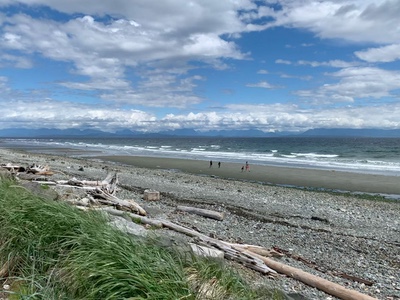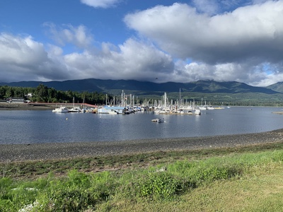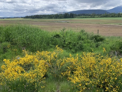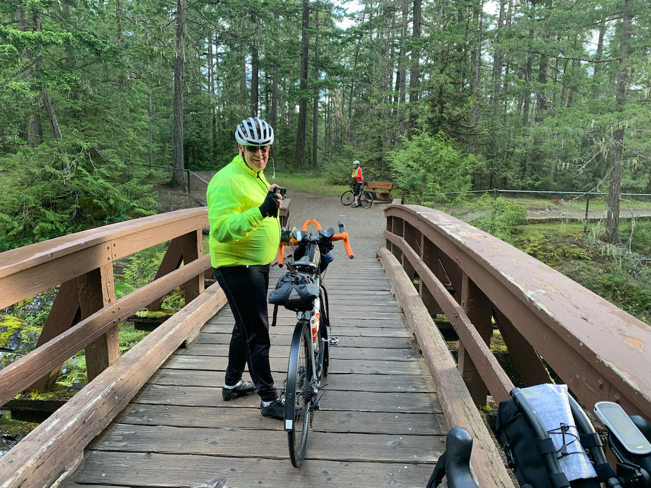 The ride through the Fanny Bay Conservation Area was pleasant at first. The route sheet mentioned sand and gravel and warned of tree roots. No-one mentioned mud! We negotiated the tree roots on a narrow, slippery trail. All I could think about was not wiping out in the mud. I didn'?'t even want to put a foot down for fear of clogging my cleats. Both fears were nearly a reality when I hit a big root that I hadn'?'t seen coming. There was even a section of water to clean our tires as we got to the end. Thankfully, we all stayed upright. We rode around harbours, along beaches, past farms and vineyards, through parks and across many rivers. The wildflowers were in full bloom everywhere we went. The wind picked up and we had mostly tailwinds and cross winds as we headed north. At one point I watched four bald eagles soaring together in the wind while a fifth one watched the proceedings from its perch, high on a tree. By the time we got to Campbell River the wind was howling. I was stretched out on the aerobars, going fast when a blast of wind caught me sideways. I nearly went down. I stayed off the aerobars for a while after that! After the turnaround in Campbell River, there was a long climb and headwinds. I feared the trip south was going to be a slow arduous ride. All one can do is keep one'?'s head down and turn the pedals. Which is what I did. The wind eased a little when I got inland. Despite the headwinds, the Inland Island Highway promised fast riding with easy grades and wide shoulders. There was little to no traffic.