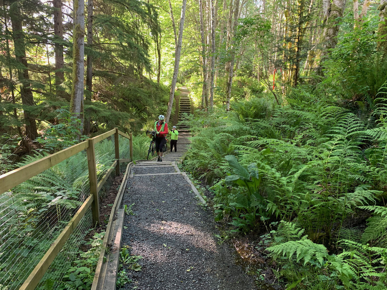 It was a perfect day for a ride. Cool, light wind and dry! The route description promised some interesting riding through parks and across rivers. It also mentioned gravel, stairs and eagles. The first gravel section was fast and easy on a rail grade trail to Coombs. The next gravel section in Little Qualicum River Provincial Park was considerably rougher but manageable. The stairs arrived just before the first control at Deep Bay. I saw the first of many eagles as we approached the control, by a pretty harbour, with the sun shining. It seemed like it was going to be a great day on the bicycle.