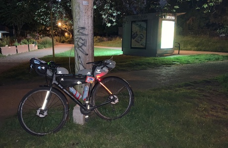 The final climb to the last control of the day had some pitches that seemed very steep. I pushed my bike over one of the steepest sections. In hindsight, I don't believe it was that steep, it was a long day and my legs were done. It was still daylight when I reached my hotel. The Legends Hotel does not allow bicycles in their rooms but they provide a secure bike locker and a lock. I carry a "lunch lock" that weighs about 70 grams but it wouldn't deter a thief with wire cutters. Not having my bike in my room meant that I had to take everything off the bike that I would need for the night. It felt like a waste of time. Time that I would prefer to spend pedalling, eating or sleeping. Dawn arrived too soon. But it arrived anyway and I couldn't let the daylight go to waste. At that hour of the morning, there was nowhere to get breakfast so I brought some instant oatmeal to get me started.