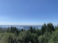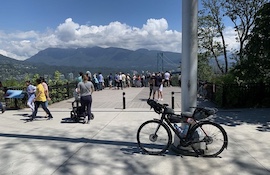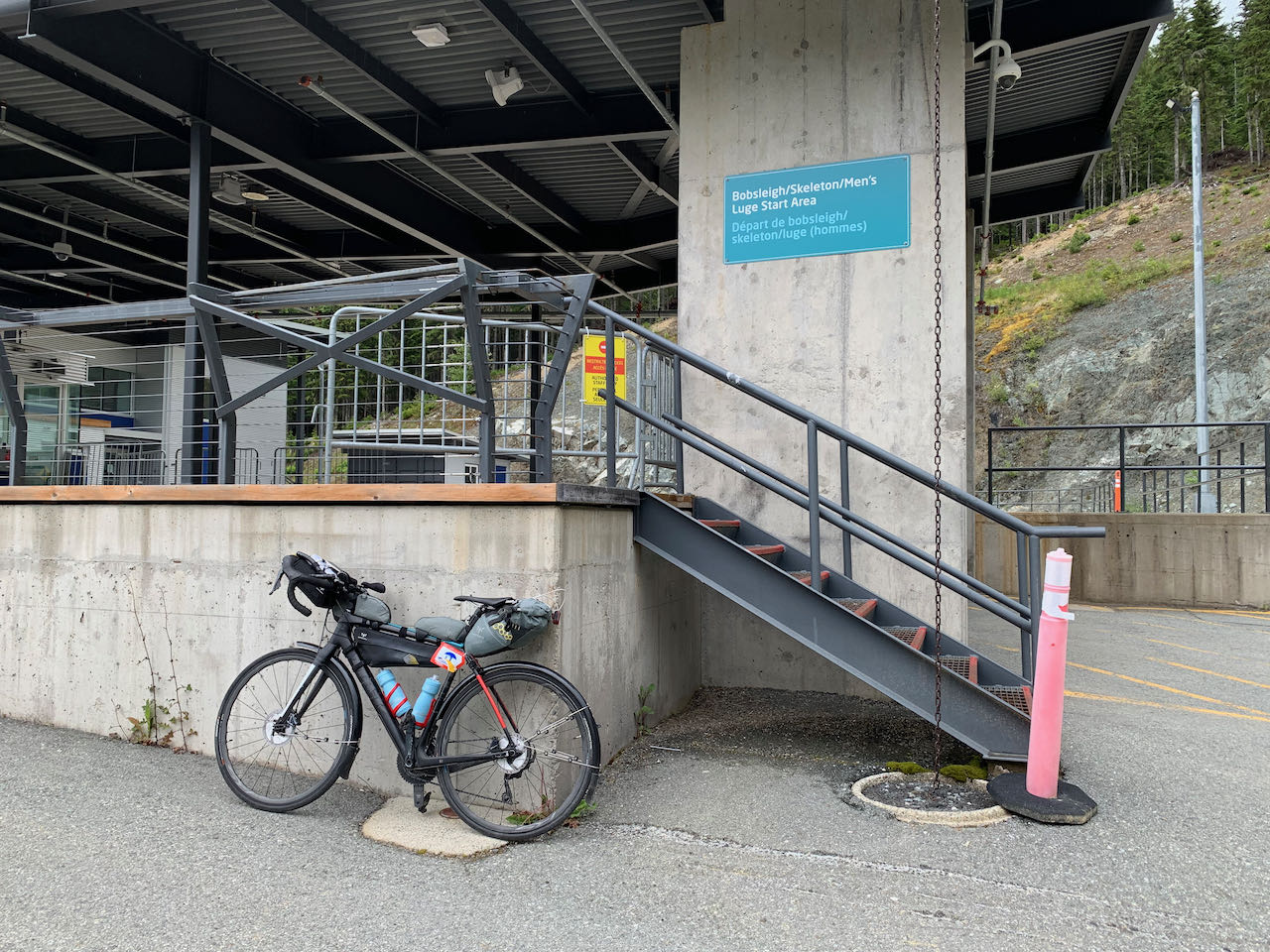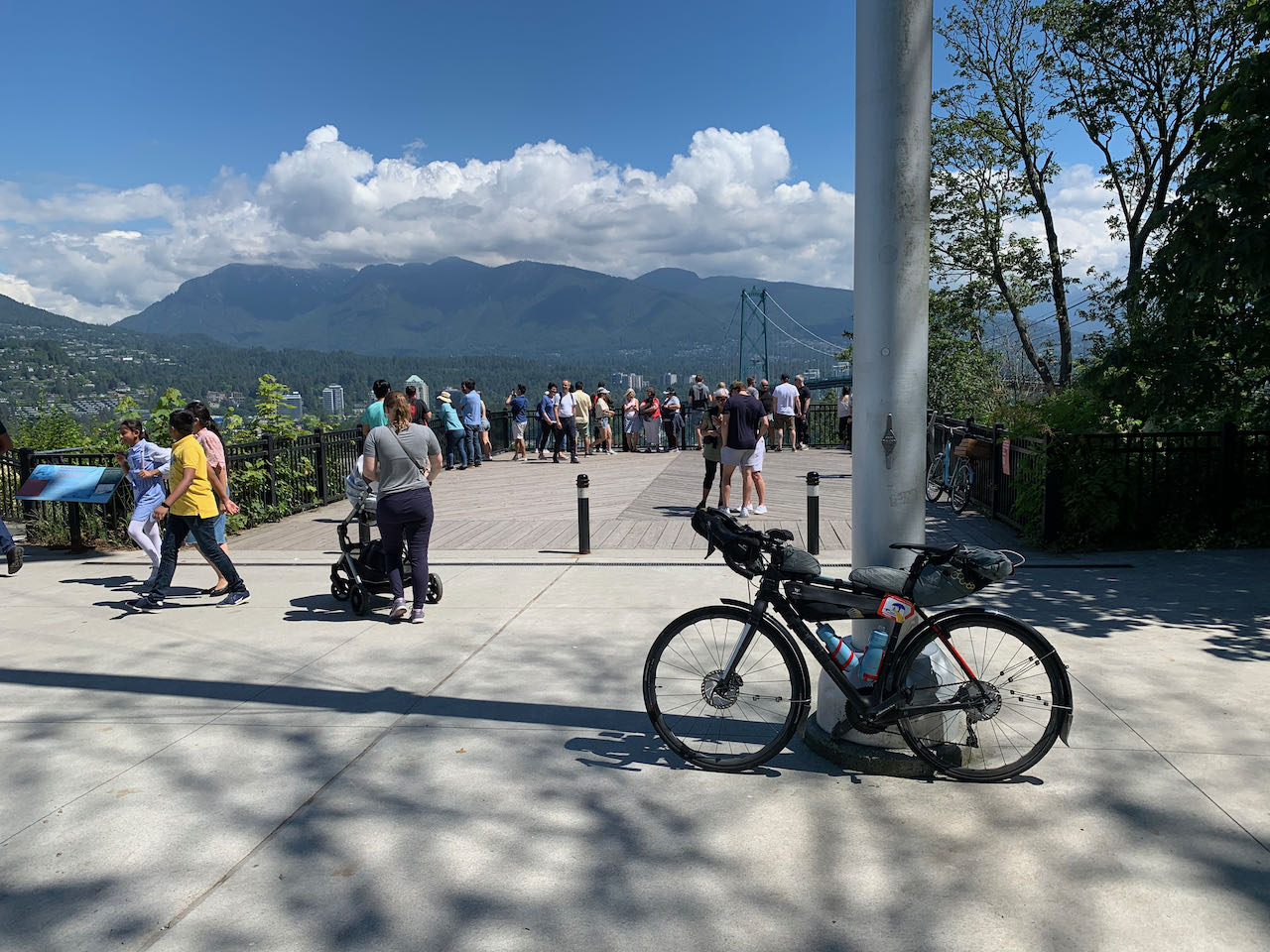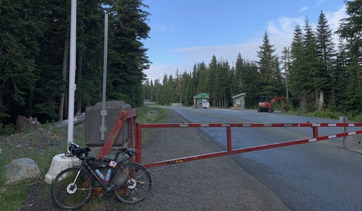 After the dam, the route continued through the forest on the Baden Powell trail. The path was steep, rough gravel. I didn't have the confidence to complete the hill on skinny tires so I got off and pushed. I emerged from the forest onto residential streets high in the hills of North Vancouver. It was pleasant easy riding before the intensity of Cypress Mountain. It was warm and sunny. It was Canada Day. This was it. All I needed to do was get to the top. There were hundreds of cyclists going up and down the mountain. I was the only one with bags. I pride myself on always traveling light but here I was climbing a mountain with everything I needed for a multi-day unsupported ride. I started to think about what I was carrying that I didn't need. Just like Mount Seymour, there were milestone markers giving elevation and distance at each kilometer. The only problem was, I had only a rough idea of how long the road was and what the final elevation would be. I'm an engineer and I often occupy my mind on a difficult ride with mental arithmetic but in this case, I was missing part of the equation. At the end of the first switchback, I stopped at the Cypress Lookout to take a photo of downtown Vancouver and Stanley Park far below. It felt like I had been climbing forever but I was only about one third of the way up.