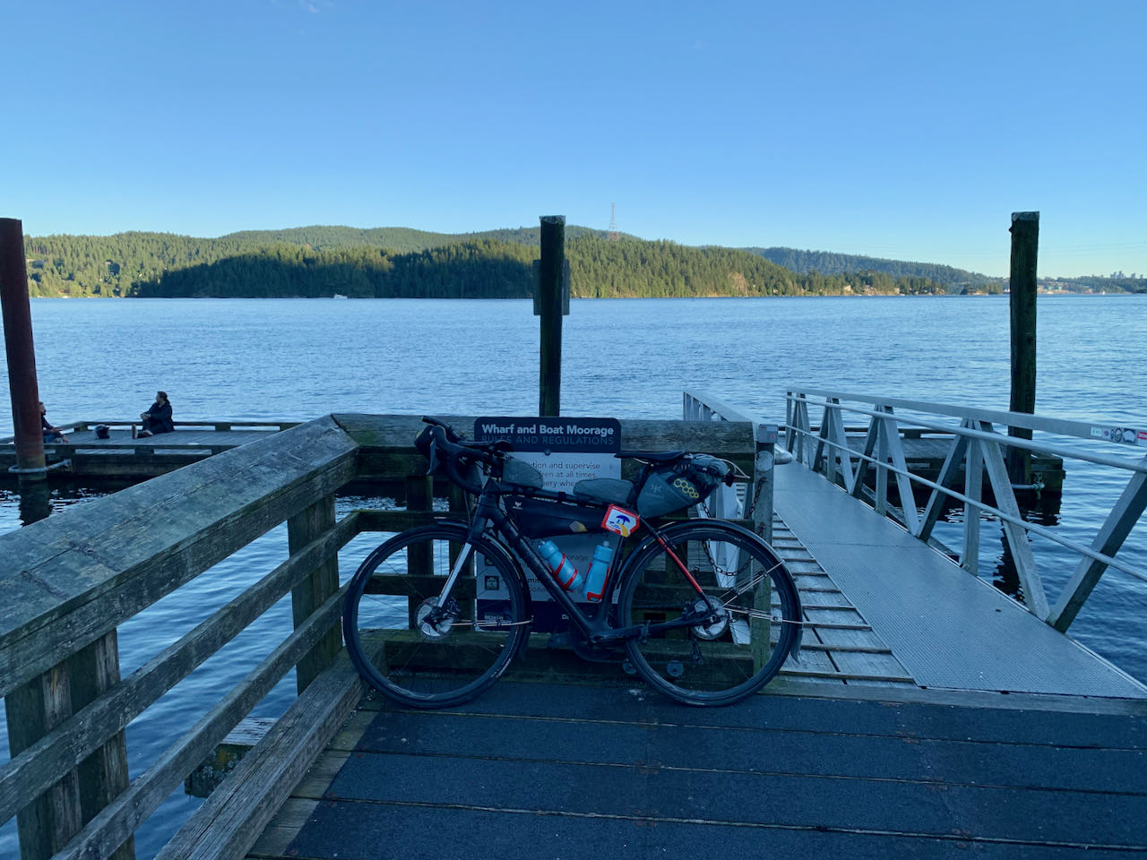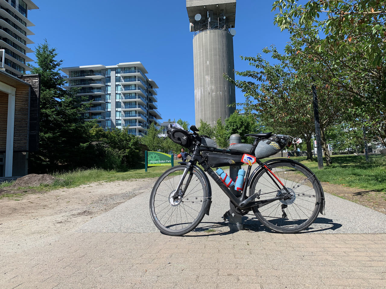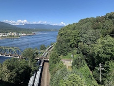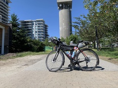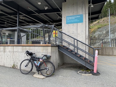 The first climb of the day started at sunrise. As climbs go, it was a fairly easy climb to the Whistler Olympic Centre in the Callaghan Valley. Prior to this ride, I hadn't known that this place existed. Somehow, I thought that the Nordic events were on the trails around Whistler Village. I guess if I had thought about it, I would have realized that there was no stadium or shooting range anywhere along those trails. It was summer and the gates were closed, so I didn't get to see the venue. I descended the valley under blue sky, looking at the rugged peaks of Black Tusk in front of me. I had planned to stop in Squamish for breakfast but I had been eating as I rode down the hill from Whistler. I still had enough water to get to Horseshoe Bay so I pressed on. The southbound ride on the Squamish to Horseshoe Bay section is even more spectacular than the northbound ride. As you pedal south, the Sound widens with channels around various islands like Anvil Island, Gambier Island and Bowen Island. In the distance, I could see the ferries that serve the islands and Sunshine Coast. Horseshoe Bay arrived sooner than I expected. It was warm and sunny when I reached the control. What should have been a lovely photo of my bicycle by the big propeller with ferries in the background ended up being a lovely photo of my bicycle by the big propeller with porta potties in the background. I'm sure the rebuilt park will be nice when it's done. I stopped for an early lunch at Starbucks before climbing back up to Marine Drive. Marine Drive is a fun winding ride past marinas, past gorgeous houses and along the shore of Burrard Inlet. Then it was across the Lion's Gate Bridge and onto Burnaby Mountain. The ride through the city was on bike paths, protected bike lanes, quiet roads and the Central Valley Greenway. It varied from manicured residential streets, parkland, industrial land and the land beneath the elevated SkyTrain tracks.