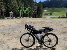 I pedaled and pedaled. Sometimes standing, sometimes sitting. And then I was at the top. I did it! There was nothing left but a long descent to the finish. I lingered at the top, ate some food, drank some water and took the control photo. I stood my bike up by putting a rock under the pedal then took the picture with my bike in the foreground and the Olympic rings and an inuksuk in the background. One of the many cyclists at the top said that it was a cool shot and did the same. As I got ready for the descent, I felt a bit better about the Randonneuring bags I had carried up the mountain. The other cyclists were facing a frigid descent in shorts and tee shirts. I happily put on my long-sleeved jersey, full finger gloves and a windbreaker. I should have taken a picture at the top of 22nd Street. It was like looking down a giant ski jump - a long steep ramp that leveled off towards the bottom. Only this ramp was over a kilometer long. It might have been a fast descent but there were plenty of intersections and stop signs to keep my speed in check.
