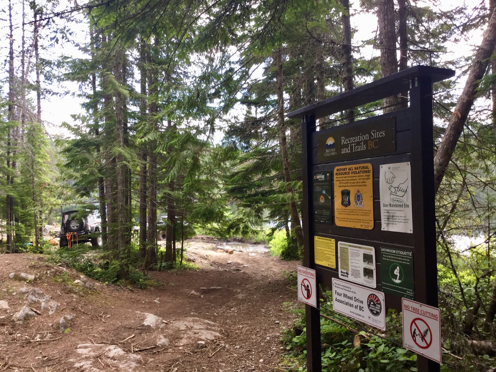 Do you know Hut Lake? It is up the Levette FSR [Forest Service Road] which branches off the Paradise Valley road a couple kms up from the Squamish Valley Road. The Levette FSR is mostly paved the first 1 1/2 km up to Evans Lake, but hits 20% grade in a few places (average is 12%). It's a steep climb. Then there's a pretty good gravel road for another 3 km to Levette Lake. Average grade is lower, but still 20% in a couple of places. Then the road goes another 4 1/2 km to Hut Lake, and this is a steep (though max 15%, thankfully), rough, rocky, 4-wheel-drive road. I was walking. There were a couple of vehicles and campers at Hut Lake. It's amazing where folk will thrash their cars to.