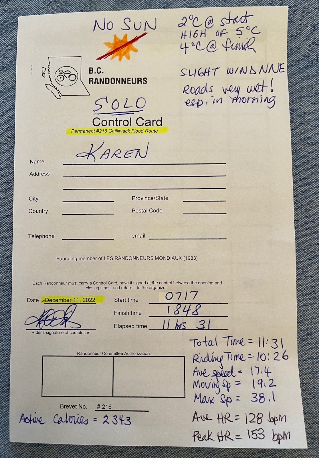 Permanent 216 I have to admit, I wasn't looking forward to riding in December by myself, but I was sure buoyed by your message Eric, saying that you, Mike and Dave were all going to be riding yesterday too. I felt like we were out there together! : ) It was a hard ride for me! Gary is out there riding today. He's got some sun today to help warm things up. I had no sun yesterday. But it looks like he has more wind today! Although the wind seems to have settled down now... It will be fun for me today, because Gary is riding my route and will come to my place for all the controls. It's always interesting to be the one who is NOT riding, and you go about your day, doing different things, and they are still riding...