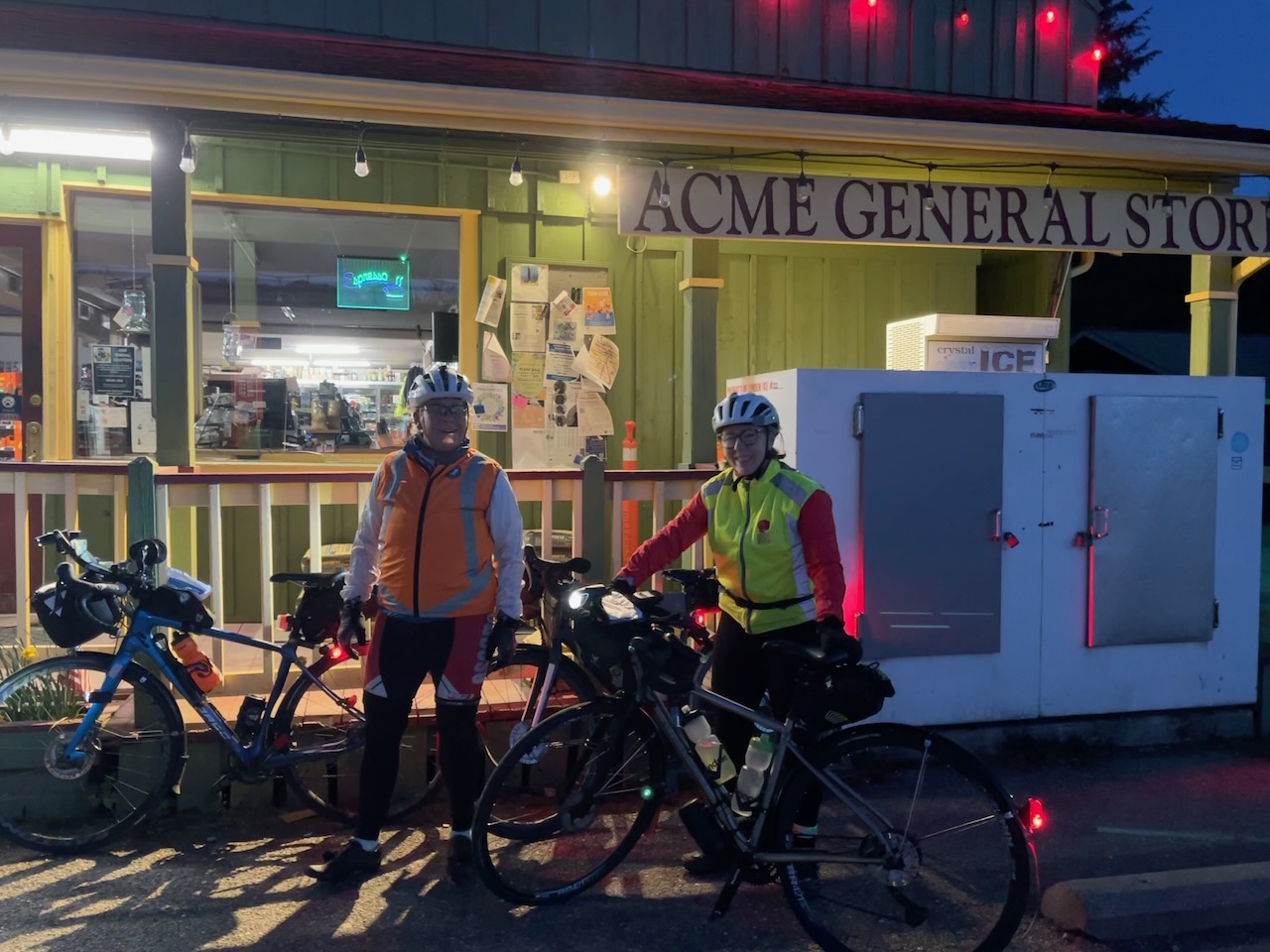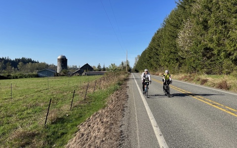 Flèche Pacifique 2023 After a cold, wet spring, the Flèche Pacifique was on the first hot weekend of the year. We rolled out of Harrison Hot Springs at 4:00 PM for the 24-hour ride. Our goal was a relatively civilized 371 km ride. The rules for the Flèche are that you ride as a team on a course of your own design. You can choose your start location but you must finish at, or at least near, Harrison Hot Springs. You must cover at least 360 km in the 24 hours. Napping is okay but you are not allowed to stop anywhere for more than 2 hours. There was a bit of musical chairs with the teams as the ride date approached. Injuries and illness led to last-minute changes because every team must finish with a minimum of 3 riders. The all-female team "Hells Belles" was down to two riders. As a rookie, I was delighted to be invited to ride with two of our most experienced randonneurs. "Hells Belles and a Beau"! The first leg was to Hope and back. We quickly settled into an efficient pace line; we had found our groove. Despite the heat and a long wait in a construction zone, we were making good time. To be fair, the wait probably wasn't that long but we had just started and were more than a bit eager to put some miles in the bank. We rode along the banks of the Fraser River in a narrowing valley with steep slopes rising to snow-capped peaks on both sides. Our highway hugged the north bank with few hills and gentle grades. On the way back to Agassiz we were entertained by a steady stream of freight trains and one long passenger train featuring the distinctive, dare I say, historic, stainless-steel cars that have been traversing the Rockies since the 1950s. We rolled through miles of flat, fast and frequently malodorous farmland from Chilliwack to Abbotsford. Huge dairies, expansive fields of green, rows of greenhouses, grazing cattle and rows of vines all set against the backdrop of mountains, which were becoming silhouettes with the fading light. I love riding at night and who doesn't enjoy a sunset but I don't enjoy nightfall. Is it a primal fear of the pending darkness? We were comfortably ahead of the pace when we stopped for our first break at a Tim Hortons in Abbotsford. Then we made our way to the border by the light of our headlights and a silvery half moon. The formalities at the border were quick. We weren't the first team to go through that night so our story about crossing the border late at night, with a plan to ride through the night, for fun, wasn't as incredulous as it must have sounded. It had stayed warm well past nightfall but now it was getting cool. The stop at the border was a good time to add some warmer layers. We continued through the darkness until we reached the all-night Denny's in Bellingham. Once one decided on the crêpes, the rest of us followed suit and ordered the same thing. The climb out of Bellingham might have been faster if we hadn't just eaten a big meal but we soon found our groove again. Our paceline wasn't as tight during the night, without traffic, we tended to ride two abreast so that we could chat and share stories more easily. We had planned for a short sleep in a post office. The US Postal Service keeps them open all night just in case a Canadian cyclist needs a place to sleep. The post office was lovely and warm. The floor upon which we slept was filthy. Anna and Deirdre used their vests to sleep on. I was wearing just about everything I owned so I slept on my gloves. We hadn't been there long when we could hear someone on the opposite side of the mailboxes. I think he was more surprised than we were when he opened the door that had a bike leaning against it. We thought for sure he was going to tell us to leave but after a lengthy, good-natured chat he left us to sleep. He would wait until after we left at 4:30 AM to start vacuuming. Clearly, he was referring to his side of the mailboxes since the public side did not appear to have been vacuumed...ever. After an hour's rest, it was once again time to start pedalling.