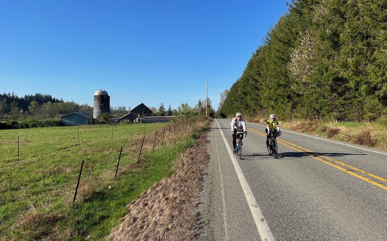 It was very cold outside after a rest in the heated post office. It was 4?C. The forecast was for an overnight low of 10 but fortunately I had, just, enough clothes to manage. It took a while to get my heart rate back up to the point where I was comfortable riding at that temperature. Nonetheless, sunrise was very welcome. Not long after sunrise, we arrived at our turnaround in Sedro-Wooley. We were in plenty of time for breakfast at Bonnie Jo's. The staff was exceptionally friendly and welcoming. The clientele were what you might expect in a rural Washington farming community. Grey hair, long grey beards, overalls and jeans; large men who would have been equally comfortable on a tractor or a motorcycle. We must have been a sight! Two belles and a MAMIL (middle aged man in Lycra). French Toast was the order of the day. On the ride north, we got to see all the things we couldn't on the ride south in the dark. We were still in farm country with a backdrop of mountains, but unlike the Fraser Valley, this was set on gently rolling hills with tree lined roads. At the border, I was the last to be interviewed. The official looked at me with practiced disinterest and said, "Same story?" "Yes," I replied. "Are you bringing anything into the country?" "No." But my inside voice was saying, "Really? Where would I put it?" He turned his disinterest on his computer monitor, tapped hundreds of keystrokes, handed me back my ID and blandly wished me a nice day. It's only a line in the sand but somehow it felt like a victory to be back on our side of it. The finish line just felt that much closer. Not far from the border was our lunch stop at the Birchwood Dairy. It had only been about 75 km since breakfast but lack of sleep was taking its toll, I was really looking forward to the break. We were well ahead of schedule but somehow we couldn't make ourselves sit still. We left the dairy half an hour too soon. The problem with that is the "22-hour" rule. At 22 hours, we were required to stop and note our location. The rule is that we must have at least 25 km left to do when we get to this point. Being half an hour early meant we would be standing at an intersection, in the middle of nowhere, with no shade from the hot sun, while we waited out the half hour.