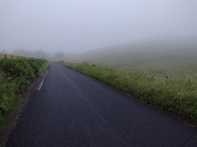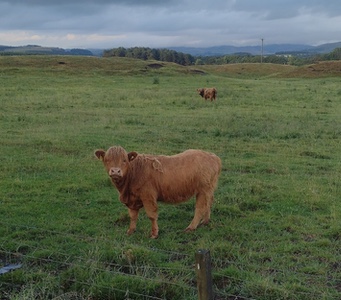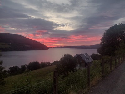 Day three started at 2:30 AM, after a breakfast of cereal and instant coffee. It was as dark as it gets at this time of year- lights not needed to see, just to be seen. Not that there was any traffic. After climbing up and over a forested hump, we were following the shoreline of Loch Ness. There were some delays here, as I had to keep stopping and taking photos of an increasingly spectacular sunrise. I soon caught the group who had left just before me, who had also stopped to take photos. Quiet roads in good condition, with big rollers were the rule through Fort Augustus to the next controle at Fort William. Shortly before Fort William I was caught by one of the faster riders, who drafted me for a while, then pulled in front to take a pull. I soon waved him on, as his pace was a bit too brisk if I expected my legs to last all day. I opted for a gas station sandwich for my second breakfast (cheese and caramelized onion chutney- what did I say about the quality of UK convenience store food?), because I had read good things about the food at the next controle- The Green Welly Cafe in Tyndrum. But first, I had to get there. The eagerly anticipated Glencoe section was every bit as spectacular as expected, and the grade was gentle. Unfortunately, it was now mid-morning, and traffic was awful. Motorhome after motorhome after motorhome, with the occasional exotic supercar such as one might see on an episode of Top Gear. There was NO shoulder, and the edge of the road dropped off into a deep rain rut- no moving over possible. Drivers were good, though, waiting in a long line until it was safe to pass. Nearing the top, there was a crosswind that I estimated to be in the range of 40 to 60 kph. Very treacherous riding, as I was braced against the crosswind, but each time a motorhome or tour bus passed me, there was a vacuum which threatened to spit me into traffic. I could see it blowing black, stormy clouds in my direction, but there was nowhere to get out of it, or even to stop safely to put on rain gear. Finally there was a a roadside pullout, with a tour bus and a (closed) food truck. I took shelter on the leeward side of the food truck to put on jacket and rain legs. Trying to put on the jacket without some kind of shelter would not have been possible. The temperature dropped 10 degrees on a very few minutes, and within half a kilometre of donning the wet weather gear it was gushing down. I expected it to start hailing, but thankfully it did not. The Green Welly was full of dripping cyclists. I warmed up with a good coffee and a hot macaroni and cheese pie and was on my way towards Carnwrath. The rain stopped, and it became uncomfortably hot. The Co-Op in Carnwrath provided what I needed, but was in a busy shopping centre, and was the only stop of the ride where I felt the need to lock my bike while going inside. We turned onto less trafficked, less hilly rural roads closer to Stirling, which was pleasant. There were several flattened badgers and hedgehogs, but still no haggis. What was NOT pleasant was the young asshole who pulled up as close as possible on my right side, so that his equally young passenger could spit on me out the window of the car. I have had all kinds of different projectiles thrown at me over the years, but this was a first. Most UK drivers respect- or at least tolerate- cyclists, but it seems that those that hate us, REALLY hate us. I found another Greggs in Stirling for my controle, which greatly improved my foul mood. The route sheet says it is only 88 km from Stirling to Abington. I find that hard to believe. There was a long, long section of residential area which somehow seemed to be all uphill. On a moderate section- maybe 12% or so, an elderly man and woman were standing in their front garden (wearing their requisite wellies). “ Och! Yer diggin deep noo!”, he said. I should have replied “Nae, tis but a wee bump”, but I only managed “Aye”. Onward and upward into a forest of windmills- so close, and making big moving shadows in the evening sunlight that I somehow found a little unsettling. Getting close to Abington, I spotted the first Highland cow I had seen, so naturally I had to stop while she posed for my photo. Into Abington well before dark, for a welcome shower and a comfortable bed. Day three numbers: 344.9 km, 3226m vertical, 20.4 kmh moving average, Temp 11C-26C