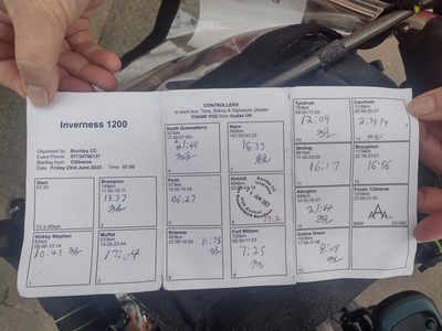 Hills, Heather and Haggis When asked, (ok, sometimes without being asked) I was telling people that I was not going to ride PBP 2023 because I had had such good rides in 2015 and 2019 that it could not be improved upon, and that I believed I had experienced most of what PBP has to offer. At least the positive experiences. I wanted to do something different. I carefully watched the website for the Inverness 1200, wanting to jump right on it as soon as registration opened up- after all, there was a limit of 100 riders, and in the event that I was unable to go, the loss of the 58GBP entry fee would not be huge. Done. Next, sort out the details. I found a nice little Victorian townhouse for the week, only 300 metres from the start (and also 300 metres from practically everything else in Clitheroe). The mid point overnight was provided in Kirkhill, just past Inverness. I booked a room in Kinross, at about 350 km for the first night, and one at Abington, at 946 km for the third night. Spring training consisted of making sure all of my training rides had at least 100 m vertical for every 10 km of distance. Our spring brevets did not achieve this, so I compensated by riding as fast as I possibly could until I imploded (AKA trying to ride with Jocelyn). Recalling my LEL 2017 ride, and all of the time that I lost while lost, my biggest fear was navigation, so I bought a second GPS unit- a Garmin E-Trex 22x, to supplement my sometimes temperamental Edge Touring Plus. The E-Trex only gives a bread crumb trail, but has the advantage of using AA batteries- one less thing to keep charged. My Edge Touring gets stupid and loses the route if the route crosses itself or has any out and back sections, a problem I solved for this ride by breaking the GPX file into four chunks- one for each day, Ride strategy- Do all (or as much as possible) of the ride in daylight, keep a sustainable pace while getting as much sleep as possible and staying at least an hour ahead of the time cut. Three days to go- Once again, Bud Macrae kindly let us leave our car at his house in Kamloops and drove us to the airport at 4:30 AM. All went well- for the first time, they wanted to charge my Ritchey Breakaway as a bike, but in the end it went through as luggage. Problem #1- By the time we landed in Vancouver, our connection the Toronto was cancelled. We were moved to a flight to Saskatoon, which would connect to Toronto, but it required a high speed run through the airport to catch it. Sorted. Sort of. Problem #2- We landed in Saskatoon to find that our connection to Toronto would arrive too late for our flight to Manchester. There was an earlier flight, which was delayed, and just happened to have two available seats- if we hurried. Sorted. We landed in Toronto with plenty of time to catch our Manchester flight, but knew there was no way in hell my bike and riding gear had made the connections. Watching the luggage carousel in Manchester confirmed this. We registered the missing bags, and hoped for the best. What would I do if it didn't arrive? Try to scrounge a bike and gear, or just consider it a non-cycling holiday? Problem #3- The route sheet did not arrive in my E-mail until after we had left home, but we were able to find a local office supply place to print it. The route sheet was all but useless to me- the abbreviations were relatively easy to decipher, but the only distances on it were the distance intervals to ride on each road – no cumulative distances. If I had had it before leaving home, I would have typed it into our route sheet template and had something useful. Oh well. Thankfully, the bike and gear arrived by courier, giving me the following day to assemble it, test ride, and relax a bit. The silver lining was that I hadn't had to drag the bike bag and my huge duffle bag on and off buses and trains between Manchester and Clitheroe. The bike had arrived relatively unscathed- a broken tail light mount, scuffed paint on the forks, and damaged bar tape, all of which were my fault for not padding it sufficiently. The broken travel case was not my fault, and Air Canada has paid my claim. Somehow it just seemed right assembling it in the back garden, listening to Beatles music coming over the wall from the neighbours. A short test ride told me all was well, and that the weather was hotter than I would like.