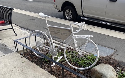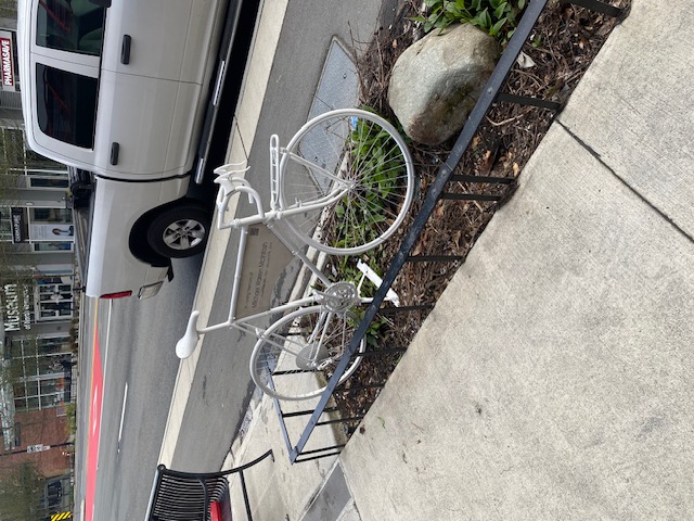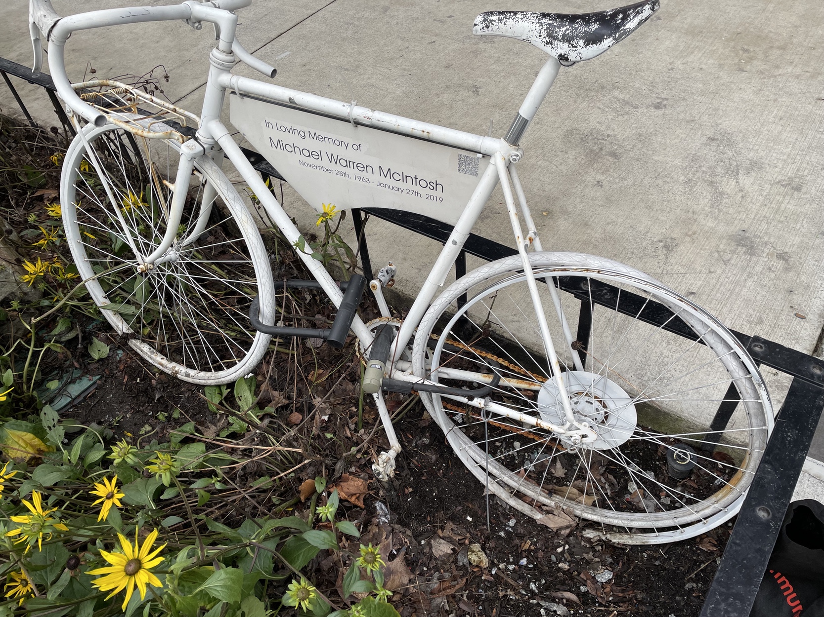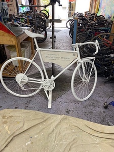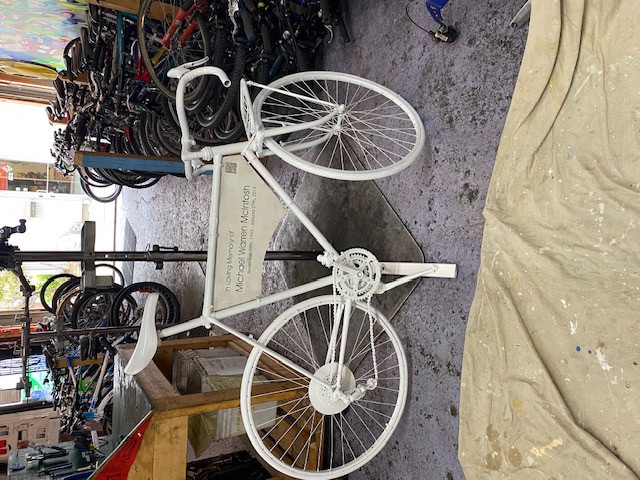 ![]() Before... Photo: Doug Ausman Mike McIntosh Bike Restored In February North Shore/Lonsdale super citizen Doug Ausman observed that the Mike McIntosh "ghost bike" on Esplanade had reached an advanced state of disrepair. He scanned the QR code on the dedication plate on the bike and found some mention of BC Randonneurs. He contacted our Pres. Dug Andrusiek and said in frank terms that the bike had become an eye sore and would likely be removed as trash if something wasn't done. Photo above. An interesting point offered by Ausman was that the bike had received gentle handling during the construction of the reimagined bike and pedestrian infrastructure along Esplanade where Mike had lost his life five years ago. We've learned also that credit should go to the City of N. Vancouver’s Bylaw Enforcement Department. The memorial bike technically does not conform to City bylaws, and the City would have been within the law to remove the bike and to ticket those who placed it on Esplanade. So the Bylaw Enforcement Department should be credited for showing patience and compassion in not taking action. There was a sense that the bike was important, but would need some serious attention if it was going to remain. ![]() ... after, at Quick Stand Photo: Dave Somerford We knew that the creative work of assembling the ghost bike had been done at Kickstand Community Bike Shop in East Van where Mike had been a volunteer. Pres. Dug reached out. Ali Henderson at Quickstand got back to Dug and then passed the file along to fellow volunteer Dave Somerford. Dave took on the challenge of restoring the bike, with significant contributions from Thomas King and Hubert Leung. In the process we also learned that the origial creator of the ghost bike was Ari Ng. A few months later the bike is once again a thing of beauty and back nestled amongst the foliage in the gardens running along Esplanade above Lonsdale Quay. ![]() ...after, back on Esplanade Photo: Dave Somerford