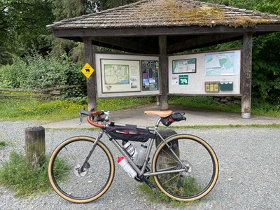 ![]() Derby Reach All Photos: Patrick Jackman (The photos do not necessarily correspond to the adjacent text) LM ACP Centenary 300 Patrick had the idea of riding the LM ACP Centenary 300 as a permanent. (Now available as P#242.) After the ride he wrote in with a detailed report that he had not intended for the newsletter. I said other riders will enjoy this. He said putting it the newsletter would be ok with him. Here it is... [EF] You may notice my leisurely start. In fact I failed the math on what time to set on my alarm. It should have been an hour earlier. Then, as I was rolling my bike out the door, though I had checked both the night before, I discovered the back tire was flat. On to the work stand goes the bike, pull the wheel, extract the tube, plunge it into the sink and …, I can’t find the leak! Turns out the valve core was loose and its 70 mm end was well out of the shallow water. Rene Herse has recently posted a recommendation to check the cores of their new TPS tubes when installing. I won’t make that mistake again. Tighten and reinstall then we depart again, now an hour and a half behind schedule. Regarding the route out, there is no longer a blue fence in front of the house at Derby Reach Park. So no Tel No. to report. There is a photo though. ![]() Also Derby Reach I ran into a few complications on the return route: 1. Colbrook Road from King George Boulevard was closed to allow filming of a stunt scene for a movie. No amount of pleading for passage was successful. The road crew directed me to their detour which involved climbing KGB and taking Highway 10 westbound. So I headed in that direction but stopped to check how far the Colebrook Frontage Road went, on the other side of the tracks, and decided it was worth a gamble. I could see a massive drone hovering above about mid way down the road suggesting where the action was. At the end of my road I carried my bike over the two rail lines and after a few tense minutes with a person monitoring the outlet of trails, while she consulted with onsite police and other folks via radio, they thankfully came to the conclusion that I wouldn’t get run over if I continued on from there. It was a lucky break because 131a Street, though it appeared on the map to be a possible route from Frontage to Mud Bay Park, would have been a serious bushwhack if even possible. I lost 25 minutes here but Hwy 10 might have been even longer and very unpleasant at that time of night. 2. Hornsby Drive, alongside Hwy 99, had a barricade and only Authorized Vehicles were allowed. I took another chance and the road was fine including a gravel section where there was no longer a road. Tons of heavy equipment but no security so I was twice lucky. Looking back as I crested the ramp at 96 Street I saw a sign that read Closed To Cyclists. No time lost on that section. ![]() Birchwood Dairy 3. Tim Hortons has changed their front door decor but the gentleman behind counter assured me they are open 24 hours a day and coffee is always available. 4. Oak Street, south of West Kent Ave presented another barricade, this one manned by a stern fellow who didn’t appreciate having to leave his car to inform me that West 77th Ave was closed due to the impending collapse on an overhead conveyor belt structure. I don’t lose much time there as my usual route to the Arbutus Greenway intersected the formal route at Hudson. 5. Breka Bakery at 11:30 pm has boisterous lineups that take what feels like an eternity when you’re tired, sweaty and just want a signature and a timestamp. ![]() Cheam Centre Mission accomplished. Now I know I can manage a 300. I was surprised at 7:30 am when my Wahoo Bolt v2 said there wasn’t enough memory to load turn-by-turn instructions for the route. Not wanting to miss any turns meant constantly checking the tiny GPS map. I know that I’m unlikely to get much sympathy from old timers who carried paper maps and cue sheets back in the day. I used topo maps when I guided canoeing trips with Outward Bound in the 80’s and while skiing BC’s backcountry in the 90’s but I now want to trade in my old Garmin 60CSx for a modern bike navigator. ![]() Boundary Bay