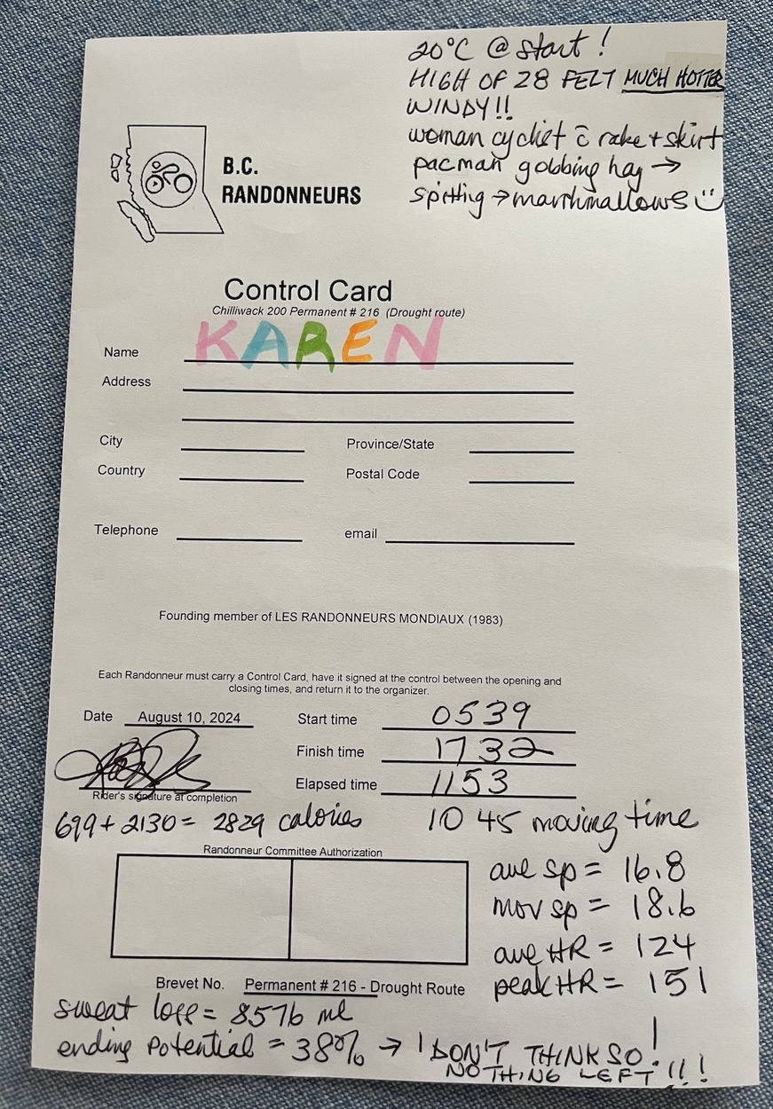 Two interesting images stayed with me from my ride: Then on the Sumas Prairie, I saw a cute little farm vehicle that was gobbling up the freshly cut hay in the fields (Pac-man style). Then it spit out large round bales wrapped in white plastic (which to me always look like giant marshmallows in the fields). It only reached 28 degrees, but felt so much hotter. I had no flats or mechanicals. My Garmin said I had 38% remaining potential. I don’t think so! I had nothing left... : ) Karen