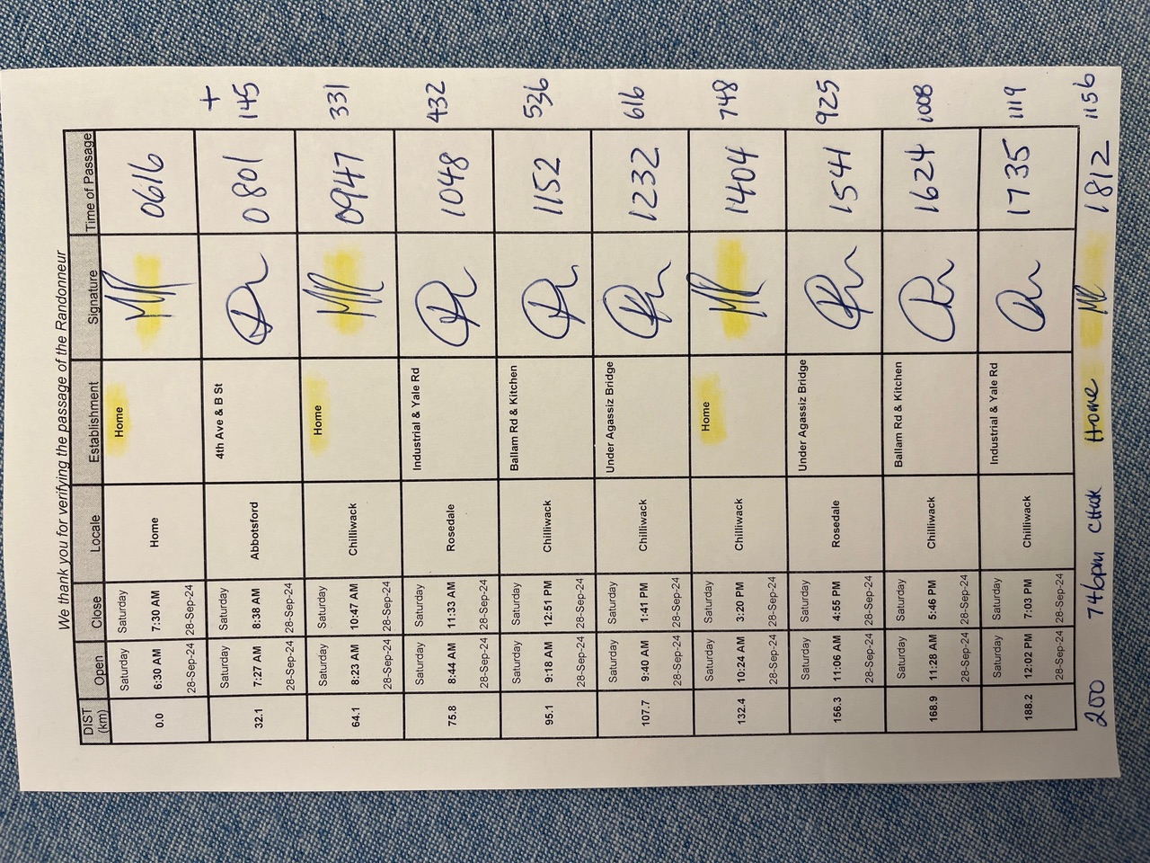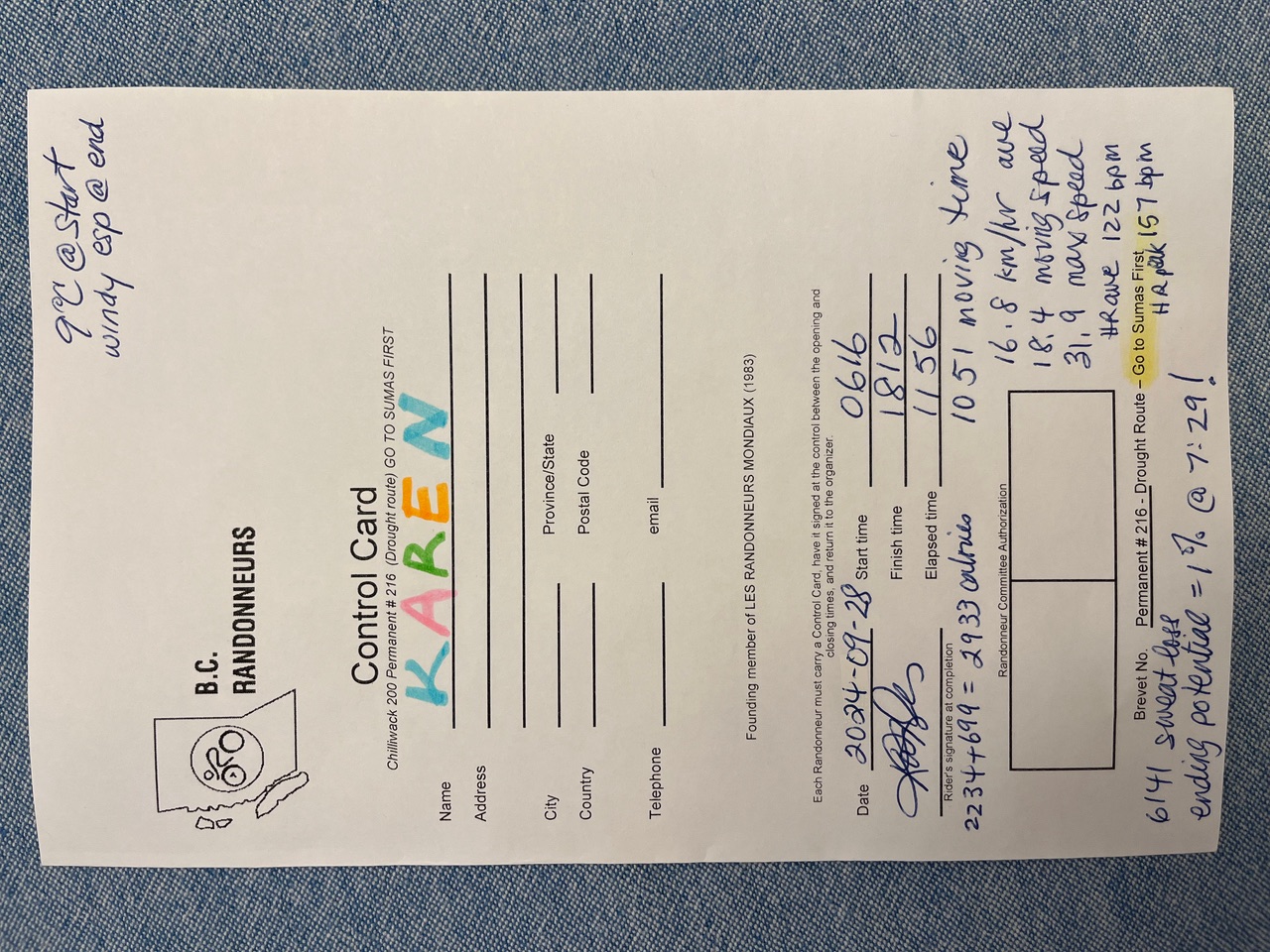 Sept done! What a gorgeous fall day! Perfect for a 200! : ) But I had told myself that I wouldn't ride Vedder Mountain Rd again on a Saturday, especially on a long weekend, and here I was.... I shuffled the order of my ride so I could ride Vedder Mtn Rd first and get it over with before traffic really picked up. But it was already busy! Once I got into Yarrow, I decided to count the cars that were on the road with me. I counted vehicles travelling in both directions, as long as they were with me on the road. -> Yarrow to Birchwood Dairy (16 km): just 11 vehicles -> Birchwood to Sumas turnaround (7 km): 12 vehicles -> Sumas to Birchwood (7 km): 17 vehicles -> Through Yarrow (2 km); 55 vehicles! -> Vedder Mountain Rd (6 km): 200 vehicles! Starting on Ballam Rd, along the Fraser River, there were a lot of large trucks on the road, and a lot of crap on both the roads and in the air. I soon figured out that the farmers were cutting down their corn stalks and mulching it all up. Even with glasses on, I kept getting debris in my eyes... I had no flats or mechanicals. : ) According to my Garmin, at 7.5 hrs, I had 1% remaining potential. And I had another 4.5 hrs to go.... uggh! I struggled in the wind at the end ... Karen