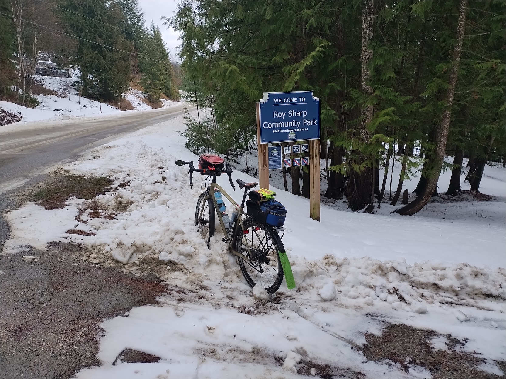 Shuswap Shorelines I had not really planned to ride it Thursday, but when I got up there was barely a trace of new snow and the forecast was dry for the rest of the day. After a mad scramble to get organized I got on the road by 7:30. Ran into icy slush in a few places so I was glad I had the studded tires on, but they sure are exhausting to ride. It turned into quite a nice day- no precipitation, about +6C, and even a few minutes of sunshine. Total time 9:46.