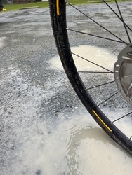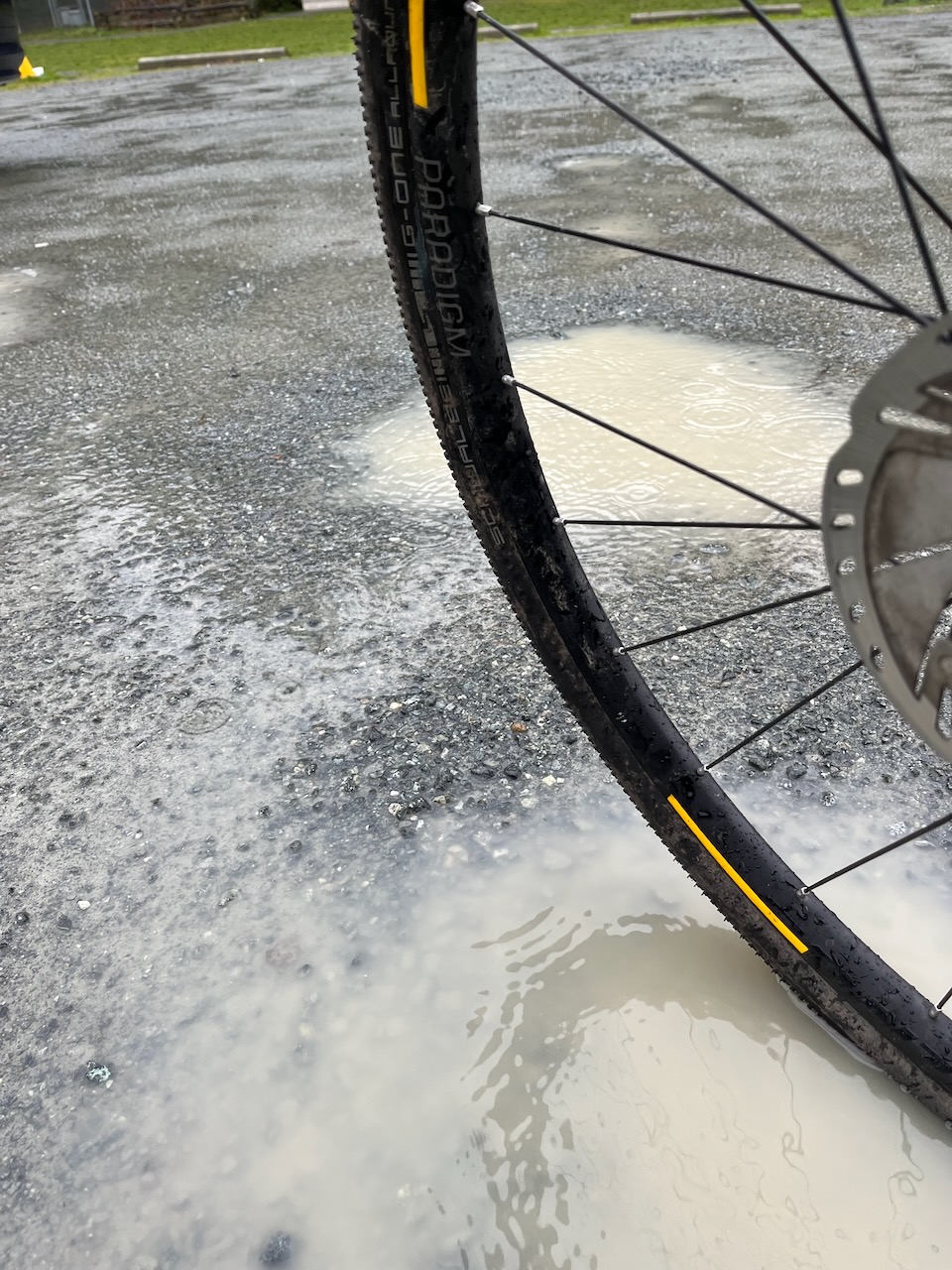 My lower tire pressure made a huge difference. I could stand on the pedals without losing traction and was able to tackle the descents with more confidence. I watched Nick ride through a puddle in front on me. It was deep. His bike was bouncing and wabbling as he pedalled through the rocky pool. What could I do? I wasn’t going to wade through the puddle so I bounced and wabbled my way through it and tried not to think about what would happen if lost my balance on an unseen rock. We emerged onto Hartland Avenue for a roaring descent to the Interurban Rail Trail. Up to this point, the rain hadn’t really bothered us but now the rain hurt. Each droplet stung as it exploded on my face. But I couldn’t slow down, the thrill of the descent was too great. From here on, the gravel sections were straight and flat but the course designer needed to ensure that our legs did not receive a break. It started with the climb up Durance Road from Wallace Drive to West Saanich Road and then the steep climb up Verling Avenue to Oldfield Road. There is a section where the grade is around 15%. And when we finished those climbs, we were rewarded with a headwind as we rode south. We had one last series of climbs through Royal Oak. After that, an easy spin back to the start on the shore of Beaver Lake. It was still raining, I was filthy, but we were smiling.