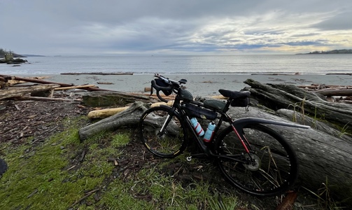 Spring Grando—Beaches & Stream The course was very much as described in the pre-ride notes—except for the rain. No-one said anything about rain. I arrived at the start 20 minutes early. It was raining. It was miserable enough that only half the registered riders showed up to ride. I decided to stay in the car, where it was warm and dry, until the last minute. Not surprisingly, the last minute arrived and we set of into the gloom for a day of gravel riding. “The first 62km are relatively gentle, with some intermixed road and gravel sections.” We eased into the gravel with a gentle ride through the Horticultural Centre of the Pacific and then the Colquitz River Trail. When we weren’t on bike paths and trails, the route took us down quiet residential streets. Peaceful, wet, riding. It’s spring in Victoria. Flowers like crocuses, daffodils, snow-in-summer and cherry blossoms were helping to brighten the gloom. Everywhere, the grass was a lush green blanket. Our first control was on the shore of Portage Inlet. It was still raining but the sky looked like it was clearing. I opted to keep my control card dry and took a picture of the signpost to mark my time of passage. There were four of us at the start but we had separated by this point. Nick and I were riding at a similar pace so we mostly stuck together through the remainder of the ride. We followed the Galloping Goose to Royal Roads University. We rode through the dark forest under grey clouds before descending to the open ground below the stately Hatley Castle. Our control was on the shore of the Esquimalt Lagoon. The rain stopped and the sky was getting brighter. It looked like it might clear up. (Spoiler alert: it didn’t.) Time for a banana and a photo, then back on the bike. From the Esquimalt Lagoon, all roads go in one direction—up.
