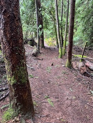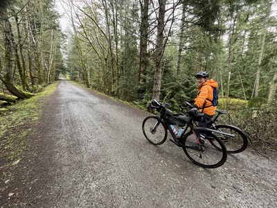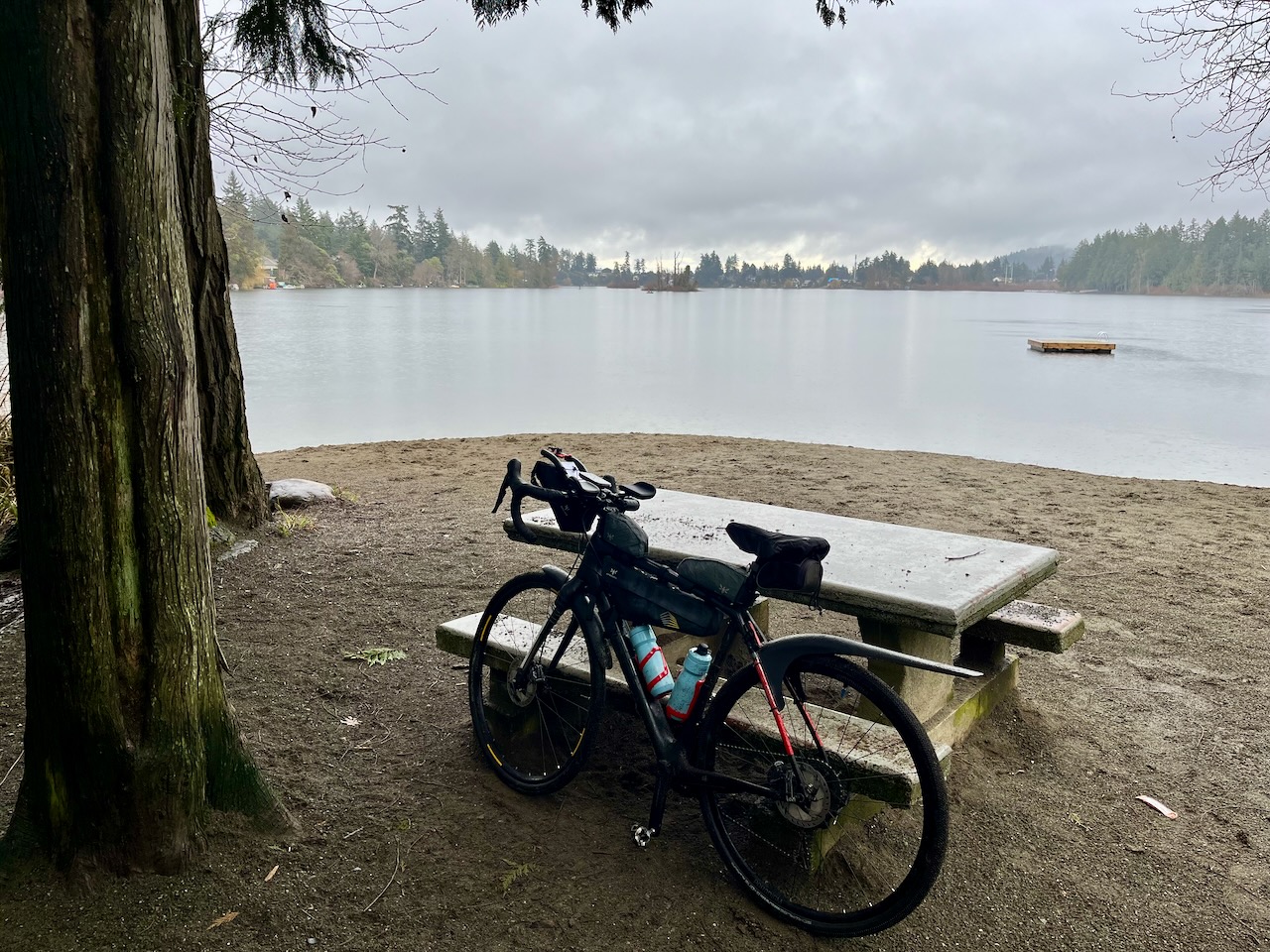 We rode some of the new bike paths in Royal Bay before ending up on Metchosin Road. We had a 10k section on Metchosin Road, past fields, farms and the golf course. Traffic and the rain were both light. We were able to make up some time on smooth roads. We soon arrived at the Weirs Beach control near William Head. A short gravel trail near Pearson College put us back on the Galloping Goose to Langford. It took me some time to recognize that we were on the familiar Galloping Goose Trail. The rain had returned but it was not raining hard so it wasn’t much of a concern. We left the Goose at Glen Lake and pedalled towards the Humpback Reservoir. Along the way, we followed trails and bike path and went through a covered bridge. We looped around Langford Lake and stopped at a beach at the NW end of the lake for the control. There was a steady a series of lakes that I could not have named or even knew existed. We passed Florence Lake, Lake Ida Ann and more as the day wore on. “After that the gravel gets a bit more "gravely". Expect to spend over an hour to conquer the next 15km.” The “next 15km” started with Thetis Lake Regional Park. The gravel was indeed more challenging. I was happy to let Nick take the lead through most of this. He is a much better gravel rider than me so I could follow his line on the hills.