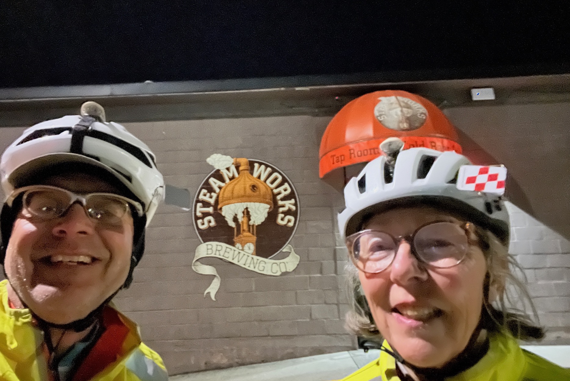 The Tale of the Randonneurs vs. the Evil Blackberry Briar Yes, for Colin and me, it was the tale of the randonneurs and the evil blackberry briar (our own fault). It happened trying to get around the fence that is blocking the entrance to the Mud Bay Dyke Trail. The others picked up their bikes and hiked just a short way. Instead Colin took an old broken up trail thinking that it would lead back to the trail that we wanted. Colin is always very sensible (isn't he?) so I followed him... deeper and deeper into the blackberry briar that swallows randonneurs and their bikes whole. We couldn't get out. We ended up clambering up onto the highway but we couldn't get off it. So we backtracked. Colin had to help me haul my bike down the embankment off the highway then we rode and carried our bikes through all the blackberries to the start of the trail. At least 45 minutes had passed already. Oh well, a little bit of cyclocross. I have always wanted to try that but not on a rando ride. Colin had flats front and rear. We managed to get all the embedded thorns out and fix the flats - a minor miracle wouldn't you say? It was still light so it was a bit easier to see the thorns. We noticed that we could pick up the fence and move it just a bit to squeeze our bikes and ourselves through. Why didn't we notice that before? Off we went down the Mud Bay Dyke Trail. After about 10km I hit something hard. You guessed it, pinch flat in the pitch dark! Colin had another flat on the Freeway Trail - no time to fix, just pump. More pumping on Gilmore Ave and we finally made it to the finish at 1:52, just in time. We took a selfie to prove that we were actually there on time. It was an adventure and we were delighted with ourselves for finishing!