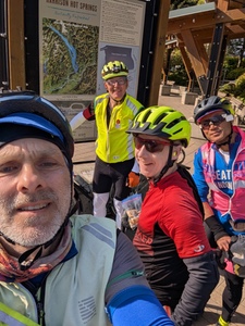 Weakened Warriors 2025 Earlier this spring I contacted Paul, Dave and Russel to let them know I was not interested in doing our usual route into Washington this year. They agreed, and Paul put together a route for us covering much of the Lower Mainland, with a stop for breakfast at Russel's house at roughly the midpoint. We delayed our start to 7:00 PM because Dave had to work on Friday. Then, Russel had to bow out because of dental surgery just before the ride, but offered to make breakfast for us anyway. We had a new face on the team this year, Thai Nguyen from the Seattle Randonneurs. All went well for a couple of blocks. Then Dave discovered he had left his rain jacket behind. It was aa good thing he went back for it, considering what was to come. Back on the road again, we were about 60 km in, very windy, but not yet raining, a vehicle pulled up beside and said a cyclist back there was having troubles. We had not noticed we had lost Thai. About a kilometre back, there he was, looking for his dropped control card in the ditch. He had seen it blow away in the wind from a passing truck, and the with the persistent South wind, it could have gone anywhere. Luckily somehow we found it in the dark, and were underway again. It started to drizzle as we climbed the Vye Rd. hill, so we took advantage of the lighting at a gas station to put on rain gear. By the time we left there it was pouring. Despite the rain, it was a pleasant enough ride through the night. We ventured a bit off route to a 24 hour A&W, and spent quite a bit of time there eating and waiting for the rain to stop, or at least ease up. It did not. We were cold when we left, but it didn't take long to warm back up. Our next challenge was when we found Burns Drive closed for construction. Looking at the map now, I can see how easy it would have been to backtrack and bypass it, but we foolishly decided to go through. Lots of mud and gravel, some rideable, some not, but we made it through to the other side in one piece. Eventually, the rain stopped and daylight arrived. We arrived at Russel's house at about 6 Am. He had prepared an outstanding feast for us: french toast, blueberry pancakes, bacon, fruit, and really good coffee. I had a dry set of clothes and changed into them. Dave put his in the dryer. By the time we were done, Russel had cleaned and lubed our chains for us. Wow! It was now a beautiful morning and met hundreds of cyclists on Marine Drive. Once we were headed east again, we had a nice tailwind. We had an unplanned detour when we found the road closed at the Ruskin Dam, but it didn't change anything that mattered. At Mission we met a young touring rider named Stephen who asked if he could ride with us for a while- which was fine with us. Eventually he dropped off the back We also met someone we had managed to offend in some way, and once he was done with his rant, we continued with our wonderful tailwind. At Deroche, the Lougheed Hwy bridge was closed due to an accident. It had been closed for hours, and it looked like it would be for several more. We had less than no desire to backtrack to Mission in what would be a horrible headwind. We did remember a road we had used several years ago: a mix of pavement and gravel, that would bypass the closure and take us to Lake Errock. Stephen rejoined us as we were sorting it out. After much riding back and forth, up and down and asking locals (who gave us unhelpful information), we determined we had got the wrong road. The one we wanted was 500m further east. After a fun mixed surface ride we were back on the Lougheed, still with a tailwind, but now with no traffic due to the closure. Having lost a bunch of time, our anticipated rest stop at our 22 hour control in Harrison Hot Springs did not happen. We signed our cards and headed for the finish, a shower and a great meal at the finish hotel. Another great Fleche done! Already looking forward to next year. Hopefully Russel will join us. One of the things I love about the Fleche is the fact that the team stays together. For that reason it is important to have riders with compatible speeds. We knew Paul, Dave and I worked well together, and Thai proved to be a perfect fit. We all took turns being the slow one of the group. Having the team is also great when faced with things like miserable weather, mechanical issues (we had none this year), or unexpected detours.
